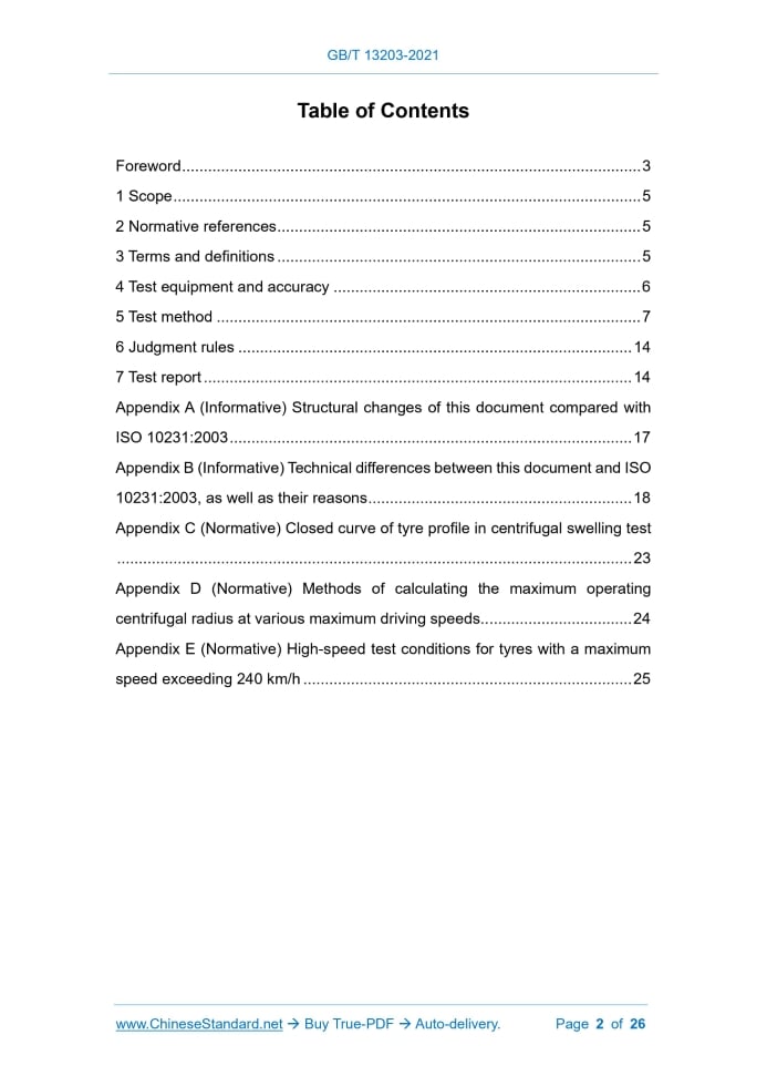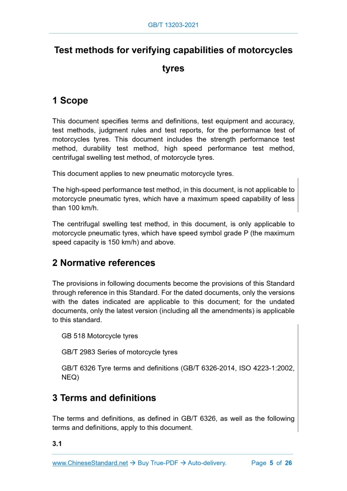 Similar standardsGB/T 13203-2021: Test methods for verifying capabilities of motorcycle tyres---This is an excerpt. Full copy of true-PDF in English version (including equations, symbols, images, flow-chart, tables, and figures etc.), auto-downloaded/delivered in 9 seconds, can be purchased online: https://www.ChineseStandard.net/PDF.aspx/GBT13203-2021GB NATIONAL STANDARD OF THE PEOPLE’S REPUBLIC OF CHINA ICS 83.160.10 CCS G 41 Replacing GB/T 13203-2014 Test methods for verifying capabilities of motorcycles tyres (ISO 10231.2003, Motorcycle tyres - Test methods for verifying tyre capabilities, MOD) Issued on. AUGUST 20, 2021 Implemented on. MARCH 01, 2022 Issued by. State Administration for Market Regulation; Standardization Administration of PRC. Table of ContentsForeword... 3 1 Scope... 5 2 Normative references... 5 3 Terms and definitions... 5 4 Test equipment and accuracy... 6 5 Test method... 7 6 Judgment rules... 14 7 Test report... 14 Appendix A (Informative) Structural changes of this document compared with ISO 10231.2003... 17 Appendix B (Informative) Technical differences between this document and ISO 10231.2003, as well as their reasons... 18 Appendix C (Normative) Closed curve of tyre profile in centrifugal swelling test ... 23 Appendix D (Normative) Methods of calculating the maximum operating centrifugal radius at various maximum driving speeds... 24 Appendix E (Normative) High-speed test conditions for tyres with a maximum speed exceeding 240 km/h... 25ForewordThis document was drafted in accordance with the requirements of GB/T 1.1- 2020 "Directives for standardization - Part 1.Rules for the structure and drafting of standardizing documents". This document replaces GB/T 13203-2014 "Test methods for verifying capabilities of motorcycles tyres". Compared with GB/T 13203-2014, the main technical changes are as follows. - ADD and IMPROVE the high-speed test condition parameters of motorcycle tyres, which have a maximum speed of more than 240 km/h (see Table 2 and Table 3; Table 2 and Table 3 of the 2014 edition). Correspondingly ADD the instructions for setting conditions for high-speed performance tests for tyres, which have marked or designated speed grades, by the tyre manufacturer, in this type of tyre (see Appendix E.2; Appendix E.2 of the 2014 edition); - ADD the test condition parameters of the speed grade code K, in the applicable scope of the high-speed performance test method (see Table 4; Table 4 of the 2014 Edition). This document uses the redrafting method, to modify and adopt ISO 10231.2003 "Motorcycle tyres - Test methods for verifying tyre capabilities". Compared with ISO 10231.2003, this document has many adjustments in structure. Appendix A lists the comparison of the article number, between this document and ISO 10231.2003. Compared with ISO 10231.2003, there are technical differences between this document. The terms of these differences have been marked by a vertical single line (|), on the outer margin of the document. Appendix B gives a list of the corresponding technical differences and their reasons. This document has also made the following editorial changes. - CHANGE the standard name to "Test methods for verifying capabilities of motorcycles tyres"; - MODIFY the description of the content of the test steps in E.1; - DELETE the references of ISO 10231.2003. Please note that some of the contents of this document may involve patents. The issuing agency of this document is not responsible for identifying patents. This document was proposed by the China Petroleum and Chemical Industry Federation. This document shall be under the jurisdiction of the National Tyre and Rim Standardization Technical Committee (SAC/TC 19). Drafting organizations of this document. Guangzhou Rubber Industrial Products Research Institute Co., Ltd., Xiamen Zhengxin Rubber Industry Co., Ltd., Zhongce Rubber Group Co., Ltd., Guangzhou Diamond Tyre Co., Ltd., Tianjin Wanda Tyre Group Co., Ltd., Pirelli Tyre Co., Ltd., Jiangxi Deyou Technology Co., Ltd. The main drafters of this document. Zhu Hongsuo, Ning Jun, He Mengqun, Chen Jianming, Sun Quanxi, Ye Fan, Cao Bin, Yu Zhenjiang, Niu Fuxiang, Lin Jianhao. This standard replaces the standard previously issued as follows. - GB/T13203-1991; - GB/T 13203-2007; when revised, it has incorporated GB/T 13203-1991 "Strength test for motorcycle tyres", GB/T 13204-2002 "Test method of high-speed performance for motorcycle tyres - Drum method" (GB/T 13204- 2002 "Test method of high speed performance for motorcycle tyres - Drum method" has been released as follows. GB/T 13204-1991), GB/T 13205- 1991 "Endurance test for motorcycle tyres (Drum method)"; - GB/T 13203-2014; - This is the third revision. Test methods for verifying capabilities of motorcycles tyres1 ScopeThis document specifies terms and definitions, test equipment and accuracy, test methods, judgment rules and test reports, for the performance test of motorcycles tyres. This document includes the strength performance test method, durability test method, high speed performance test method, centrifugal swelling test method, of motorcycle tyres.2 Normative referencesThe provisions in following documents become the provisions of this Standard through reference in this Standard. For the dated documents, only the versions with the dates indicated are applicable to this document; for the undated documents, only the latest version (including all the amendments) is applicable to this standard. GB 518 Motorcycle tyres GB/T 2983 Series of motorcycle tyres3 Terms and definitionsThe terms and definitions, as defined in GB/T 6326, as well as the following terms and definitions, apply to this document. The maximum load rating of the tyre, at the highest speed.4 Test equipment and accuracyFor the tyre centrifugal swelling test, when measuring the vertical part of the inner flange of the rim, directly above the bead seat and the bead seat fillet, THEN, the test shaft and rim shall be controlled, to 