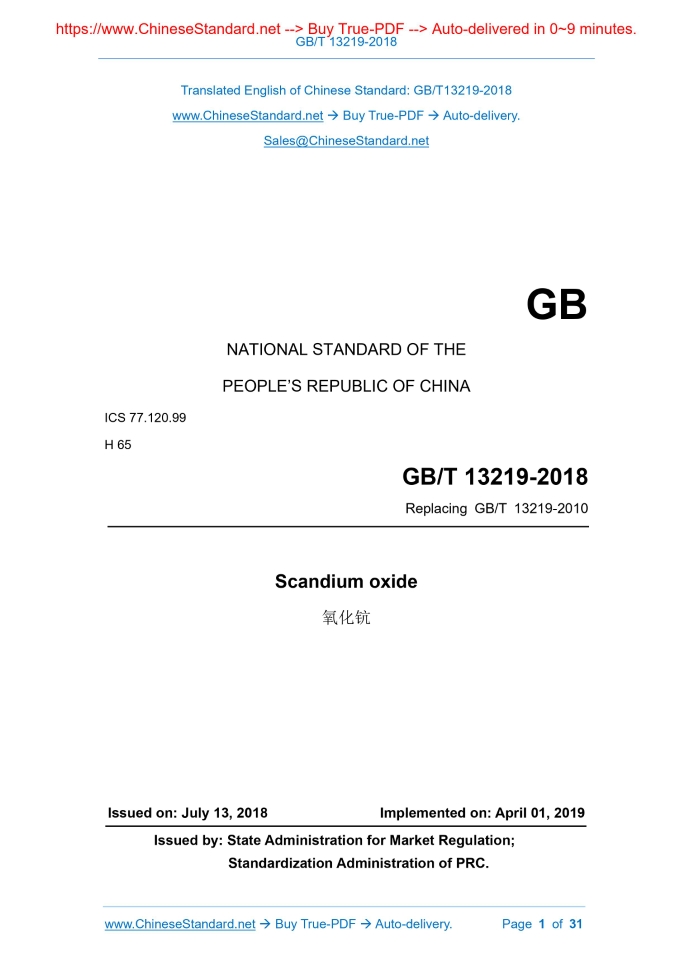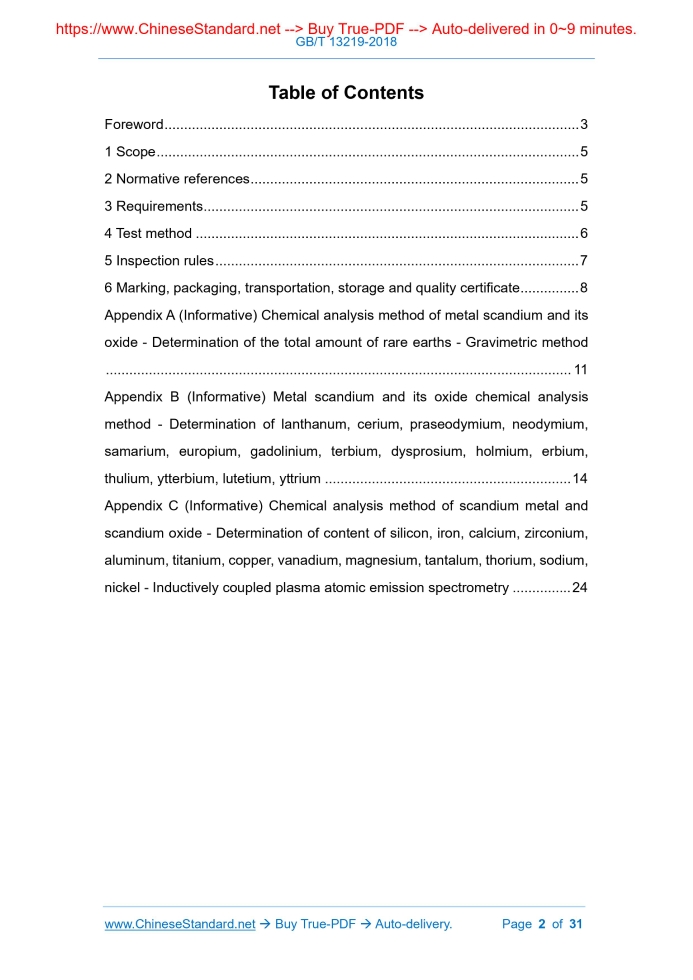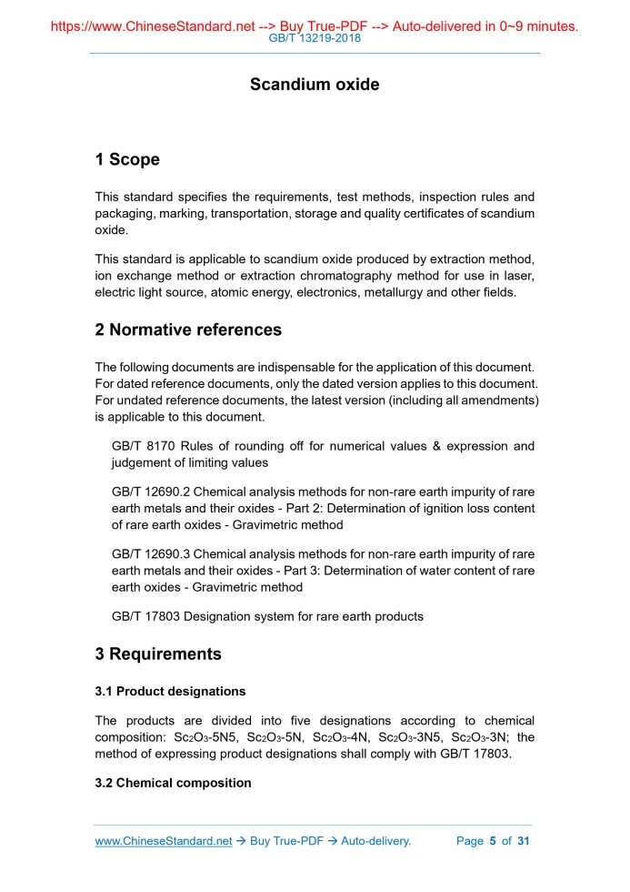 Similar standardsGB/T 13219-2018: Scandium oxide---This is an excerpt. Full copy of true-PDF in English version (including equations, symbols, images, flow-chart, tables, and figures etc.), auto-downloaded/delivered in 9 seconds, can be purchased online: https://www.ChineseStandard.net/PDF.aspx/GBT13219-2018GB NATIONAL STANDARD OF THE PEOPLE’S REPUBLIC OF CHINA ICS 77.120.99 H 65 Replacing GB/T 13219-2010 Scandium oxide 氧化钪 ISSUED ON: JULY 13, 2018 IMPLEMENTED ON: APRIL 01, 2019 Issued by: State Administration for Market Regulation; Standardization Administration of PRC. Table of ContentsForeword ... 3 1 Scope ... 5 2 Normative references ... 5 3 Requirements ... 5 4 Test method ... 6 5 Inspection rules ... 7 6 Marking, packaging, transportation, storage and quality certificate ... 8 Appendix A (Informative) Chemical analysis method of metal scandium and its oxide - Determination of the total amount of rare earths - Gravimetric method ... 11 Appendix B (Informative) Metal scandium and its oxide chemical analysis method - Determination of lanthanum, cerium, praseodymium, neodymium, samarium, europium, gadolinium, terbium, dysprosium, holmium, erbium, thulium, ytterbium, lutetium, yttrium ... 14 Appendix C (Informative) Chemical analysis method of scandium metal and scandium oxide - Determination of content of silicon, iron, calcium, zirconium, aluminum, titanium, copper, vanadium, magnesium, tantalum, thorium, sodium, nickel - Inductively coupled plasma atomic emission spectrometry ... 24 Scandium oxide1 ScopeThis standard specifies the requirements, test methods, inspection rules and packaging, marking, transportation, storage and quality certificates of scandium oxide. This standard is applicable to scandium oxide produced by extraction method, ion exchange method or extraction chromatography method for use in laser, electric light source, atomic energy, electronics, metallurgy and other fields.2 Normative referencesThe following documents are indispensable for the application of this document. For dated reference documents, only the dated version applies to this document. For undated reference documents, the latest version (including all amendments) is applicable to this document. GB/T 8170 Rules of rounding off for numerical values & expression and judgement of limiting values GB/T 12690.2 Chemical analysis methods for non-rare earth impurity of rare earth metals and their oxides - Part 2: Determination of ignition loss content of rare earth oxides - Gravimetric method GB/T 12690.3 Chemical analysis methods for non-rare earth impurity of rare earth metals and their oxides - Part 3: Determination of water content of rare earth oxides - Gravimetric method GB/T 17803 Designation system for rare earth products3 Requirements3.1 Product designations The products are divided into five designations according to chemical composition: Sc2O3-5N5, Sc2O3-5N, Sc2O3-4N, Sc2O3-3N5, Sc2O3-3N; the method of expressing product designations shall comply with GB/T 17803. 3.2 Chemical composition 4.1.1 Refer to Appendix A for the analysis method of total rare earth (REO). When the total amount of rare earths measured is more than 99%, the actual value of the total amount of rare earths is calculated by the subtraction method, that is (100% - Σ non-rare earth impurities). 4.1.2 Refer to Appendix B for the analysis method of rare earth impurity content. 4.1.3 Refer to Appendix C for the analysis method of non-rare earth impurity content. 4.1.4 The analysis method of ignition loss and moisture shall be carried out in accordance with the provisions of GB/T 12690.2 and GB/T 12690.3. 4.1.5 The absolute purity of scandium oxide (Sc2O3) is calculated as [100% - (Σ Rare earth impurities + Σ non-rare earth impurities)]. 4.1.6 The relative purity (Sc2O3/REO) of scandium oxide (Sc2O3) is calculated as (100% - Σ rare earth impurities/REO). 4.2 Numerical rounding It is performed according to the provisions of GB/T 8170. 4.3 Appearance quality Under natural scattered light, visually check the appearance quality.5 Inspection rules5.1 Inspection and acceptance 5.1.1 The product is inspected by the supplier's quality inspection department, to ensure that the product meets the requirements of this standard; meanwhile it shall fill the product quality certificate. 5.1.2 The purchaser shall inspect the received product. If the inspection result does not conform to the provisions of this standard, it shall notice the supplier within 2 months from the date of receipt of the product; the supplier and the buyer shall negotiate and resolve it. If arbitration is needed, it can be entrusted to a unit recognized by both parties to conduct a joint sampling on the buyer's site. 5.2 Group-batching Products shall be submitted for inspection in batches; each batch shall consist of products of the same designation. 5.3 Inspection items c) The name of the product manufacturer; d) Product name and designation; e) Lot number; f) Gross weight and net weight; g) Packing date; h) Sign or words of "moisture-proof". 6.1.2 The products are packed in double-layer plastic bags or plastic bottles, each bag (bottle) has a net weight of 0.1 kg, 0.25 kg, 0.5 kg, 1 kg. Then put the bag (bottle) in an iron drum (wooden box, carton or plastic box); the net weight of each iron drum (wooden box, carton or plastic box) is 0.5 kg, 1 kg, 5 kg, 10 kg. 6.2 Transportation and storage The product shall be protected from rain and moisture during transportation; it shall be stored in a dry place and shall not be stacked in the open air. 6.3 Quality certificate Each batch of products shall be accompanied by a quality certificate, which shall indicate: a) Product name; b) Supplier's name, address, telephone, fax; c) Name, address, telephone, fax of the manufacturer of raw mineral products; d) The name, address, telephone, fax of the product manufacturer; e) Designation and batch number; f) Quantity (net weight and number of pieces); g) Various analysis inspec