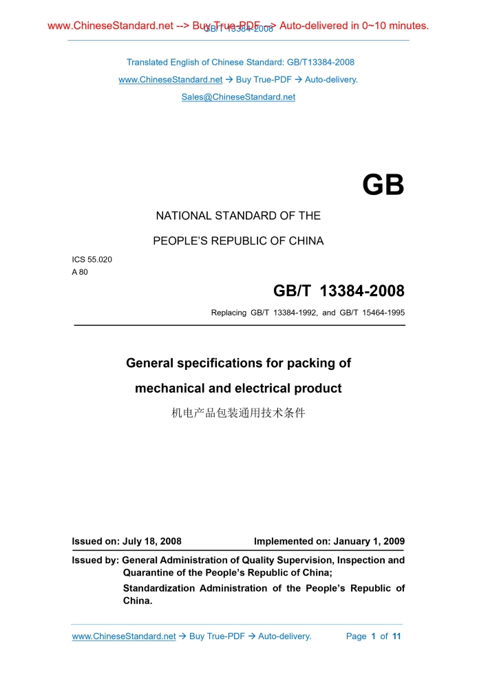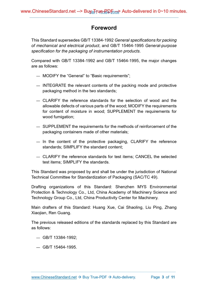 Similar standardsGB/T 13384-2008: General specifications for packing of mechanical and electrical product---This is an excerpt. Full copy of true-PDF in English version (including equations, symbols, images, flow-chart, tables, and figures etc.), auto-downloaded/delivered in 9 seconds, can be purchased online: https://www.ChineseStandard.net/PDF.aspx/GBT13384-2008GB NATIONAL STANDARD OF THE PEOPLE’S REPUBLIC OF CHINA ICS 55.020 A 80 Replacing GB/T 13384-1992, and GB/T 15464-1995 General specifications for packing of mechanical and electrical product Issued on. JULY 18, 2008 Implemented on. JANUARY 1, 2009 Issued by. General Administration of Quality Supervision, Inspection and Quarantine of the People’s Republic of China; Standardization Administration of the People’s Republic of China. Table of ContentsForeword... 3 1 Scope... 4 2 Normative references... 4 3 Basic requirements... 5 4 Packing modes and protective packaging methods... 6 5 Technical requirements... 6 6 Test methods... 11 7 Packaging marks and accompanying files... 11ForewordThis Standard supersedes GB/T 13384-1992 General specifications for packing of mechanical and electrical product, and GB/T 15464-1995 General-purpose specification for the packaging of instrumentation products. Compared with GB/T 13384-1992 and GB/T 15464-1995, the major changes are as follows. — MODIFY the “General” to “Basic requirements”; — INTEGRATE the relevant contents of the packing mode and protective packaging method in the two standards; — CLARIFY the reference standards for the selection of wood and the allowable defects of various parts of the wood; MODIFY the requirements for content of moisture in wood; SUPPLEMENT the requirements for wood fumigation; — SUPPLEMENT the requirements for the methods of reinforcement of the packaging containers made of other materials; — In the content of the protective packaging, CLARIFY the reference standards; SIMPLIFY the standard content; — CLARIFY the reference standards for test items; CANCEL the selected test items; SIMPLIFY the standards. This Standard was proposed by and shall be under the jurisdiction of National Technical Committee for Standardization of Packaging (SAC/TC 49). Drafting organizations of this Standard. Shenzhen MYS Environmental Protection & Technology Co., Ltd, China Academy of Machinery Science and Technology Group Co., Ltd, China Productivity Center for Machinery. Main drafters of this Standard. Huang Xue, Cai Shaoling, Liu Ping, Zhang Xiaojian, Ren Guang. The previous released editions of the standards replaced by this Standard are as follows. — GB/T 13384-1992; — GB/T 15464-1995. General specifications for packing of mechanical and electrical product1 ScopeThis Standard specifies the basic requirements for the packaging, packing modes and protective packaging methods, technical requirements, test methods, packaging marks and accompanying files of machinery, electrical appliances, instrumentation and other products. This Standard is applicable to the transport packages of machinery, electrical appliances, instrumentation and other products.2 Normative referencesThe provisions in the following documents become the provisions of this Standard through reference in this Standard. For dated references, the subsequent amendments (excluding corrections) or revisions do not apply to this Standard. However, parties who reach an agreement based on this Standard are encouraged to study if the latest editions of these documents are applicable. For undated references, the latest editions apply to this Standard. GB/T 191 Packaging -- Pictorial marking for handling of goods (GB/T 191- 2008, ISO 780.1997, MOD) GB/T 4768 Mould-proof packaging GB/T 4857 (all parts) Packaging -- Basic tests for transport packages GB/T 4879 Rustproof packaging GB/T 4892 Dimensions of rigid rectangular packages -- Transport packages GB/T 4897 (all parts) Particleboard GB/T 5048 Moisture-proof packaging GB/T 5398 Test methods for large transport packages (GB/T 5398-1999, neq ASTM D 1083.1991) GB/T 6543 Single and double corrugated boxes for transport packages GB/T 6544 Corrugated fiberboard GB/T 6980 Calp box GB/T 7284 Wooden framed case GB/T 7350 Waterproof packaging3 Basic requirements3.1 Packaging shall meet scientific, economical, firm, aesthetic and marketable requirements. In the circulation environment, it shall be ensured that the product does not cause rust, mildew, reduced accuracy, damage or loss due to improper packaging during the agreement period between the supply and demand sides. 3.2 Packaging design shall be based on product characteristics, circulation environment conditions, and customer requirements, so that the packaging is compact, safe and reliable, with reasonable protection. 3.3 The product must be qualified after inspection and well protected before exterior and interior packing. The accompanying files shall be complete.4 Packing modes and protective packaging methods4.1 The packing modes mainly include box package (common wooden cases, skid wooden boxes, wooden framed cases, corrugated boxes, plywood cases, fiberboard cases, calcium-plastic boxes, magnesium oxychloride concrete cases, cases with plybamboo, plastic cases, calcium-plastic corrugated boxes [Translator. CALP boxes], metal boxes, honeycomb pallet boxes, etc.), 4.2 The protective packaging methods mainly include. waterproof packaging, moisture-proof packaging, mould-proof packaging, rustproof packaging, cushion packaging, dust-proof packaging, anti-electrostatic packaging, etc.5 Technical requirements5.1 Packaging material The selected packaging material shall not cause color change or rust on the surface of the product, nor shall it cause damage to the product due to deformation of the packaging material. 5.1.1 Wood The wood for packaging shall meet the following requirements. 5.1.2 Corrugated fiberboard The corrugated fiberboard for packaging shall comply with the provisions of GB/T 6544. 5.1.3 Ply
