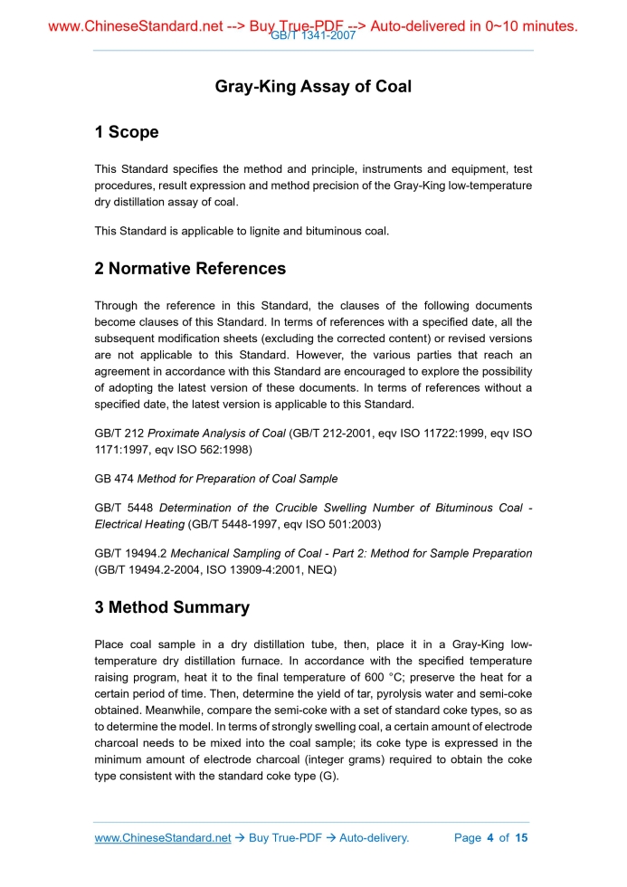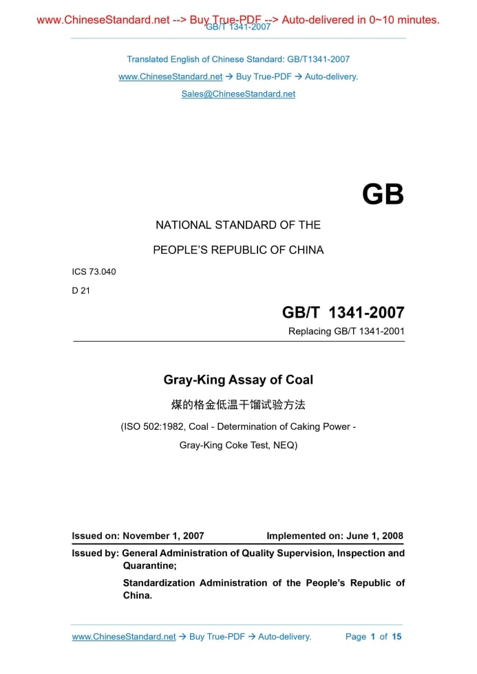 GB/T 1341-2007: Gray -- King assay of coal Delivery: 9 seconds. True-PDF full-copy in English & invoice will be downloaded + auto-delivered via email. See step-by-step procedure Status: Valid GB/T 1341: Historical versions