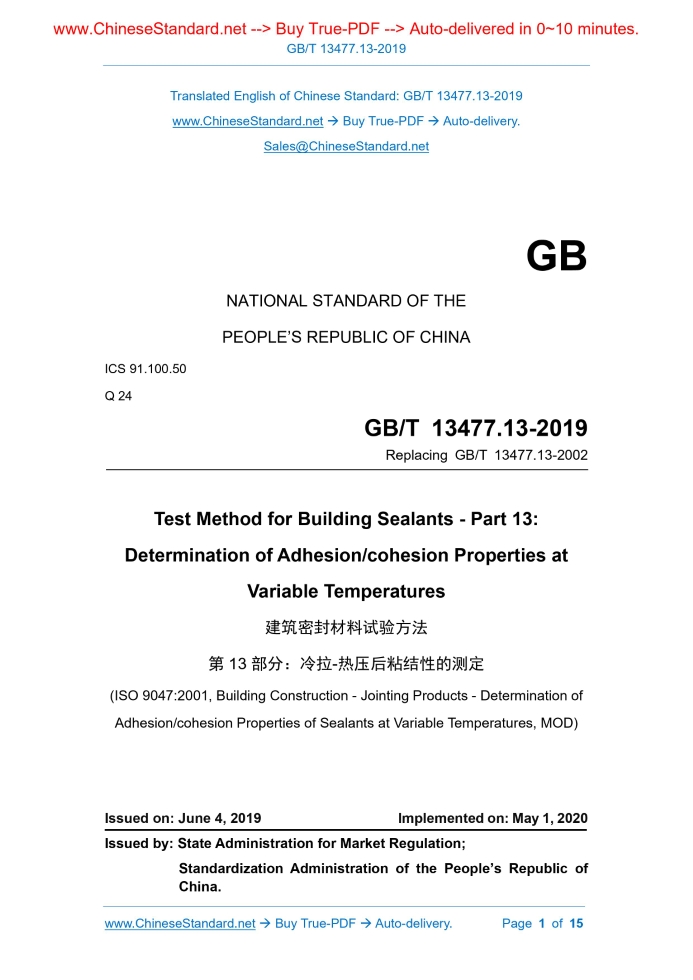 GB/T 13477.13-2019: Test Method for Building Sealants -- Part 13: Determination of Adhesion/cohesion Properties at Variable Temperatures Delivery: 9 seconds. True-PDF full-copy in English & invoice will be downloaded + auto-delivered via email. See step-by-step procedure Status: Valid GB/T 13477.13: Historical versions