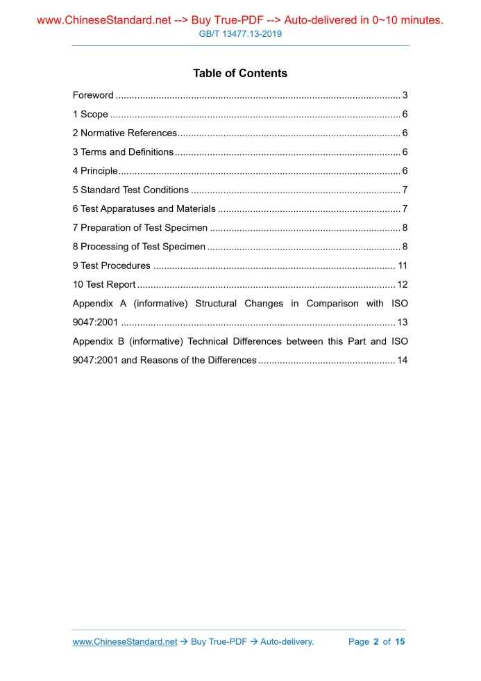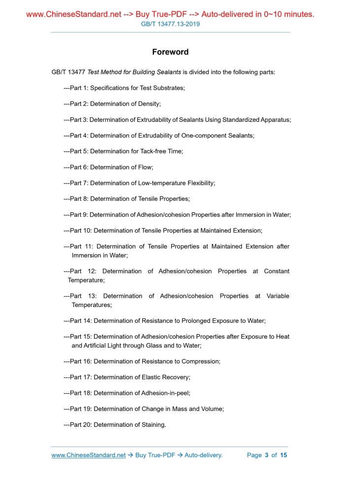 Similar standardsGB/T 13477.13-2019: Test Method for Building Sealants -- Part 13: Determination of Adhesion/cohesion Properties at Variable Temperatures---This is an excerpt. Full copy of true-PDF in English version (including equations, symbols, images, flow-chart, tables, and figures etc.), auto-downloaded/delivered in 9 seconds, can be purchased online: https://www.ChineseStandard.net/PDF.aspx/GBT13477.13-2019 NATIONAL STANDARD OF THE PEOPLE’S REPUBLIC OF CHINA ICS 91.100.50 Q 24 Replacing GB/T 13477.13-2002 Test Method for Building Sealants - Part 13: Determination of Adhesion/cohesion Properties at Variable Temperatures (ISO 9047:2001, Building Construction - Jointing Products - Determination of Adhesion/cohesion Properties of Sealants at Variable Temperatures, MOD) ISSUED ON: JUNE 4, 2019 IMPLEMENTED ON: MAY 1, 2020 Issued by: State Administration for Market Regulation; Standardization Administration of the People’s Republic of China. Table of ContentsForeword ... 3 1 Scope ... 6 2 Normative References ... 6 3 Terms and Definitions ... 6 4 Principle ... 6 5 Standard Test Conditions ... 7 6 Test Apparatuses and Materials ... 7 7 Preparation of Test Specimen ... 8 8 Processing of Test Specimen ... 8 9 Test Procedures ... 11 10 Test Report ... 12 Appendix A (informative) Structural Changes in Comparison with ISO 9047:2001 ... 13 Appendix B (informative) Technical Differences between this Part and ISO 9047:2001 and Reasons of the Differences ... 14ForewordGB/T 13477 Test Method for Building Sealants is divided into the following parts: ---Part 1: Specifications for Test Substrates; ---Part 2: Determination of Density; ---Part 3: Determination of Extrudability of Sealants Using Standardized Apparatus; ---Part 4: Determination of Extrudability of One-component Sealants; ---Part 5: Determination for Tack-free Time; ---Part 6: Determination of Flow; ---Part 7: Determination of Low-temperature Flexibility; ---Part 8: Determination of Tensile Properties; ---Part 9: Determination of Adhesion/cohesion Properties after Immersion in Water; ---Part 10: Determination of Tensile Properties at Maintained Extension; ---Part 11: Determination of Tensile Properties at Maintained Extension after Immersion in Water; ---Part 12: Determination of Adhesion/cohesion Properties at Constant Temperature; ---Part 13: Determination of Adhesion/cohesion Properties at Variable Temperatures; ---Part 14: Determination of Resistance to Prolonged Exposure to Water; ---Part 15: Determination of Adhesion/cohesion Properties after Exposure to Heat and Artificial Light through Glass and to Water; ---Part 16: Determination of Resistance to Compression; ---Part 17: Determination of Elastic Recovery; ---Part 18: Determination of Adhesion-in-peel; ---Part 19: Determination of Change in Mass and Volume; ---Part 20: Determination of Staining. Test Method for Building Sealants - Part 13: Determination of Adhesion/cohesion Properties at Variable Temperatures1 ScopeThis Part of GB/T 13477 stipulates the terms and definitions, principle, standard test conditions, test apparatuses and materials, specimen preparation, specimen processing, test procedures and test report of the determination of adhesion/cohesion properties of sealants for the purposes of architecture and civil engineering after stretch-compression cycle at variable temperatures. This Part is applicable to the determination of adhesion/cohesion properties of elastic sealants for the purposes of architecture and civil engineering after repeated cooling stretch - heating compression.2 Normative ReferencesThe following documents are indispensable to the application of this document. In terms of references with a specified date, only versions with a specified date are applicable to this document. In terms of references without a specified date, the latest version (including all the modifications) is applicable to this document. GB/T 13477.1 Test Method for Building Sealants - Part 1: Specifications for Test Substrates (GB/T 13477.1-2002, ISO 13640:1999, MOD) GB/T 14682 Building Sealing Material Vocabulary (GB/T 14682-2006, ISO 6927:1981, NEQ)3 Terms and DefinitionsTerms and definitions that are defined in GB/T 14682 are applicable to this document.4 PrincipleBond sealant sample between the surface of two parallel substrates to make the test specimen. After the test specimen goes through cooling stretch - heating compression cycle under the stipulated conditions, examine the damage of the adhesion or cohesion of the test specimen.5 Standard Test ConditionsStandard test conditions are: temperature (23 ± 2) °C; relative humidity (50 ± 5) %.6 Test Apparatuses and Materials6.1 Test Apparatuses 6.1.1 Blast drying oven: temperature can be adjusted to (70 ± 2) °C. 6.1.2 Low-temperature test chamber: temperature can be adjusted to (-20 ± 2) °C; be capable of containing test specimen under stretched state. 6.1.3 Container: used to hold distilled water; soak and process test specimen in accordance with Method B (please refer to 8.2). 6.1.4 Testing machine: be capable of stretching and compressing test specimen at the speed of (5.5 ± 0.7) mm/min. 6.1.5 Measuring tool: division value: 0.5 mm. 6.2 Materials 6.2.1 Adhesion/cohesion substrate: cement mortar board, aluminum plate or glass plate, which is used to prepare test specimen, shall comply with the stipulations in GB/T 13477.1. The shape and dimensions of substrate are shown in Figure 1 and Figure 2. Or, substrates of other textures and dimensions may also be selected in accordance with the negotiation among various parties. However, the adhesion/cohesion dimension and area of embedded sealant sample shall be identical to what is shown in Figure 1 and Figure 2. In terms of each test specimen, two substrates which are made of the same materials shall be adopted. 6.2.2 Isolation pad: the surface shall be anti-sticking; it shall be used to prepare test specimen with the sealant cross-section of 12 mm x 12 mm (as it is show