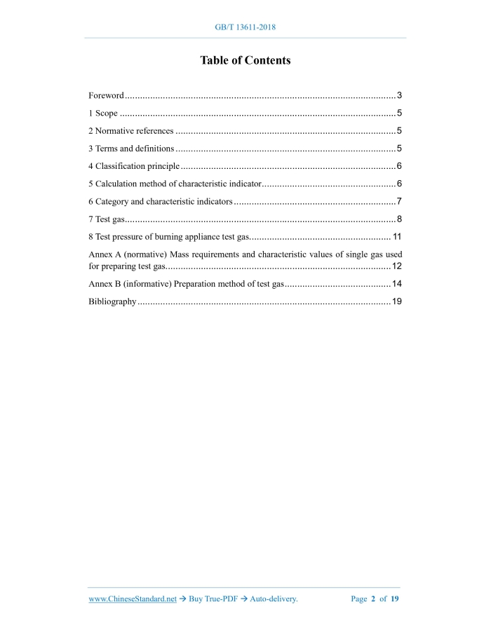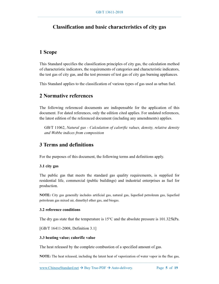 Similar standardsGB/T 13611-2018: Classification and basic characteristics of city gas---This is an excerpt. Full copy of true-PDF in English version (including equations, symbols, images, flow-chart, tables, and figures etc.), auto-downloaded/delivered in 9 seconds, can be purchased online: https://www.ChineseStandard.net/PDF.aspx/GBT13611-2018GB NATIONAL STANDARD OF THE PEOPLE’S REPUBLIC OF CHINA ICS 75.160.30 P 45 Replacing GB/T 13611-2006 Classification and basic characteristics of city gas ISSUED ON: MARCH 15, 2018 IMPLEMENTED ON: FEBRUARY 01, 2019 Issued by: General Administration of Quality Supervision, Inspection and Quarantine of the People's Republic of China; Standardization Administration of the People's Republic of China. Table of ContentsForeword ... 3 1 Scope ... 5 2 Normative references ... 5 3 Terms and definitions ... 5 4 Classification principle ... 6 5 Calculation method of characteristic indicator ... 6 6 Category and characteristic indicators ... 7 7 Test gas ... 8 8 Test pressure of burning appliance test gas... 11 Annex A (normative) Mass requirements and characteristic values of single gas used for preparing test gas ... 12 Annex B (informative) Preparation method of test gas ... 14 Bibliography ... 19 Classification and basic characteristics of city gas1 ScopeThis Standard specifies the classification principles of city gas, the calculation method of characteristic indicators, the requirements of categories and characteristic indicators, the test gas of city gas, and the test pressure of test gas of city gas burning appliances. This Standard applies to the classification of various types of gas used as urban fuel.2 Normative referencesThe following referenced documents are indispensable for the application of this document. For dated references, only the edition cited applies. For undated references, the latest edition of the referenced document (including any amendments) applies. GB/T 11062, Natural gas - Calculation of calorific values, density, relative density and Wobbe indices from composition3 Terms and definitionsFor the purposes of this document, the following terms and definitions apply. 3.1 city gas The public gas that meets the standard gas quality requirements, is supplied for residential life, commercial (public buildings) and industrial enterprises as fuel for production. NOTE: City gas generally includes artificial gas, natural gas, liquefied petroleum gas, liquefied petroleum gas mixed air, dimethyl ether gas, and biogas. 3.2 reference conditions The dry gas state that the temperature is 15℃ and the absolute pressure is 101.325kPa. [GB/T 16411-2008, Definition 3.1] 3.3 heating value; calorific value The heat released by the complete combustion of a specified amount of gas. NOTE: The heat released, including the latent heat of vaporization of water vapor in the flue gas, is called high calorific value. The heat released, excluding the latent heat of vaporization of the water vapor in the flue gas, is called low calorific value. [Rewrite GB/T 12206-2006, Definition 3.1] 3.4 relative density; specific gravity The ratio of the mass of a certain volume of dry gas to the mass of the same volume of dry air at the same temperature and pressure. NOTE: The relative density is a dimensionless quantity, indicated by the symbol d. [GB/T 12206-2006, definition 3.5] 3.5 Wobbe number; Wobbe index The ratio of the calorific value of a gas to the square root of its relative density. 3.6 reference gas The standard gas representing a certain type of gas. 3.7 limit gas The standard gas prepared according to the allowable fluctuation range of gas.4 Classification principleCity gas should be classified according to the type of gas and its characteristic indicator Wobbe number W. The fluctuation range of Wobbe number W and calorific value H should be controlled.5 Calculation method of characteristic indicator5.1 Heating value The calorific value can be calculated according to formula (1): Where, H - Gas calorific value (high calorific value Hs and low calorific value Hi), in megajoules per cubic meter (MJ/m3); Hr - The calorific value of r combustible components in the gas, in megajoules per cubicAnnex A(normative) Mass requirements and characteristic values of single gas used for preparing test gas A.1 The purity of the single gas used to prepare the test gas should not be lower than the following values: a) Nitrogen (N2): 99%; b) Hydrogen (H2): 99%; c) Methane (CH4): 95%; d) Propylene (C3H6): 95%; e) Propane (C3H8): 95%; f) Butane (C4H10): 95%; g) The total content of hydrogen, carbon monoxide and oxygen in the above c), d), e) and f) should be less than 1%. The total nitrogen and carbon dioxide content should be less than 2%. A.2 When the supply of methane is difficult, local natural gas can be used instead. When the supply of propane, butane and propylene is difficult, liquefied petroleum gas can be used instead. However, the error between the Wobbe number W of the prepared test gas and the given value should be within the specified range of ±2%. A.3 The relative density d and calorific value H of various single gases used for preparing the test gas should be calculated and determined according to the provisions of GB/T 11062. Commonly used single gas characteristic value (15℃, 101.325kPa, dry) should adopt the value specified in Table A.1.Annex B(informative) Preparation method of test gas B.1 General requirements B.1.1 The artificial gas should be prepared with raw gas methane, hydrogen and nitrogen. B.1.2 Natural gas, mainly composed of methane, should be prepared with methane, nitrogen, propane or butane. B.1.3 The tempering limit gas of natural gas should be prepared with methane, hydrogen, propane or butane. B.1.4 When used for laboratory sampling inspection and type inspection of gas appliances, liquefied petroleum gas mixed air should not be used as the test gas source for natural gas burning appliances. B.2 Artificial gas B.2.1 When methane, hydrogen