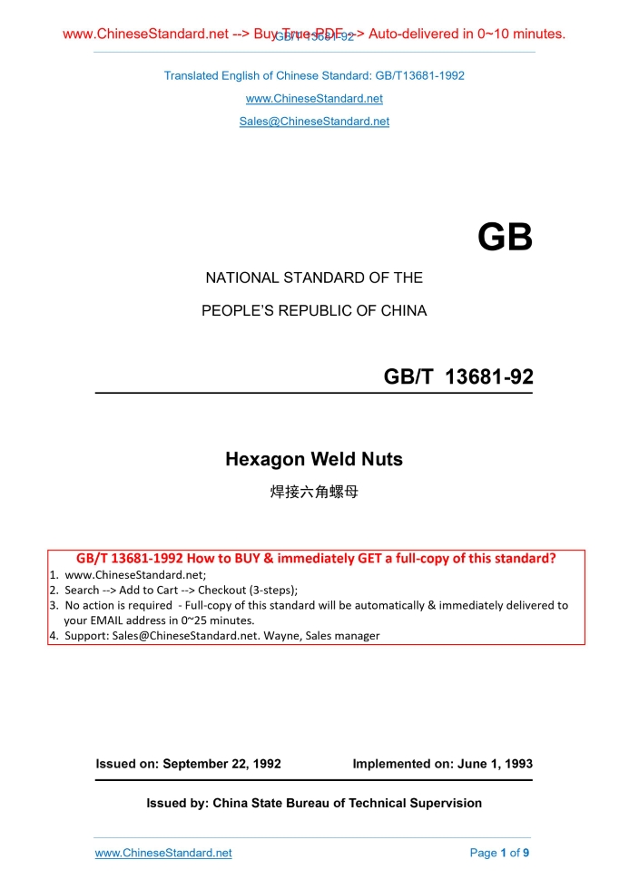GB/T 13681-1992: Hexagon weld nuts Delivery: 9 seconds. True-PDF full-copy in English & invoice will be downloaded + auto-delivered via email. See step-by-step procedure