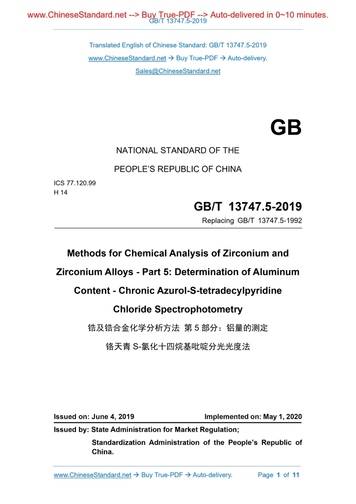 GB/T 13747.5-2019: Methods for Chemical Analysis of Zirconium and Zirconium Alloys - Part 5: Determination of Aluminum Content - Chronic Azurol-S-tetradecyl pyridine Chloride Spectrophotometry Delivery: 9 seconds. True-PDF full-copy in English & invoice will be downloaded + auto-delivered via email. See step-by-step procedure Status: Valid GB/T 13747.5: Historical versions