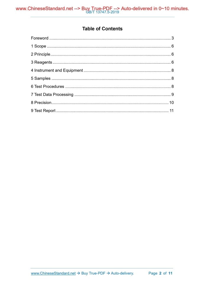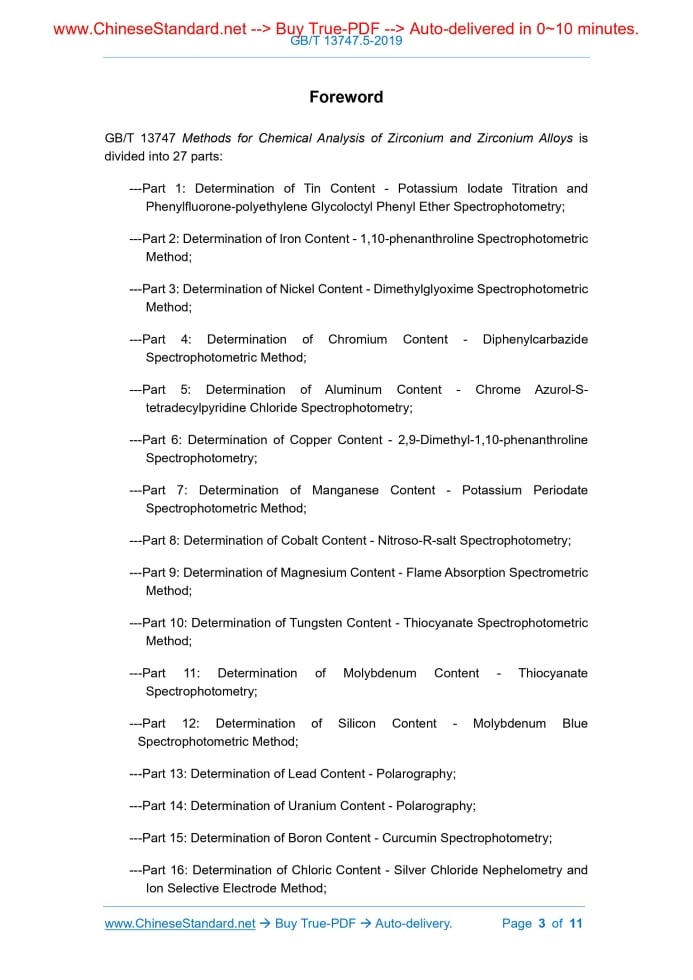 Similar standardsGB/T 13747.5-2019: Methods for Chemical Analysis of Zirconium and Zirconium Alloys - Part 5: Determination of Aluminum Content - Chronic Azurol-S-tetradecyl pyridine Chloride Spectrophotometry---This is an excerpt. Full copy of true-PDF in English version (including equations, symbols, images, flow-chart, tables, and figures etc.), auto-downloaded/delivered in 9 seconds, can be purchased online: https://www.ChineseStandard.net/PDF.aspx/GBT13747.5-2019 NATIONAL STANDARD OF THE PEOPLE’S REPUBLIC OF CHINA ICS 77.120.99 H 14 Replacing GB/T 13747.5-1992 Methods for Chemical Analysis of Zirconium and Zirconium Alloys - Part 5: Determination of Aluminum Content - Chronic Azurol-S-tetradecylpyridine Chloride Spectrophotometry ISSUED ON: JUNE 4, 2019 IMPLEMENTED ON: MAY 1, 2020 Issued by: State Administration for Market Regulation; Standardization Administration of the People’s Republic of China. Table of ContentsForeword ... 3 1 Scope ... 6 2 Principle ... 6 3 Reagents ... 6 4 Instrument and Equipment ... 8 5 Samples ... 8 6 Test Procedures ... 8 7 Test Data Processing ... 9 8 Precision ... 10 9 Test Report ... 11ForewordGB/T 13747 Methods for Chemical Analysis of Zirconium and Zirconium Alloys is divided into 27 parts: ---Part 1: Determination of Tin Content - Potassium Iodate Titration and Phenylfluorone-polyethylene Glycoloctyl Phenyl Ether Spectrophotometry; ---Part 2: Determination of Iron Content - 1,10-phenanthroline Spectrophotometric Method; ---Part 3: Determination of Nickel Content - Dimethylglyoxime Spectrophotometric Method; ---Part 4: Determination of Chromium Content - Diphenylcarbazide Spectrophotometric Method; ---Part 5: Determination of Aluminum Content - Chrome Azurol-S- tetradecylpyridine Chloride Spectrophotometry; ---Part 6: Determination of Copper Content - 2,9-Dimethyl-1,10-phenanthroline Spectrophotometry; ---Part 7: Determination of Manganese Content - Potassium Periodate Spectrophotometric Method; ---Part 8: Determination of Cobalt Content - Nitroso-R-salt Spectrophotometry; ---Part 9: Determination of Magnesium Content - Flame Absorption Spectrometric Method; ---Part 10: Determination of Tungsten Content - Thiocyanate Spectrophotometric Method; ---Part 11: Determination of Molybdenum Content - Thiocyanate Spectrophotometry; ---Part 12: Determination of Silicon Content - Molybdenum Blue Spectrophotometric Method; ---Part 13: Determination of Lead Content - Polarography; ---Part 14: Determination of Uranium Content - Polarography; ---Part 15: Determination of Boron Content - Curcumin Spectrophotometry; ---Part 16: Determination of Chloric Content - Silver Chloride Nephelometry and Ion Selective Electrode Method; Methods for Chemical Analysis of Zirconium and Zirconium Alloys - Part 5: Determination of Aluminum Content - Chronic Azurol-S-tetradecylpyridine Chloride Spectrophotometry1 ScopeThis Part of GB/T 13747 stipulates the determination method of aluminum content in zirconium and zirconium alloys. This Part is applicable to the determination of aluminum content in zirconium sponge, zirconium and zirconium alloys. The range of determination is: 0.0025% ~ 0.10%.2 PrincipleUse sulfuric acid and ammonium sulfate to dissolve specimen. Use N-benzoyl-N- phenylhydroxylamine trichloromethane solution to extract and separate the main element zirconium, and interference elements: hafnium, iron and titanium. After the separation, use o-phenanthroline and ascorbic acid to mask the residual iron. In acetic acid-sodium acetate medium (pH 5.8), aluminum and chronic azurol-S- tetradecylpyridine chloride form colored complex. At the wavelength of 630 nm, use a spectrophotometer to measure its absorbance. If the sample contains a small amount of uranium and thorium, sodium carbonate solution may be added during color- developing, so as to eliminate the influence.3 ReagentsUnless it is otherwise stipulated, the analysis shall merely adopt reagents that are confirmed to be analytically pure and secondary laboratory water. 3.1 Ammonium sulfate (excellent grade of purity). 3.2 Sulfuric acid ( = 1.84 g/mL, excellent grade of purity). 3.3 Nitric acid ( = 1.42 g/mL, excellent grade of purity). 3.4 Hydrochloric acid ( = 1.19 g/mL, excellent grade of purity). 3.5 Trichloromethane. 6.4.2 In accordance with Table 1, transfer-take the solution. Place it in a 100 mL separating funnel. Add 10 mL of N-benzoyl-N-phenylhydroxylamine trichloromethane solution (3.13); violently oscillate it for 2 min. After placing it still for stratification, discard the organic phase, then, repeat extraction for three times. Add 10 mL of trichloromethane (3.5); start oscillation for 0.5 min. After placing it still for stratification, discard the organic phase. Place the aqueous phase into a 50 mL beaker, then, use a small amount of water to rinse the separating funnel. Combine the rinsing solution into the beaker. Conduct low-temperature heating, till it emits white smoke. Then, take it down. While it is still hot, along the wall of the beaker, add 20 drops of nitric acid (3.3). Continue to heat it up, till it emits dense white smoke, then, take it down. Cool it down, then, along the wall of the beaker, add a small amount of water, then, mix it up. Use micro-heat to dissolve salt. After cooling it down, use water to transfer it into a 50 mL volumetric flask; the volume of the solution shall be around 15 mL. 6.4.3 Add 2 drops of 2, 4-dinitrophenol solution (3.11). Use ammonia water (3.7) to adjust it, till the solution turns yellow. Then, add drops of hydrochloric acid (3.6), till such yellow disappears. Add 2 mL of o-phenanthroline solution (3.9), then, shake it up. Add 2 mL of ascorbic acid solution (3.10), then, shake it up. Along the wall of the beaker, add 5.0 mL of azurol-S-tetradecylpyridine chloride solution (3.8), then, shake it up. Add 5 mL of acetic acid-sodium acetate buffer solution (3.12). Use water to dilute to the scale, then, shake it up. 6.4.4 After placing the solution for 20 min