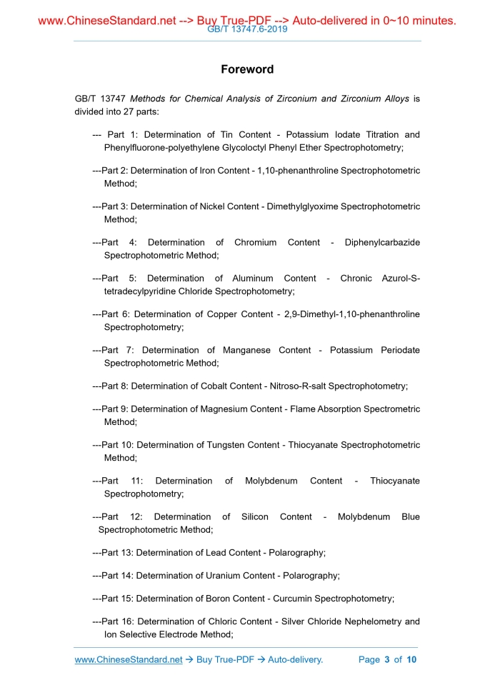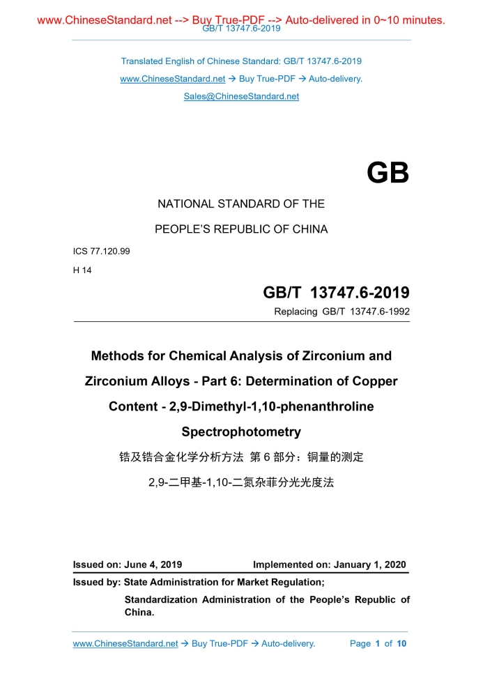 GB/T 13747.6-2019: Methods for Chemical Analysis of Zirconium and Zirconium Alloys - Part 6: Determination of Copper Content - 2,9-Dimethyl-1,10-phenanthroline Spectrophotometry Delivery: 9 seconds. True-PDF full-copy in English & invoice will be downloaded + auto-delivered via email. See step-by-step procedure Status: Valid GB/T 13747.6: Historical versions