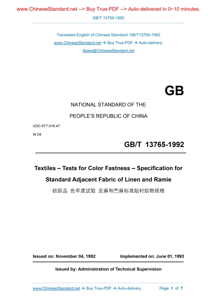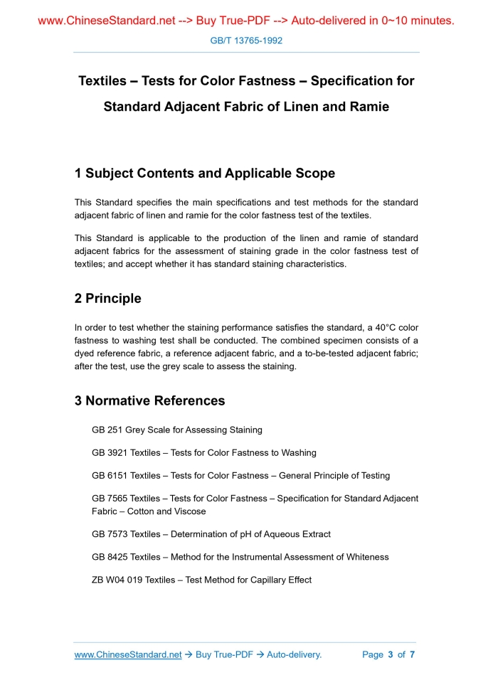 GB/T 13765-1992: Textiles. Test for colour fastness. Specification for standard adjacent fabric: linen and ramie Delivery: 9 seconds. True-PDF full-copy in English & invoice will be downloaded + auto-delivered via email. See step-by-step procedure