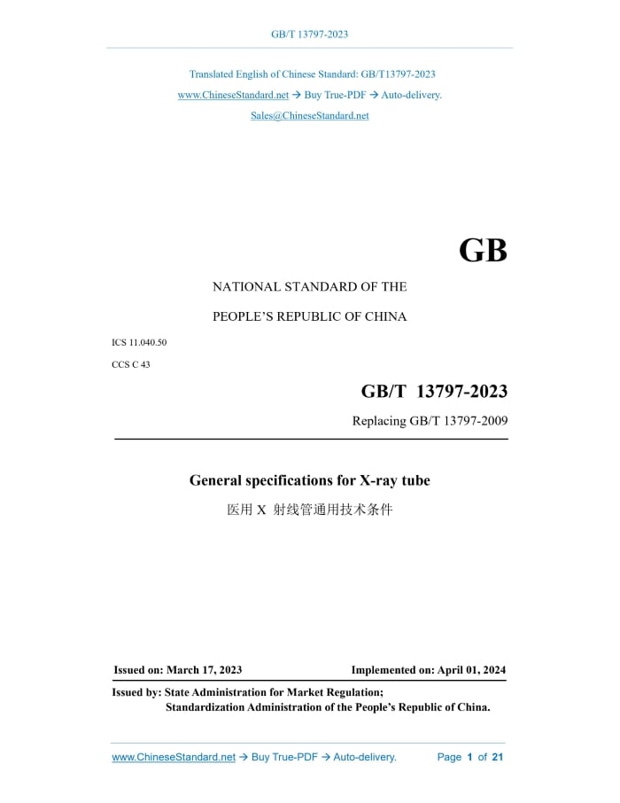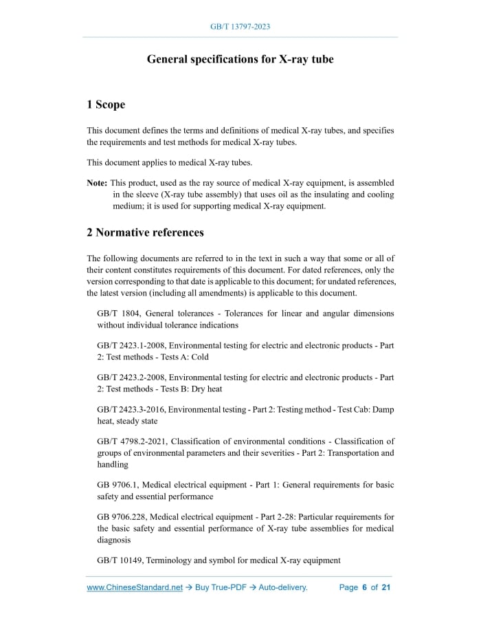 Similar standardsGB/T 13797-2023: General specifications for X-ray tube---This is an excerpt. Full copy of true-PDF in English version (including equations, symbols, images, flow-chart, tables, and figures etc.), auto-downloaded/delivered in 9 seconds, can be purchased online: https://www.ChineseStandard.net/PDF.aspx/GBT13797-2023GB NATIONAL STANDARD OF THE PEOPLE’S REPUBLIC OF CHINA ICS 11.040.50 CCS C 43 Replacing GB/T 13797-2009 General specifications for X-ray tube ISSUED ON: MARCH 17, 2023 IMPLEMENTED ON: APRIL 01, 2024 Issued by: State Administration for Market Regulation; Standardization Administration of the People’s Republic of China. Table of ContentsForeword ... 3 1 Scope ... 6 2 Normative references ... 6 3 Terms and definitions ... 7 4 Requirements ... 7 5 Test methods ... 12 Appendix A (Informative) Notes on some clauses ... 18 References ... 21 General specifications for X-ray tube1 ScopeThis document defines the terms and definitions of medical X-ray tubes, and specifies the requirements and test methods for medical X-ray tubes. This document applies to medical X-ray tubes. Note: This product, used as the ray source of medical X-ray equipment, is assembled in the sleeve (X-ray tube assembly) that uses oil as the insulating and cooling medium; it is used for supporting medical X-ray equipment.2 Normative referencesThe following documents are referred to in the text in such a way that some or all of their content constitutes requirements of this document. For dated references, only the version corresponding to that date is applicable to this document; for undated references, the latest version (including all amendments) is applicable to this document. GB/T 1804, General tolerances - Tolerances for linear and angular dimensions without individual tolerance indications GB/T 2423.1-2008, Environmental testing for electric and electronic products - Part 2: Test methods - Tests A: Cold GB/T 2423.2-2008, Environmental testing for electric and electronic products - Part 2: Test methods - Tests B: Dry heat GB/T 2423.3-2016, Environmental testing - Part 2: Testing method - Test Cab: Damp heat, steady state GB/T 4798.2-2021, Classification of environmental conditions - Classification of groups of environmental parameters and their severities - Part 2: Transportation and handling GB 9706.1, Medical electrical equipment - Part 1: General requirements for basic safety and essential performance GB 9706.228, Medical electrical equipment - Part 2-28: Particular requirements for the basic safety and essential performance of X-ray tube assemblies for medical diagnosis GB/T 10149, Terminology and symbol for medical X-ray equipment The overall dimensions of medical X-ray tubes shall be given by the manufacturer in the accompanying documents as diagrams, and the unmarked tolerances of the overall dimensions shall comply with the provisions of level V in GB/T 1804. 4.2.2 Electrode connection The electrode connection diagram of medical X-ray tubes shall be given by the manufacturer in the accompanying documents. 4.3 Appearance and structure 4.3.1 Shell The following requirements shall be met: a) There shall be no opaque sand spots on the glass shell of the X-ray tube; the surface of the shell of other materials shall be smooth and clean without damage; b) There shall be no defects such as gas lines, bubbles and scratches in the X-ray window area of the glass bulb; there shall be no defects such as particles, cracks, scratches, grooves, and burrs in the X-ray window area of other materials. 4.3.2 Electrode surface There shall be no damage affecting the performance of the electrode surface in the X- ray tube, and there shall be no foreign matter melted on the actual focal plane. 4.3.3 Foreign objects in the tube There shall be no foreign objects in the X-ray tube that affect the normal work, such as movable metal particles, fibrous foreign objects. 4.4 Photoelectric performance 4.4.1 Nominal X-ray tube voltage The nominal tube voltage of medical X-ray tubes shall be given by the manufacturer in the accompanying documents, which shall meet the requirements of YY/T 0064-2016. 4.4.2 Overvoltage The X-ray tube shall be able to withstand 1.1 times the nominal X-ray tube voltage for 3 minutes, during which there shall be no abnormal discharge phenomena, such as flashover and breakdown. If the nominal X-ray tube voltage of the X-ray tube in the fluoroscopy mode exceeds 80% of the nominal X-ray tube voltage in the photography mode, the X-ray tube shall also be able to withstand the nominal X-ray tube voltage of 1.1 times the fluoroscopy mode, for 15 min, during which there shall be no abnormal discharge phenomenon, such as flashover and breakdown. 4.4.3 Cathode emission characteristics The cathode emission characteristics of medical X-ray tubes shall be given by the manufacturer in the accompanying documents, which shall comply with the requirements of YY/T 0064-2016. 4.4.4 Input power 4.4.4.1 Nominal anode input power The nominal anode input power of the medical X-ray tube shall be given by the manufacturer in the accompanying documents, which shall comply with the requirements of YY/T 0064-2016. 4.4.4.2 Nominal photographic anode input power The nominal photographic anode input power of the medical X-ray tube shall be given by the manufacturer in the accompanying documents, which shall comply with the requirements of YY/T 0064-2016. 4.4.4.3 Nominal CT anode input power The nominal CT anode input power of the medical X-ray tube shall be given by the manufacturer in the accompanying documents, which shall comply with the requirements of YY/T 0064-2016. 4.4.4.4 CT scan power index (CTSPI) The nominal CT scan power index (CTSPI) of the medical X-ray tube shall be given by the manufacturer in the accompanying documents, which shall comply with the requirements of YY/T 0064-2016. 4.4.4.5 Continuous anode input power The continuous anode input power of the medical X-ray tube shall be given by the manufactur