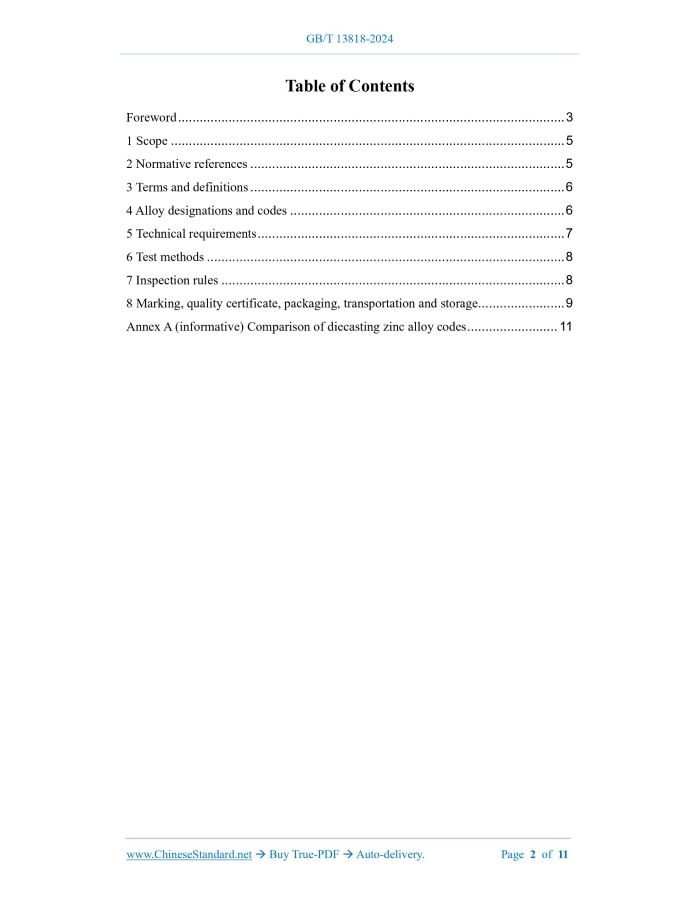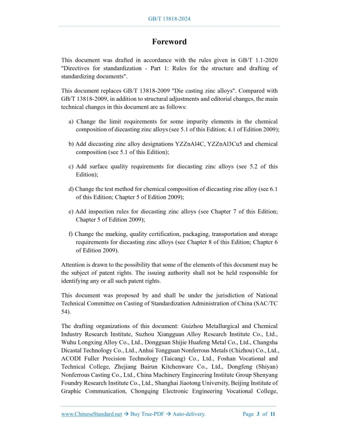 Similar standardsGB/T 13818-2024: Die casting zinc alloys---This is an excerpt. Full copy of true-PDF in English version (including equations, symbols, images, flow-chart, tables, and figures etc.), auto-downloaded/delivered in 9 seconds, can be purchased online: https://www.ChineseStandard.net/PDF.aspx/GBT13818-2024GB NATIONAL STANDARD OF THE PEOPLE’S REPUBLIC OF CHINA ICS 77.120.60 CCS J 31 Replacing GB/T 13818-2009 Diecasting zinc alloys Issued on. APRIL 25, 2024 Implemented on. APRIL 25, 2024 Issued by. State Administration for Market Regulation; Standardization Administration of the People's Republic of China. Table of ContentsForeword... 3 1 Scope... 5 2 Normative references... 5 3 Terms and definitions... 6 4 Alloy designations and codes... 6 5 Technical requirements... 7 6 Test methods... 8 7 Inspection rules... 8 8 Marking, quality certificate, packaging, transportation and storage... 9 Annex A (informative) Comparison of diecasting zinc alloy codes... 11ForewordThis document was drafted in accordance with the rules given in GB/T 1.1-2020 "Directives for standardization - Part 1.Rules for the structure and drafting of standardizing documents". This document replaces GB/T 13818-2009 "Die casting zinc alloys". Compared with GB/T 13818-2009, in addition to structural adjustments and editorial changes, the main technical changes in this document are as follows. a) Change the limit requirements for some impurity elements in the chemical composition of diecasting zinc alloys (see 5.1 of this Edition; 4.1 of Edition 2009); b) Add diecasting zinc alloy designations YZZnAl4C, YZZnAl3Cu5 and chemical composition (see 5.1 of this Edition); c) Add surface quality requirements for diecasting zinc alloys (see 5.2 of this Edition); d) Change the test method for chemical composition of diecasting zinc alloy (see 6.1 of this Edition; Chapter 5 of Edition 2009); e) Add inspection rules for diecasting zinc alloys (see Chapter 7 of this Edition; Chapter 5 of Edition 2009); f) Change the marking, quality certification, packaging, transportation and storage requirements for diecasting zinc alloys (see Chapter 8 of this Edition; Chapter 6 of Edition 2009). Attention is drawn to the possibility that some of the elements of this document may be the subject of patent rights. The issuing authority shall not be held responsible for identifying any or all such patent rights. This document was proposed by and shall be under the jurisdiction of National Technical Committee on Casting of Standardization Administration of China (SAC/TC 54). The drafting organizations of this document. Guizhou Metallurgical and Chemical Industry Research Institute, Suzhou Xiangguan Alloy Research Institute Co., Ltd., Wuhu Longxing Alloy Co., Ltd., Dongguan Shijie Huafeng Metal Co., Ltd., Changsha Dicastal Technology Co., Ltd., Anhui Tongguan Nonferrous Metals (Chizhou) Co., Ltd., ACODI Fuller Precision Technology (Taicang) Co., Ltd., Foshan Vocational and Technical College, Zhejiang Bairun Kitchenware Co., Ltd., Dongfeng (Shiyan) Nonferrous Casting Co., Ltd., China Machinery Engineering Institute Group Shenyang Foundry Research Institute Co., Ltd., Shanghai Jiaotong University, Beijing Institute of Graphic Communication, Chongqing Electronic Engineering Vocational College, Yantai Vocational College, Shenyang University of Technology, Guangdong Hongtu Technology Co., Ltd., FAW Foundry Co., Ltd., Jiangshan Haiwei Technology Co., Ltd., CITIC Dicastal Co., Ltd., Yiwu Yunfei Zipper Co., Ltd., Weifeng Electronics (Guangdong) Co., Ltd., Nantong Hongjin Metal Aluminum Co., Ltd. Main drafters of this document. Xue Tao, Gu Wenquan, Chen Yinjie, Wang Zhongxun, Wang Heng, Wu Jian, Yang Xiaoyu, Liang Shiya, Yang Kang, Liang Yin, Wu Chunyan, Xiao Shanglong, Xu Lin, Qian Xiaofeng, Hu Zhongchao, Li Dongyu, Yang Zhaoling, Pan Yilei, Lü Jianpan, Liu Zhifa, Lin Yun, Yi Wei, Liu Jun, Zheng Xiaocui, Huang Hua, Jiang Yunfei, Huang Hongjun, Zhao Shizhi, Chang Yiqian. This document was first published in 1992.It was first revised in 2009.This is the second revision. Diecasting zinc alloys1 ScopeThis document specifies the designations and codes, technical requirements, test methods, inspection rules and markings, quality certificates, packaging, transportation and storage of diecasting zinc alloys. This document applies to the production and inspection of diecasting zinc alloys.2 Normative referencesThe following referenced documents are indispensable for the application of this document. For dated references, only the edition cited applies. For undated references, the latest edition of the referenced document (including any amendments) applies. GB/T 8738-2014, Zinc alloy ingots for casting GB/T 12689.1, The methods for chemical analysis of zinc and zinc alloys -- Part 1. -- The determination of aluminum content -- The chrome azurol S-polyethylene glycol octyl phenylether-cetylpyridine bromine spectrophotometric method and chrome azurol S spectrophotometric method GB/T 12689.3, The methods for chemical analysis of zinc and zinc alloys -- Part 3. -- The determination of cadmium content -- The flame atomic absorption spectrometric method GB/T 12689.4, The methods for chemical analysis of zinc and zinc alloys -- Part 4. -- The determination of copper content -- The lead diethyldithio-carbamate spectrophotometric method and the flame atomic absorption spectrometric method and the electrolytic method GB/T 12689.5, The methods for chemical analysis of zinc alloys -- Part 5.-- The determination of iron content -- The sulfosalicylic acid spectrometric method and the flame atomic absorption spectrometric method GB/T 12689.6, The methods for chemical analysis of zinc and zinc alloys -- Part 6. -- The determination of lead content -- The oscillopolarographic method3 Terms and definitionsThere are no terms or definitions that require definition in this document.4 Alloy designations and codes4.1 Expression methods for designations A diecasting zinc alloy designa