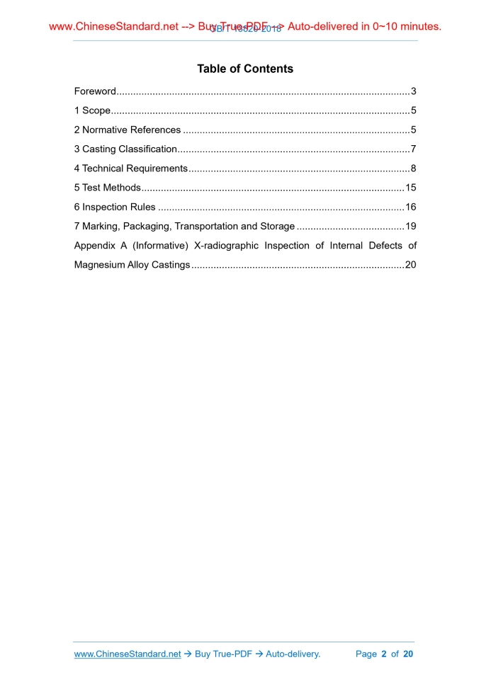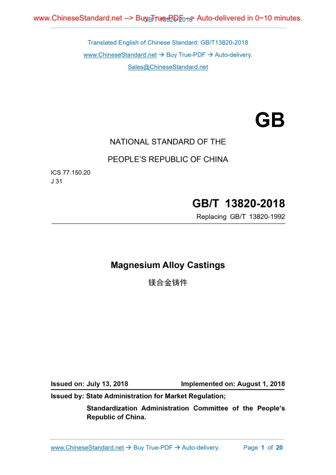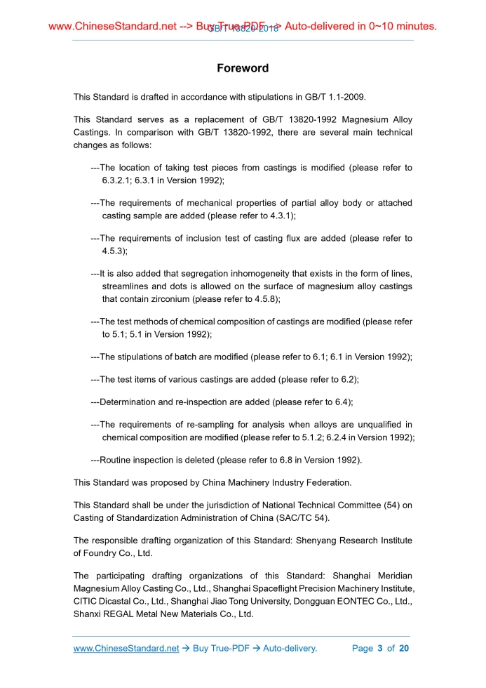 Similar standardsGB/T 13820-2018: Magnesium Alloy Castings---This is an excerpt. Full copy of true-PDF in English version (including equations, symbols, images, flow-chart, tables, and figures etc.), auto-downloaded/delivered in 9 seconds, can be purchased online: https://www.ChineseStandard.net/PDF.aspx/GBT13820-2018GB NATIONAL STANDARD OF THE PEOPLE’S REPUBLIC OF CHINA ICS 77.150.20 J 31 Replacing GB/T 13820-1992 Magnesium Alloy Castings Issued on: JULY 13, 2018 Implemented on: AUGUST 1, 2018 Issued by. State Administration for Market Regulation; Standardization Administration Committee of the People’s Republic of China. Table of ContentsForeword ... 3 1 Scope ... 5 2 Normative References ... 5 3 Casting Classification ... 7 4 Technical Requirements ... 8 5 Test Methods ... 15 6 Inspection Rules ... 16 7 Marking, Packaging, Transportation and Storage ... 19 Appendix A (Informative) X-radiographic Inspection of Internal Defects of Magnesium Alloy Castings ... 20ForewordThis Standard is drafted in accordance with stipulations in GB/T 1.1-2009. This Standard serves as a replacement of GB/T 13820-1992 Magnesium Alloy Castings. In comparison with GB/T 13820-1992, there are several main technical changes as follows. ---The location of taking test pieces from castings is modified (please refer to 6.3.2.1; 6.3.1 in Version 1992); ---The requirements of mechanical properties of partial alloy body or attached casting sample are added (please refer to 4.3.1); ---The requirements of inclusion test of casting flux are added (please refer to 4.5.3); ---It is also added that segregation inhomogeneity that exists in the form of lines, streamlines and dots is allowed on the surface of magnesium alloy castings that contain zirconium (please refer to 4.5.8); ---The test methods of chemical composition of castings are modified (please refer to 5.1; 5.1 in Version 1992); ---The stipulations of batch are modified (please refer to 6.1; 6.1 in Version 1992); ---The test items of various castings are added (please refer to 6.2); ---Determination and re-inspection are added (please refer to 6.4); ---The requirements of re-sampling for analysis when alloys are unqualified in chemical composition are modified (please refer to 5.1.2; 6.2.4 in Version 1992); ---Routine inspection is deleted (please refer to 6.8 in Version 1992). This Standard was proposed by China Machinery Industry Federation. This Standard shall be under the jurisdiction of National Technical Committee (54) on Casting of Standardization Administration of China (SAC/TC 54). The responsible drafting organization of this Standard. Shenyang Research Institute of Foundry Co., Ltd. The participating drafting organizations of this Standard. Shanghai Meridian Magnesium Alloy Casting Co., Ltd., Shanghai Spaceflight Precision Machinery Institute, CITIC Dicastal Co., Ltd., Shanghai Jiao Tong University, Dongguan EONTEC Co., Ltd., Shanxi REGAL Metal New Materials Co., Ltd. Magnesium Alloy Castings1 ScopeThis Standard specifies the classification, technical requirements, test methods, inspection rules, marking, packaging, transportation and storage of magnesium alloy castings (hereinafter referred to as “castings”). This Standard is applicable to magnesium alloy castings that are manufactured with sand casting and metal casting.2 Normative ReferencesThe following documents are indispensable to the application of this Standard. In terms of references with a specified date, only versions with a specified date are applicable to this Standard. The latest version (including all the modifications) of references without a specified date is also applicable to this Standard. GB/T 228.1 Metallic Materials - Tensile Testing - Part 1. Method of Test at Room Temperature GB/T 1177-2018 Casting Magnesium Alloys GB/T 6414 Castings - Dimensional Tolerances and Geometrical Tolerances and Machining Allowances GB/T 11351 Mass Tolerances of Casting GB/T 13748.1 Chemical Analysis Methods of Magnesium and Magnesium Alloys - Part 1. Determination of Aluminum Content GB/T 13748.4 Chemical Analysis Methods of Magnesium and Magnesium Alloys - Part 4. Determination of Manganese Content - Periodate Spectrophotometric Method GB/T 13748.6 Chemical Analysis Methods of Magnesium and Magnesium Alloys - Determination of Silver Content - Determination of Silver Content - Flame Atomic Absorption Spectrophotometric Method GB/T 13748.7 Chemical Analysis Methods of Magnesium and Magnesium Alloys - Part 7. Determination of Zirconium Content GB/T 13748.8 Chemical Analysis Methods of Magnesium and Magnesium Alloys - Part 8. Determination of Rare Earth Content - Gravimetric Method GB/T 13748.9 Chemical Analysis Methods of Magnesium and Magnesium Alloys - Part 9. Determination of Iron Content - O-phenanthroline Spectrophotometric Method GB/T 13748.10 Chemical Analysis Methods of Magnesium and Magnesium Alloys - Part 9. Determination of Silicon Content - Molybdenum Blue Spectrophotometric Method GB/T 13748.11 Chemical Analysis Methods of Magnesium and Magnesium Alloys - Determination of Beryllium Content - Solochrome Cyanine R Spectrophotometric Method GB/T 13748.12 Chemical Analysis Methods of Magnesium and Magnesium Alloys - Part 12. Determination of Copper Content GB/T 13748.14 Chemical Analysis Methods of Magnesium and Magnesium Alloys - Part 14. Determination of Nickel Content - Dimethylglyoxime Trophotometric Method GB/T 13748.15 Chemical Analysis Methods of Magnesium and Magnesium Alloys - Part 15. Determination of Zinc Content GB/T 13748.20 Chemical Analysis Methods of Magnesium and Magnesium Alloys - Part 20. Determination of Elements by Inductively Coupled Plasma Atomic Emission Spectrometry GB/T 13748.21 Chemical Analysis Methods of Magnesium and Magnesium Alloys - Part 21. Determination of Elements by Photoelectric Direct Reading Atomic Emission Spectrometry GB/T 13748.22 Chemical Analysis Methods of Magnesium and Magnesium Alloys - Part 21. Determination of Thorium Content GB/T 15056