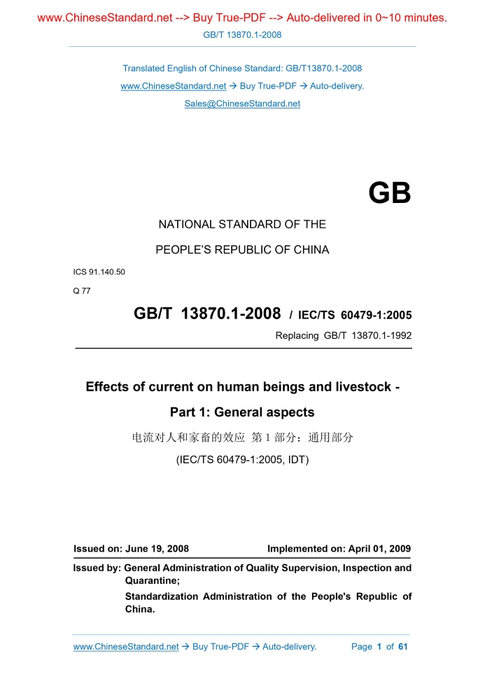 GB/T 13870.1-2008: Effects of current on human beings and livestock -- Part 1: General aspects Delivery: 9 seconds. True-PDF full-copy in English & invoice will be downloaded + auto-delivered via email. See step-by-step procedure Status: Obsolete GB/T 13870.1: Historical versions