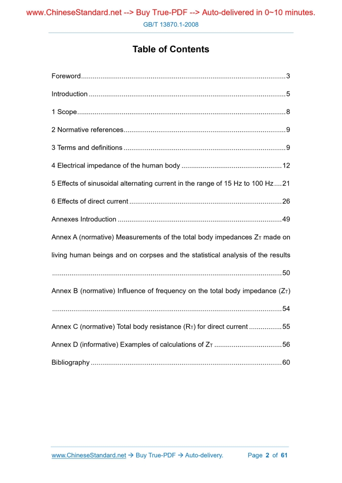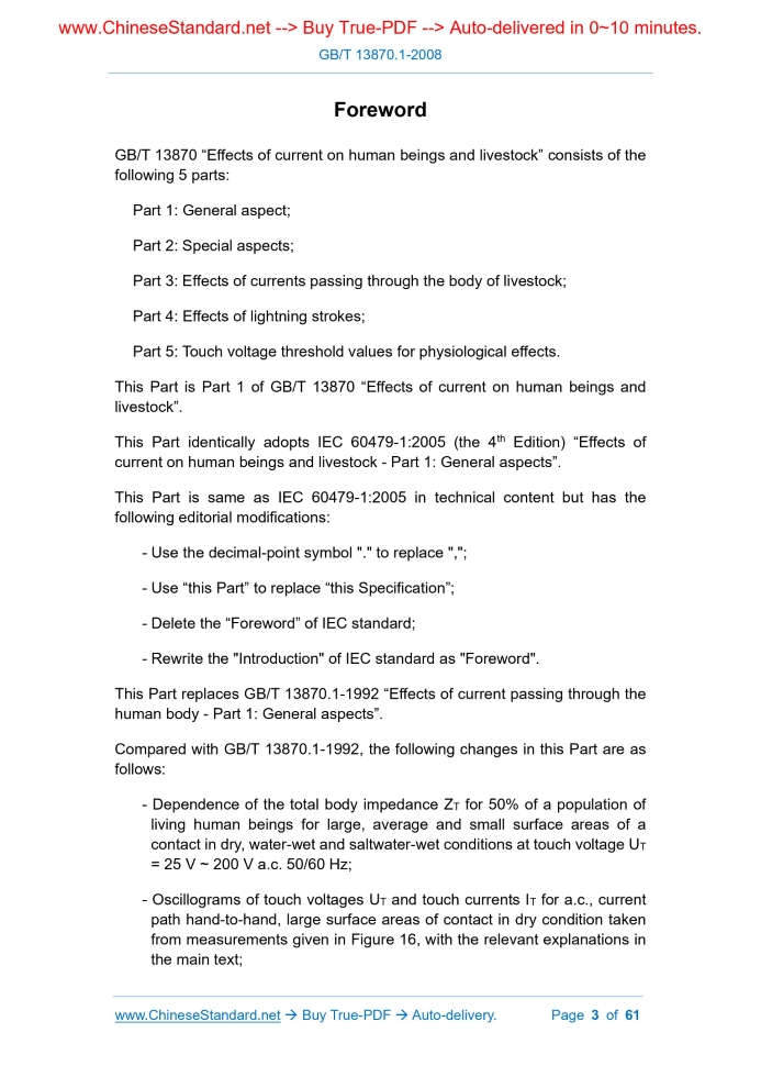 Similar standardsGB/T 13870.1-2008: Effects of current on human beings and livestock -- Part 1: General aspects---This is an excerpt. Full copy of true-PDF in English version (including equations, symbols, images, flow-chart, tables, and figures etc.), auto-downloaded/delivered in 9 seconds, can be purchased online: https://www.ChineseStandard.net/PDF.aspx/GBT13870.1-2008Effects of current on human beings and livestock. Part 1.General aspects ICS 91.140.50 Q77 National Standards of People's Republic of China GB/T 13870.1-2008/IEC /TS 60479-1.1..2005 Replaces GB/T 13878.1-292 Effects of electricity on people and livestock Part 1.General part (IEC /T S64979-1..2005, IDT) 2008-06-19 released 2009-04-01 implementation General Administration of Quality Supervision, Inspection and Quarantine of the People's Republic of China Published by China National Standardization Administration Table of ContentsForeword III Introduction IV 1 Scope 1 2 Normative references 1 3 Terms and definitions 1 4 Human body impedance 3 5 Effect of sinusoidal AC current in the range of 15 Hz to 100 Hz 6 Effect of DC current 12 Appendix Introduction 27 Appendix A (Normative Appendix) Measurement of Total Human Impedance ZT on Living People and Corpses and Statistical Analysis of Results 28 Appendix B (Normative Appendix) Impact of Frequency on Total Body Impedance (ZT) 30 Appendix C (Normative Appendix) Total Human Resistance (RT) of Direct Current 31 Appendix D (informative) Examples of ZT calculations 32 References 34 GB/T 13870.1-2008/IEC /TS 60479-1.1..2005ForewordGB/T 13870 "Effect of electric current on people and livestock" is divided into the following 5 parts. Part 1.General part; Part 2.Special circumstances; Part 3.The effect of current passing through the animal's body; Part 4.Effects of lightning currents passing through human and livestock bodies; Part 5.Contact voltage thresholds for physiological effects. This part is the first part of GB/T 13870 "Effect of electric current on people and livestock". This part is equivalent to adopting IEC 60479-1..2005 (4th edition) "Effects of current on people and livestock-Part 1.General part". This section is the same in technical content as IEC 60479-1..2005, but contains the following editorial changes. --- Replace the decimal symbol "," with the decimal symbol "."; --- Replace "this technical specification" with "this section"; --- Deleted the "preface" of the IEC standard; --- Rewrite the "Introduction" of the IEC Standard to "Introduction". This section replaces GB/T 13870.1-1992 "Effects of current on people and livestock-Part 1.General part". Compared with GB/T 13870.1-1992, this section has the following main changes. --- AC contact voltage UT of 50/60Hz from 25V to.200V. Under dry, wet conditions such as saline, 50% of living The relationship between the subject's total body impedance ZT and large, medium, and small contact surface areas. --- Figure 16 shows the AC contact voltage UT and contact measured in dry conditions with large contact surface area and hand-to-hand current path. Oscillogram of current IT. There are related instructions in the main text. --- The fibrillation data shown in Figure 19 are taken from experiments for dogs, pigs, and sheep, and humans use human impedance ZT (5%), Current contact voltage UT = 220V to 380V, taken from the statistics of electrical accidents in the transverse direction of the current flowing from hand to hand Count. There are related instructions in the main text. --- In Figure 20, curve B is from 10mA to 5mA, the time/current zone of the effect of the agreed AC (15Hz ~ 100Hz) current on people. area. There are related instructions in the main text. --- The shed current of 60Hz sine current given in Figure 23 is explained in the main text. --- About the new structure of the standard human body. Appendix A, Appendix B, and Appendix C of this part are normative appendixes, and Appendix D is an informative appendix. This part is proposed and managed by the National Technical Committee for Standardization of Building Electrical Installations (SAC/TC205). This section is responsible for drafting units. CMC Design & Research Institute. The main drafters of this section. Wang Zengyao, He Xiangyu, Huang Baosheng. The previous versions of the standards replaced by this section are. --- GB/T 13878.1-292. GB/T 13870.1-2008/IEC /TS 60479-1.1..2005introductionThis part is equivalent to adopting IEC 60479-1..2005 (4th edition) "Effects of Electric Current on People and Livestocks Part 1.General Part", IEC This publication was published as a technical specification, and its contents are explained in the "Introduction" of the technical specification. This technical specification provides basic guidance on the effects of electric shock currents on people and livestock for use in developing electrical safety requirements. In order to avoid errors in interpreting this technical specification, it must be stated that the data listed are mainly based on tests performed on animals and by Data obtained from clinical observations. Only a few short-term electric shock tests have been performed on living people. Because the data obtained from the research on animals are too conservative, the technical specifications are normal for those with normal physiological conditions including children. Suitable for everyone, regardless of age and weight. however. There are other aspects to consider, such as the probability of failure, the probability of contact with a live or faulty part, the contact voltage Ratio to fault voltage, existing experience, technical feasibility, and economic issues. When specifying safety requirements, these parameters All must be carefully considered, such as stipulating the working characteristics of protective appliances in electrical installations. The reason why it takes the form of technical specifications is that it brings together the results obtained so far, and these results are being used by the IEC technical