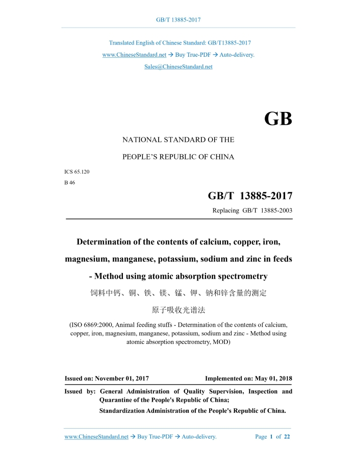 GB/T 13885-2017: Determination of the contents of calcium, copper, iron, magnesium, manganese, potassium, sodium and zinc in feeds -- Method using atomic absorption spectrometry Delivery: 9 seconds. True-PDF full-copy in English & invoice will be downloaded + auto-delivered via email. See step-by-step procedure Status: Valid GB/T 13885: Historical versions
