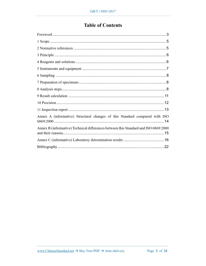 Similar standardsGB/T 13885-2017: Determination of the contents of calcium, copper, iron, magnesium, manganese, potassium, sodium and zinc in feeds -- Method using atomic absorption spectrometry---This is an excerpt. Full copy of true-PDF in English version (including equations, symbols, images, flow-chart, tables, and figures etc.), auto-downloaded/delivered in 9 seconds, can be purchased online: https://www.ChineseStandard.net/PDF.aspx/GBT13885-2017 GB NATIONAL STANDARD OF THE PEOPLE’S REPUBLIC OF CHINA ICS 65.120 B 46 Replacing GB/T 13885-2003 Determination of the contents of calcium, copper, iron, magnesium, manganese, potassium, sodium and zinc in feeds - Method using atomic absorption spectrometry (ISO 6869:2000, Animal feeding stuffs - Determination of the contents of calcium, copper, iron, magnesium, manganese, potassium, sodium and zinc - Method using atomic absorption spectrometry, MOD) ISSUED ON: NOVEMBER 01, 2017 IMPLEMENTED ON: MAY 01, 2018 Issued by: General Administration of Quality Supervision, Inspection and Quarantine of the People's Republic of China; Standardization Administration of the People's Republic of China. Table of ContentsForeword ... 3 1 Scope ... 5 2 Normative references ... 5 3 Principle ... 6 4 Reagents and solutions ... 6 5 Instruments and equipment ... 7 6 Sampling ... 8 7 Preparation of specimens ... 8 8 Analysis steps ... 8 9 Result calculation ... 11 10 Precision ... 12 11 Inspection report ... 13 Annex A (informative) Structural changes of this Standard compared with ISO 6869:2000 ... 14 Annex B (informative) Technical differences between this Standard and ISO 6869:2000 and their reasons ... 15 Annex C (informative) Laboratory determination results ... 16 Bibliography ... 22 Determination of the contents of calcium, copper, iron, magnesium, manganese, potassium, sodium and zinc in feeds - Method using atomic absorption spectrometry1 ScopeThis document specifies the method that uses atomic absorption spectrometry to determine the contents of calcium (Ca), copper (Cu), iron (Fe), magnesium (Mg), manganese (Mn), potassium (K), sodium (Na) and zinc (Zn) in feeds. This Standard is applicable to the determination of the contents of calcium (Ca), copper (Cu), iron (Fe), magnesium (Mg), manganese (Mn), potassium (K), sodium (Na) and zinc (Zn) in compound feeds, concentrate feeds, concentrate supplements, additive premixes and feed ingredients. The detection limit of each element content of this method is: K, Na: 500mg/kg; Ca, Mg: 50mg/kg; Cu, Fe, Mn, Zn: 5mg/kg.2 Normative referencesThe following referenced documents are indispensable for the application of this document. For dated references, only the edition cited applies. For undated references, the latest edition of the referenced document (including any amendments) applies. GB/T 6682, Water for analytical laboratory use - Specification and test methods (GB/T 6682-2008, ISO 3696:1987, MOD) GB/T 14699.1, Feeding stuffs - Sampling (GB/T 14699.1-2005, ISO 6497:2002, IDT) GB/T 20195, Animal feeding stuffs - Preparation of test samples (GB/T 20195-2006, ISO 6498:1998, IDT) constant. The contents of Cu, Fe, Mn and Zn in this Standard solution are all 20μg/mL. The standard solution shall be prepared on the day of use. 4.9 Standard stock solutions of Ca, K, Mg, Na: Weigh the following reagents into a 1L volumetric flask: - 1.907g of potassium chloride (KCl); - 2.028g of magnesium sulfate (MgSO4·7H2O); - 2.542g of sodium chloride (NaCl). Weigh 2.497g of calcium carbonate (CaCO3) into the beaker. Add 50mL of hydrochloric acid solution (4.3). CAUTION: Be careful of the carbon dioxide produced. Heat on a heating plate for 5min. After cooling, transfer the solution to a volumetric flask containing K, Mg, Na salts. Use hydrochloric acid solution (4.4) to set the volume constant. The contents of Ca, K and Na in this stock solution are all 1mg/mL. The content of Mg is 200μg/mL. NOTE: Commercially available standard solutions can be used. 4.10 Standard solutions of Ca, K, Mg, Na: Accurately pipette 25.0mL of stock solution (4.9) into a 250mL volumetric flask. Use hydrochloric acid solution (4.4) to set the volume constant. The contents of Ca, K and Na in this standard solution are all 100μg/mL. The content of Mg is 20μg/mL. The prepared standard solutions are stored in polyethylene bottles. They can be used within 1 week. 4.11 Lanthanum/cesium blank solution: Take 5mL of lanthanum nitrate solution, 5mL of cesium chloride solution and 5mL of hydrochloric acid solution (4.3) into a 100mL volumetric flask. Use water to set the volume constant.5 Instruments and equipmentAll containers, including pipettes for preparing standard solutions, are rinsed with hydrochloric acid solution (4.4) before use. If special ashing crucibles and glassware are used, there is no need to boil them with hydrochloric acid solution before each use. Common laboratory equipment and special equipment are as follows. 5.1 Analytical balance: the resolution is 0.1mg. 5.2 Crucible: platinum, quartz or porcelain; free of potassium and sodium; the inner layer is smooth and not corroded; the upper diameter is 4cm~6cm; the lower diameter is 2cm~2.5cm; the height is about 5cm; boil with hydrochloric acid solution (4.3) before use. 5.3 Rigid glassware. Boil with hydrochloric acid solution (4.3) before use. Rinse off with water. 5.4 Heating plate. 5.5 High temperature resistance furnace: the temperature can be controlled at 550℃±15℃. 5.6 Atomic absorption spectrophotometer: the wavelength range complies with the provisions of 8.6.1 and 8.7.1. It is with air-acetylene flame and background correction. 5.7 Ca, Cu, Fe, K, Mg, Mn, Na, Zn hollow cathode lamps or electrodeless discharge lamps. 5.8 Quantitative filter paper.6 SamplingThis Standard does not specify the sampling method. It is recommended to sample according to the method in GB/T 14699.1. It is very important for the laboratory to obtain representative samples. Samples must not be damaged or