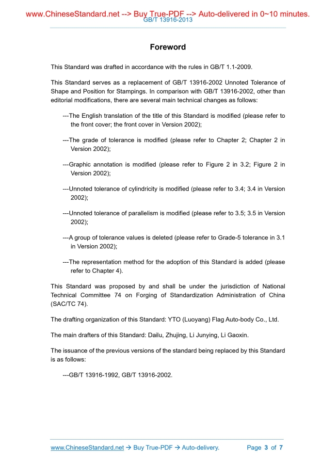 Similar standardsGB/T 13916-2013: Unnoted tolerance of shape and position for stamping parts---This is an excerpt. Full copy of true-PDF in English version (including equations, symbols, images, flow-chart, tables, and figures etc.), auto-downloaded/delivered in 9 seconds, can be purchased online: https://www.ChineseStandard.net/PDF.aspx/GBT13916-2013NATIONAL STANDARD OF THE PEOPLE’S REPUBLIC OF CHINA ICS 25.020 J 32 Replacing GB/T 13916-2002 Unnoted Tolerance of Shape and Position for Stamping Parts Issued on. JUNE 9, 2013 Implemented on. MARCH 1, 2014 Issued by. General Administration of Quality Supervision, Inspection and Quarantine; Standardization Administration of the People’s Republic of China. Table of ContentsForeword... 3 1 Scope... 4 2 Grade of Tolerance... 4 3 Numerical Value of Tolerance... 4 4 Representation Method for Adoption of this Standard... 7ForewordThis Standard was drafted in accordance with the rules in GB/T 1.1-2009. This Standard serves as a replacement of GB/T 13916-2002 Unnoted Tolerance of Shape and Position for Stampings. In comparison with GB/T 13916-2002, other than editorial modifications, there are several main technical changes as follows. ---The English translation of the title of this Standard is modified (please refer to the front cover; the front cover in Version 2002); ---The grade of tolerance is modified (please refer to Chapter 2; Chapter 2 in Version 2002); ---Graphic annotation is modified (please refer to Figure 2 in 3.2; Figure 2 in Version 2002); ---Unnoted tolerance of cylindricity is modified (please refer to 3.4; 3.4 in Version 2002); ---Unnoted tolerance of parallelism is modified (please refer to 3.5; 3.5 in Version 2002); ---A group of tolerance values is deleted (please refer to Grade-5 tolerance in 3.1 in Version 2002); ---The representation method for the adoption of this Standard is added (please refer to Chapter 4). This Standard was proposed by and shall be under the jurisdiction of National Technical Committee 74 on Forging of Standardization Administration of China (SAC/TC 74). The drafting organization of this Standard. YTO (Luoyang) Flag Auto-body Co., Ltd. The main drafters of this Standard. Dailu, Zhujing, Li Junying, Li Gaoxin. The issuance of the previous versions of the standard being replaced by this Standard is as follows. ---GB/T 13916-1992, GB/T 13916-2002. Unnoted Tolerance of Shape and Position for Stamping Parts1 ScopeThis Standard stipulates the unnoted tolerance grade and numerical value of straightness, flatness, concentricity and symmetry for metal stamping parts; it also stipulates the unnoted tolerance of roundness, cylindricity, parallelism, perpendicularity and gradient for metal stamping parts. This Standard is applicable to stamping parts for metal plates.2 Grade of ToleranceUnnoted tolerance of straightness, flatness, concentricity and symmetry for stamping parts shall be divided into four grades, namely, f (fine), m (middle), c (coarse), v (very coarse).3 Numerical Value of Tolerance3.1 Unnoted Tolerance of Straightness and Flatness Unnoted tolerance of straightness and flatness shall comply with the stipulations in Table 1.Unnoted tolerance of flatness shall select a longer side as the main parameter. 3.3 Unnoted Tolerance of Roundness Unnoted tolerance of roundness shall be not more than the corresponding dimensional tolerance. 3.4 Unnoted Tolerance of Cylindricity Unnoted tolerance of cylindricity is constituted of 3 parts. roundness, straightness and parallelism tolerance of relative generatrix. Each tolerance is controlled by its noted tolerance or unnoted tolerance; inclusion requirements may be adopted. 3.5 Unnoted Tolerance of Parallelism Unnoted tolerance of parallelism equals to dimensional tolerance, or, flatness (straightness) tolerance. The larger value between them shall prevail.4 Representation Method for Adoption of this StandardWhen the unnoted tolerance stipulated in this Standard is adopted, it shall be represented through the serial No. of this Standard and the symbols of tolerance grade in corresponding drawings and technical documents. ......Source: Above contents are excerpted from the full-copy PDF -- translated/reviewed by: www.ChineseStandard.net / Wayne Zheng et al. Tips & Frequently Asked Questions:Question 1: How long will the true-PDF of English version of GB/T 13916-2013 be delivered?Answer: The full copy PDF of English version of GB/T 13916-2013 can be downloaded in 9 seconds, and it will also be emailed to you in 9 seconds (double mechanisms to ensure the delivery reliably), with PDF-invoice.Question 2: Can I share the purchased PDF of GB/T 13916-2013_English with my colleagues?Answer: Yes. The purchased PDF of GB/T 13916-2013_English will be deemed to be sold to your employer/organization who actually paid for it, including your colleagues and your employer's intranet.Question 3: Does the price include tax/VAT?Answer: Yes. Our tax invoice, downloaded/delivered in 9 seconds, includes all tax/VAT and complies with 100+ countries' tax regulations (tax exempted in 100+ countries) -- See Avoidance of Double Taxation Agreements (DTAs): List of DTAs signed between Singapore and 100+ countriesQuestion 4: Do you accept my currency other than USD?Answer: Yes. www.ChineseStandard.us -- GB/T 13916-2013 -- Click this link and select your country/currency to pay, the exact amount in your currency will be printed on the invoice. Full PDF will also be downloaded/emailed in 9 seconds.Question 5: Should I purchase the latest version GB/T 13916-2013?Answer: Yes. Unless special scenarios such as technical constraints or academic study, you should always prioritize to purchase the latest version GB/T 13916-2013 even if the enforcement date is in future. Complying with the latest version means that, by default, it also complies with all the earlier versions, technically.How to buy and download a true PDF of English version of GB/T 13916-2013?A step-by-step guide to download PDF of GB/T