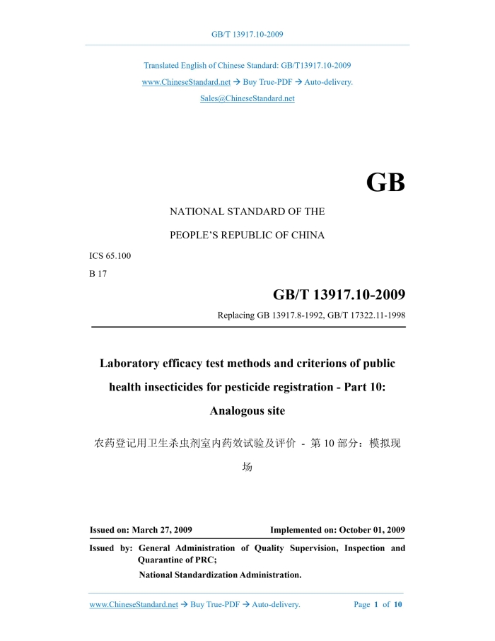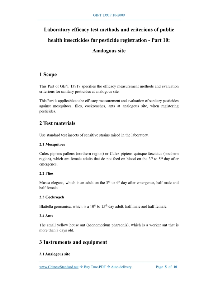 GB/T 13917.10-2009: Laboratory efficacy test methods and criterions of public health insecticides for pesticide registration -- Part 10: Analogous site Delivery: 9 seconds. True-PDF full-copy in English & invoice will be downloaded + auto-delivered via email. See step-by-step procedure Status: Valid