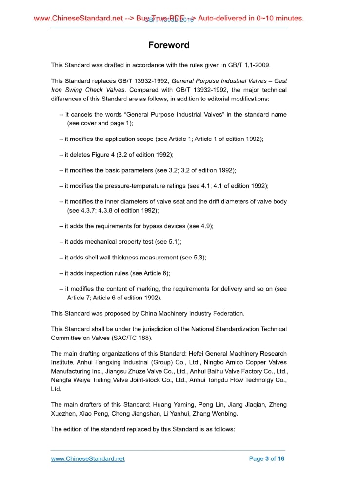 Similar standardsGB/T 13932-2016: Cast Iron Swing Check Valves---This is an excerpt. Full copy of true-PDF in English version (including equations, symbols, images, flow-chart, tables, and figures etc.), auto-downloaded/delivered in 9 seconds, can be purchased online: https://www.ChineseStandard.net/PDF.aspx/GBT13932-2016GB NATIONAL STANDARD OF THE PEOPLE’S REPUBLIC OF CHINA ICS 23.060.50 J 16 Replacing GB/T 13932-1992 Cast Iron Swing Check Valves Issued on: AUGUST 29, 2016 Implemented on: MARCH 1, 2017 Issued by. General Administration of Quality Supervision, Inspection and Quarantine of the People's Republic of China; Standardization Administration of the People's Republic of China. Table of ContentsForeword ... 3 1 Application Scope ... 5 2 Normative References ... 5 3 Structures and Basic Parameters ... 6 4 Technical Requirements ... 9 5 Test Methods ... 13 6 Inspection Rules ... 14 7 Requirements for Marking and Delivery ... 15ForewordThis Standard was drafted in accordance with the rules given in GB/T 1.1-2009. This Standard replaces GB/T 13932-1992, General Purpose Industrial Valves – Cast Iron Swing Check Valves. Compared with GB/T 13932-1992, the major technical differences of this Standard are as follows, in addition to editorial modifications. -- it cancels the words “General Purpose Industrial Valves” in the standard name (see cover and page 1); -- it modifies the application scope (see Article 1; Article 1 of edition 1992); -- it deletes Figure 4 (3.2 of edition 1992); -- it modifies the basic parameters (see 3.2; 3.2 of edition 1992); -- it modifies the pressure-temperature ratings (see 4.1; 4.1 of edition 1992); -- it modifies the inner diameters of valve seat and the drift diameters of valve body (see 4.3.7; 4.3.8 of edition 1992); -- it adds the requirements for bypass devices (see 4.9); -- it adds mechanical property test (see 5.1); -- it adds shell wall thickness measurement (see 5.3); -- it adds inspection rules (see Article 6); -- it modifies the content of marking, the requirements for delivery and so on (see Article 7; Article 6 of edition 1992). This Standard was proposed by China Machinery Industry Federation. This Standard shall be under the jurisdiction of the National Standardization Technical Committee on Valves (SAC/TC 188). The main drafting organizations of this Standard. Hefei General Machinery Research Institute, Anhui Fangxing Industrial (Group) Co., Ltd., Ningbo Amico Copper Valves Manufacturing Inc., Jiangsu Zhuze Valve Co., Ltd., Anhui Baihu Valve Factory Co., Ltd., Nengfa Weiye Tieling Valve Joint-stock Co., Ltd., Anhui Tongdu Flow Technolgy Co., Ltd. The main drafters of this Standard. Huang Yaming, Peng Lin, Jiang Jiaqian, Zheng Xuezhen, Xiao Peng, Cheng Jiangshan, Li Yanhui, Zhang Wenbing. The edition of the standard replaced by this Standard is as follows. Cast Iron Swing Check Valves1 Application ScopeThis Standard specifies the structures, technical requirements, test methods, inspection rules, and requirements for marking and delivery of cast iron swing check valves. This Standard applies to grey cast iron and spheroidal graphite cast iron swing check valves connected with flanges, whose nominal pressure is PN 2.5 ~ PN 25, nominal dimension DN 50 ~ DN 1800 and medium water (hereinafter referred to as “check valves”).2 Normative ReferencesThe following referenced documents are indispensable for the application of this document. For dated references, only the edition dated applies to this document. For undated references, the latest edition of the referenced documents (including all amendments) applies to this Standard. GB/T 152.1, Fasteners – Clearance Holes for Rivets GB/T 152.2, Fasteners – Countersinks for Countersunk Head Screws GB/T 152.4, Fasteners - Counterbores for Hexagon Bolts and Nuts GB/T 228.1, Metallic Materials – Tensile Testing – Part 1. Method for Test at Room Temperature GB/T 229, Metallic Materials – Charpy Pendulum Impact Test Method GB/T 1184-1996, Geometrical Tolerancing – Geometrical Tolerance for Features without Individual Tolerance Indications GB/T 1348, Spheroidal Graphite Iron Castings GB/T 9439, Grey Iron Castings GB/T 12220, Industrial Valves – Marking GB/T 12221, Metal Valves – Face to Face, End to End, Center to Face and Center to End Dimensions GB/T 12226, General Purpose Industrial Valve – Specification of Flake Graphite Iron Castings 4.5.2 The sealing surface between valve body and valve disc can be processed directly on valve body and valve disc or inserted with sealing ring or overlaid with other metals. If the sealing surface is overlaid, the thickness of overlaying after processing shall not be smaller than 2 mm. 4.6 Rocker The connection between rocker and valve disc and valve body shall rotate flexibly; it shall be ensured that the connecting place between rocker and valve body is secure and will not loosen during use. 4.7 Filtering screen For check valves equipped with filtering screen, the total area of filtering holes in filtering screen shall be greater than 1.5 times of the sectional area of nominal dimensions. 4.8 Buffer device All types of buffer devices can be provided for check valves as required by the user; consideration shall be given to that butterfly and valve stem shall have sufficient safety coefficient after buffer devices are provided. 4.9 Bypass Swing multiple-disc horizontal check valves of nominal dimensions not smaller than DN800 whose nominal pressure is not smaller than PN6 and nominal dimensions not smaller than DN1200, nominal pressure not smaller than PN10 and nominal dimensions not smaller than DN800 shall be provided with bypass pipelines. 4.10 Materials The materials of the major parts of check valves shall be selected in accordance with JB/T 5300. Grey cast iron shall be as specified in GB/T 12226; spheroidal graphite cast iron shall be as specified in GB/T 12227. Other materials shall meet the requirements of relevant materials standards. 4.1