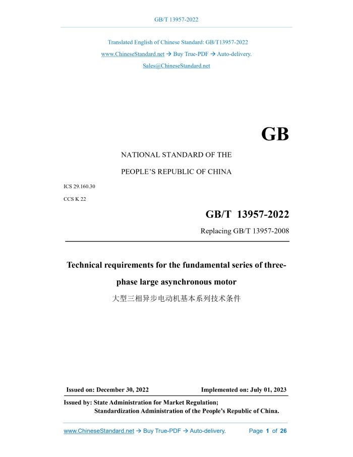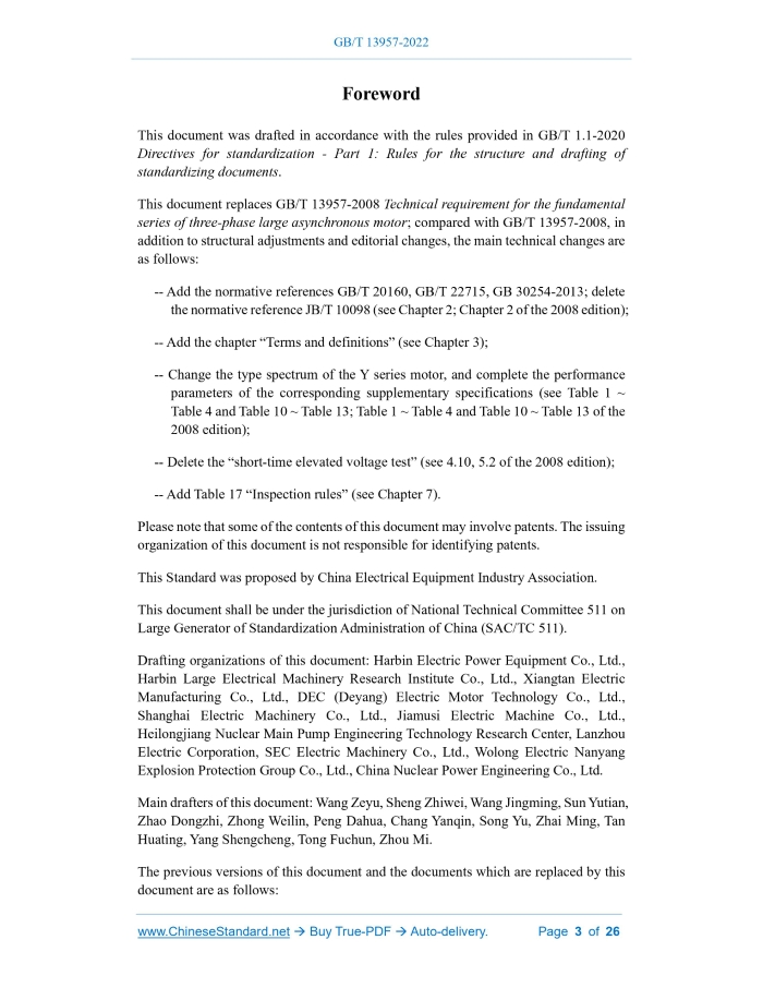 Similar standardsGB/T 13957-2022: Technical requirements for the fundamental series of three-phase large asynchronous motor---This is an excerpt. Full copy of true-PDF in English version (including equations, symbols, images, flow-chart, tables, and figures etc.), auto-downloaded/delivered in 9 seconds, can be purchased online: https://www.ChineseStandard.net/PDF.aspx/GBT13957-2022 GB NATIONAL STANDARD OF THE PEOPLE’S REPUBLIC OF CHINA ICS 29.160.30 CCS K 22 Replacing GB/T 13957-2008 Technical requirements for the fundamental series of three- phase large asynchronous motor ISSUED ON: DECEMBER 30, 2022 IMPLEMENTED ON: JULY 01, 2023 Issued by: State Administration for Market Regulation; Standardization Administration of the People’s Republic of China. Table of ContentsForeword ... 3 1 Scope ... 5 2 Normative references ... 5 3 Terms and definitions ... 6 4 Types, basic parameters and dimensions ... 6 5 Technical requirements ... 14 6 Test methods ... 22 7 Inspection rules ... 23 8 Marking, packaging and warranty period ... 24ForewordThis document was drafted in accordance with the rules provided in GB/T 1.1-2020 Directives for standardization - Part 1: Rules for the structure and drafting of standardizing documents. This document replaces GB/T 13957-2008 Technical requirement for the fundamental series of three-phase large asynchronous motor; compared with GB/T 13957-2008, in addition to structural adjustments and editorial changes, the main technical changes are as follows: -- Add the normative references GB/T 20160, GB/T 22715, GB 30254-2013; delete the normative reference JB/T 10098 (see Chapter 2; Chapter 2 of the 2008 edition); -- Add the chapter “Terms and definitions” (see Chapter 3); -- Change the type spectrum of the Y series motor, and complete the performance parameters of the corresponding supplementary specifications (see Table 1 ~ Table 4 and Table 10 ~ Table 13; Table 1 ~ Table 4 and Table 10 ~ Table 13 of the 2008 edition); -- Delete the “short-time elevated voltage test” (see 4.10, 5.2 of the 2008 edition); -- Add Table 17 “Inspection rules” (see Chapter 7). Please note that some of the contents of this document may involve patents. The issuing organization of this document is not responsible for identifying patents. This Standard was proposed by China Electrical Equipment Industry Association. This document shall be under the jurisdiction of National Technical Committee 511 on Large Generator of Standardization Administration of China (SAC/TC 511). Drafting organizations of this document: Harbin Electric Power Equipment Co., Ltd., Harbin Large Electrical Machinery Research Institute Co., Ltd., Xiangtan Electric Manufacturing Co., Ltd., DEC (Deyang) Electric Motor Technology Co., Ltd., Shanghai Electric Machinery Co., Ltd., Jiamusi Electric Machine Co., Ltd., Heilongjiang Nuclear Main Pump Engineering Technology Research Center, Lanzhou Electric Corporation, SEC Electric Machinery Co., Ltd., Wolong Electric Nanyang Explosion Protection Group Co., Ltd., China Nuclear Power Engineering Co., Ltd. Main drafters of this document: Wang Zeyu, Sheng Zhiwei, Wang Jingming, Sun Yutian, Zhao Dongzhi, Zhong Weilin, Peng Dahua, Chang Yanqin, Song Yu, Zhai Ming, Tan Huating, Yang Shengcheng, Tong Fuchun, Zhou Mi. The previous versions of this document and the documents which are replaced by this document are as follows: Technical requirements for the fundamental series of three- phase large asynchronous motor1 ScopeThis document specifies the type, basic parameters and dimensions, technical requirements, inspection rules, test methods, as well as requirements for the marking, packaging and warranty period, of three-phase large asynchronous motor. This document applies to large-scale Y series four-pole and above general-purpose cage-rotor three-phase asynchronous motors (hereinafter referred to as “Y series motors”) and large-scale YR series four-pole and above general-purpose wound-rotor three-phase asynchronous motors (hereinafter referred to as “YR series motors”). The center heights are 710 mm, 800 mm, 900 mm, 1 000 mm and 1 120 mm, respectively. It applies to large-scale YKS, YRKS series three-phase asynchronous motors as a reference.2 Normative referencesThe following documents are referred to in the text in such a way that some or all of their content constitutes requirements of this document. For dated references, only the version corresponding to that date is applicable to this document; for undated references, the latest version (including all amendments) is applicable to this document. GB/T 191, Packaging - Pictorial marking for handling of goods GB/T 755, Rotating electrical machines - Rating and performance GB/T 997, Classification of types of construction, mounting arrangements and terminal box position (IM Code) for rotating electrical machines GB/T 1032, Test procedures for three-phase induction motors GB/T 1096, Square and rectangular keys GB/T 1971, Rotating electrical machines - Terminal markings and direction of rotation GB/T 1974, Tangential keys and keyways GB/T 1993, Cooling methods for rotating electrical machines GB/T 4772.2, Dimensions and output series for rotating electrical machines - Part 2: Frame numbers 355 to 1000 and flange numbers 1180 to 2360 GB/T 4831, Specification for model of rotating electrical motor GB/T 4942, Degrees of protection provided by the integral design of rotating electrical machines (IP code) - Classification GB/T 10068, Mechanical vibration of certain machines with shaft heights 56 mm and higher - Measurement, evaluation and limits of vibration severity GB/T 10069.1, Measurement of airborne noise emitted by rotating electrical machines and the noise limits - Part 1: Method for the measurement of airborne noise emitted by rotating electrical machines GB/T 10069.3, Measurement of airborne noise emitted by rotating electrical machines and the noise limits - Part 3: Noise limits GB/T 20160, Recommended practice fo