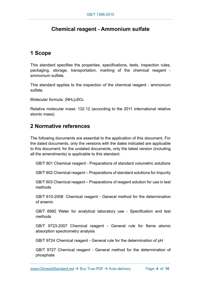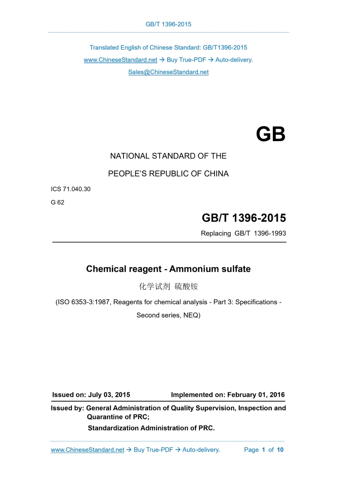 GB/T 1396-2015: Chemical reagent -- Ammonium sulfate Delivery: 9 seconds. True-PDF full-copy in English & invoice will be downloaded + auto-delivered via email. See step-by-step procedure Status: Valid GB/T 1396: Historical versions