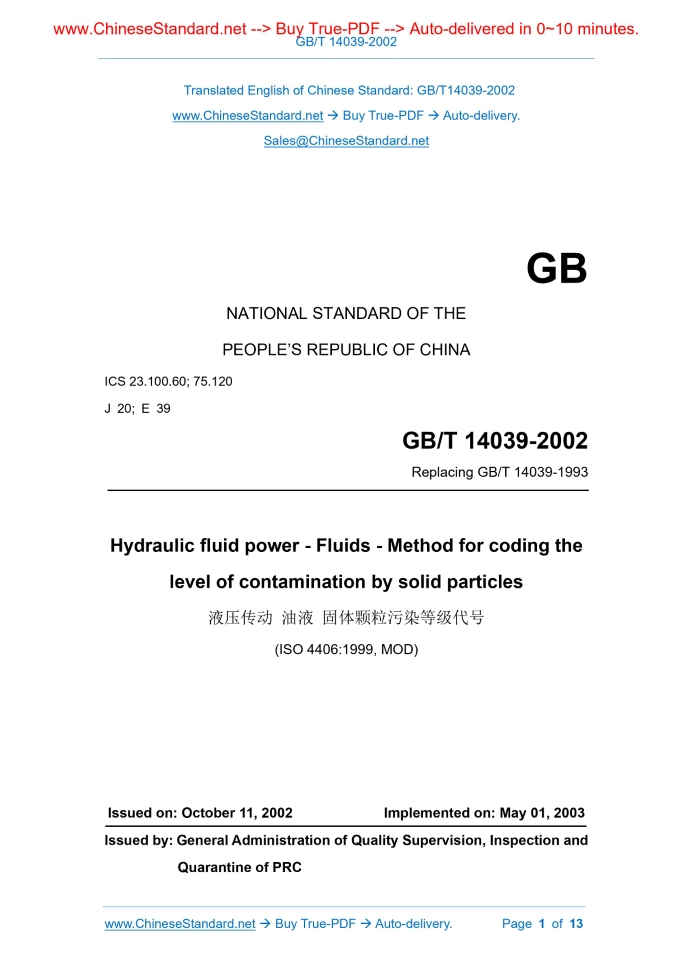 GB/T 14039-2002: Hydraulic fluid power -- Fluids -- Method for coding the level of contamination by solid particles Delivery: 9 seconds. True-PDF full-copy in English & invoice will be downloaded + auto-delivered via email. See step-by-step procedure Status: Valid GB/T 14039: Historical versions
