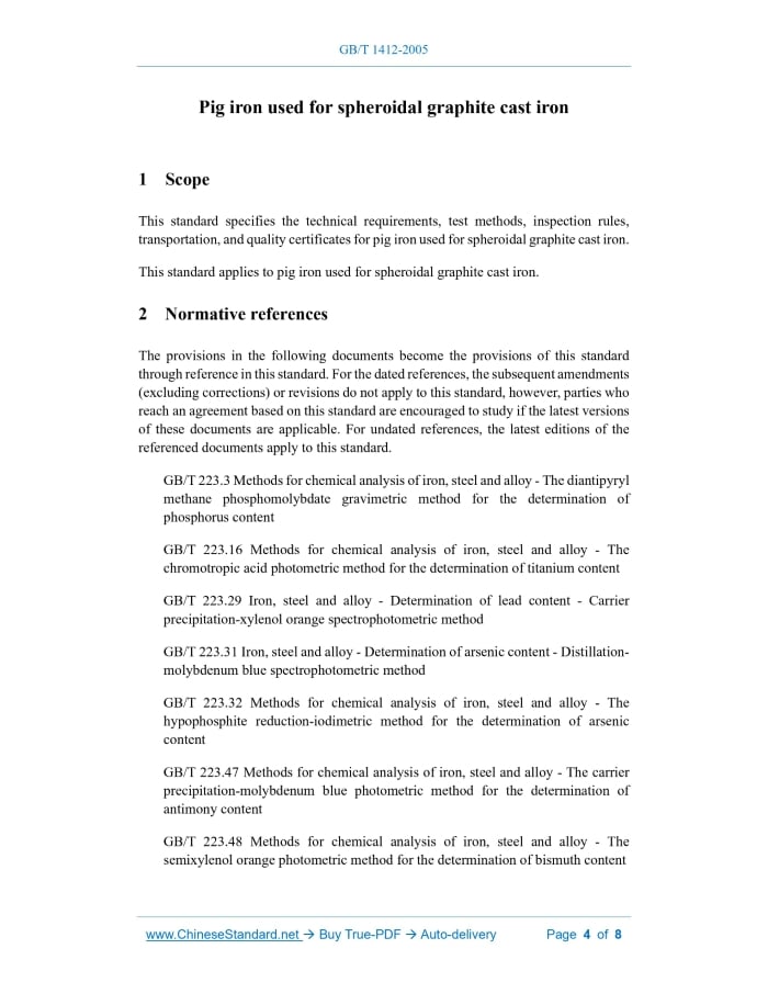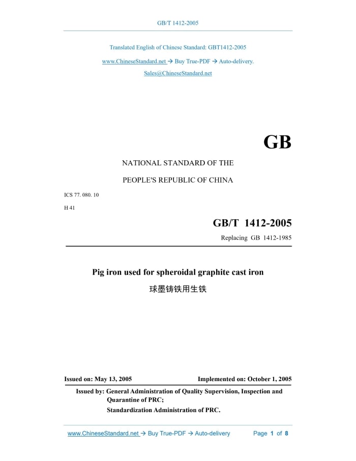GB/T 1412-2005: Pig iron used for spheroidal graphite cast iron Delivery: 9 seconds. True-PDF full-copy in English & invoice will be downloaded + auto-delivered via email. See step-by-step procedure Status: Valid GB/T 1412: Historical versions