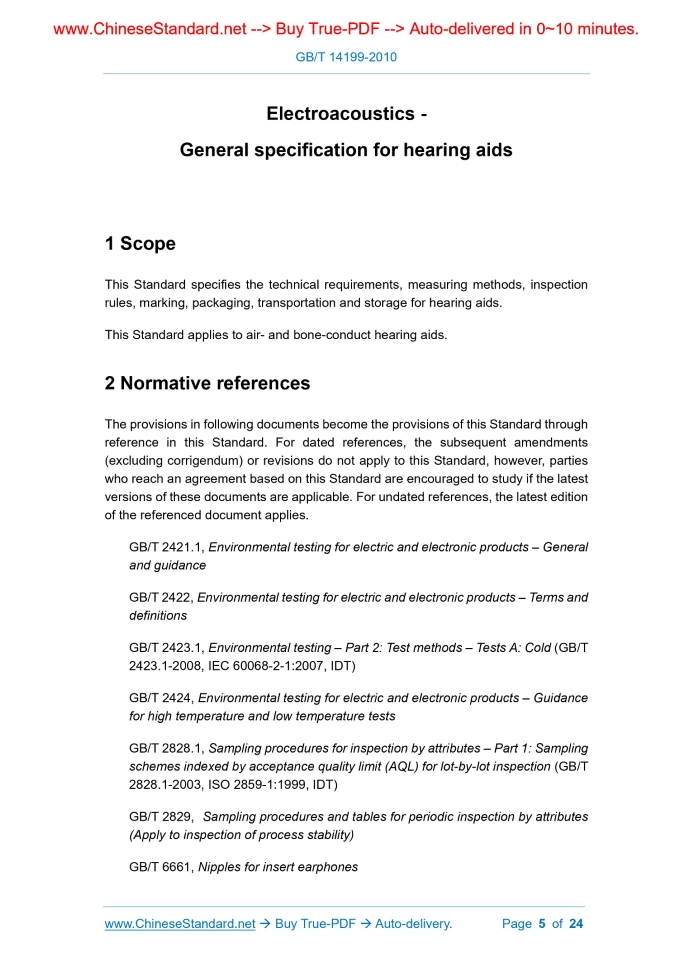 Similar standardsGB/T 14199-2010: Electroacoustics - General specification for hearing aids---This is an excerpt. Full copy of true-PDF in English version (including equations, symbols, images, flow-chart, tables, and figures etc.), auto-downloaded/delivered in 9 seconds, can be purchased online: https://www.ChineseStandard.net/PDF.aspx/GBT14199-2010GB NATIONAL STANDARD OF THE PEOPLE’S REPUBLIC OF CHINA ICS 17.140.50 M 72 Replacing GB/T 14199-1993 Electroacoustics - General specification for hearing aids Issued on. SEPTEMBER 2, 2010 Implemented on. APRIL 1, 2011 Issued by. General Administration of Quality Supervision, Inspection and Quarantine of the People's Republic of China; Standardization Administration of the People's Republic of China. Table of ContentsForeword... 3 1 Scope... 5 2 Normative references... 5 3 Terms and definitions... 6 4 Technical requirements... 8 5 Measuring method... 11 6 Inspection rules... 16 7 Marking, packaging, transportation and storage... 231 ScopeThis Standard specifies the technical requirements, measuring methods, inspection rules, marking, packaging, transportation and storage for hearing aids. This Standard applies to air- and bone-conduct hearing aids.2 Normative referencesThe provisions in following documents become the provisions of this Standard through reference in this Standard. For dated references, the subsequent amendments (excluding corrigendum) or revisions do not apply to this Standard, however, parties who reach an agreement based on this Standard are encouraged to study if the latest versions of these documents are applicable. For undated references, the latest edition of the referenced document applies. GB/T 2421.1, Environmental testing for electric and electronic products – General and guidance GB/T 2422, Environmental testing for electric and electronic products – Terms and definitions GB/T 2423.1, Environmental testing – Part 2.Test methods – Tests A. Cold (GB/T 2423.1-2008, IEC 60068-2-1.2007, IDT) GB/T 2424, Environmental testing for electric and electronic products – Guidance for high temperature and low temperature tests GB/T 2828.1, Sampling procedures for inspection by attributes – Part 1.Sampling schemes indexed by acceptance quality limit (AQL) for lot-by-lot inspection (GB/T 2828.1-2003, ISO 2859-1.1999, IDT)3 Terms and definitionsFor the purposes of this document, the following terms and definitions AND those established in GB/T 25102.100, GB/T 25102.1 and GB/T 2422, apply. 3.1 hearing aid an electronic device which is used to amplify sound and compensate for hearing loss, which normally consists of microphone, amplifier and earphone and which is powered a low-voltage battery 3.2 air-conduct hearing aid A hearing aid with which the sound, amplified using the air-conduct method, is conducted to the internal ear through the air in the auditory meatus. 3.3 bone-conduct hearing aid A hearing aid with which the sound amplified is conducted to the internal ear using method of mechanical vibration of mastoid process or skull. 3.4 box hearing aid body-worn hearing aid A hearing aid which is worn on the body of the hearer (not on the head). 3.5 behind-the-ear hearing aid; BTE A hearing aid which is worn on the back of the auricle which is connected by an ear hook. 3.6 in-the-ear hearing aid; ITE A hearing aid which is customized in accordance with the shape of the cavity of concha auriculae and worn in the concha auriculae of concha auriculae.4 Technical requirements4.1 Appearance and structural requirements 4.2 Technical parameter requirements of electroacoustic performance 4.2.1 Sound pressure level when the input sound pressure level is 90 dB (OSPL90) 4.2.3 Equivalent input noise level The nominal value is specified in the product standard or technical instructions of the manufacturer; its maximum actually measured test value shall not exceed 32 dB and shall not be + 3 dB greater than the nominal value. 4.2.4 Total harmonic distortion The nominal value is specified in the product standards or technical instructions of the manufacturer; the maximum actually measured test value shall not exceed 10% and shall not be greater than + 3%. 4.2.5 Frequency response range The nominal range shall be as specified in the product standards or technical instructions of the manufacturer. 4.3 Requirements for electroacoustic performance technical parameters after environmental testing 4.3.1 The output sound pressure level when the input sound pressure level is 90 dB (OSPL90). 4.3.2 Full-scale gain The difference between the test values before and after environmental testing is not greater than ± 4 dB. 4.3.3 The test value of equivalent input noise sound level is not greater than 35 dB. 4.3.4 The test value of total harmonic distortion is not greater than 12%. 4.3.5 The test value of frequency response range shall be as specified in 4.2.5. 4.3.6 The test value of rated supply current consumption shall be as specified in 4.2.6. 4.3.7 The test value of the sensitivity of inductive pickup coils shall be as specified in 4.2.7. 4.4 Environmental durability 4.5 Electromagnetic compatibility The test results shall be as specified in GB/T 25102.13-2010.5 Measuring method5.1 Measuring conditions 5.1.1 Air-conduct hearing aids shall be as specified in Clause 5 of GB/T 25102.100- 2010; bone-conduct hearing aids shall be as specified in Clause 6 of SJ/Z 9143.2- 1987. 5.2 Appearance, structural requirements, etc. Use the visual inspection and hand feeling methods for inspection. 5.3 Electroacoustic performance measuring method 5.3.1 When the input sound pressure level is 90 dB, the output sound pressure level (OSPL90) is measured as specified in 7.2 of GB/T 25102.100-2010. 5.3.2 The full-scale gain is measured as specified in 7.3 of GB/T 25102.100-2010. 5.3.5 Frequency response range. 5.3.7 The sensitivity of inductive pickup coils is measured as specified in 4.5 of GB/T 25102.100-2010; the recommended measuring frequency is 1,600 Hz or the h