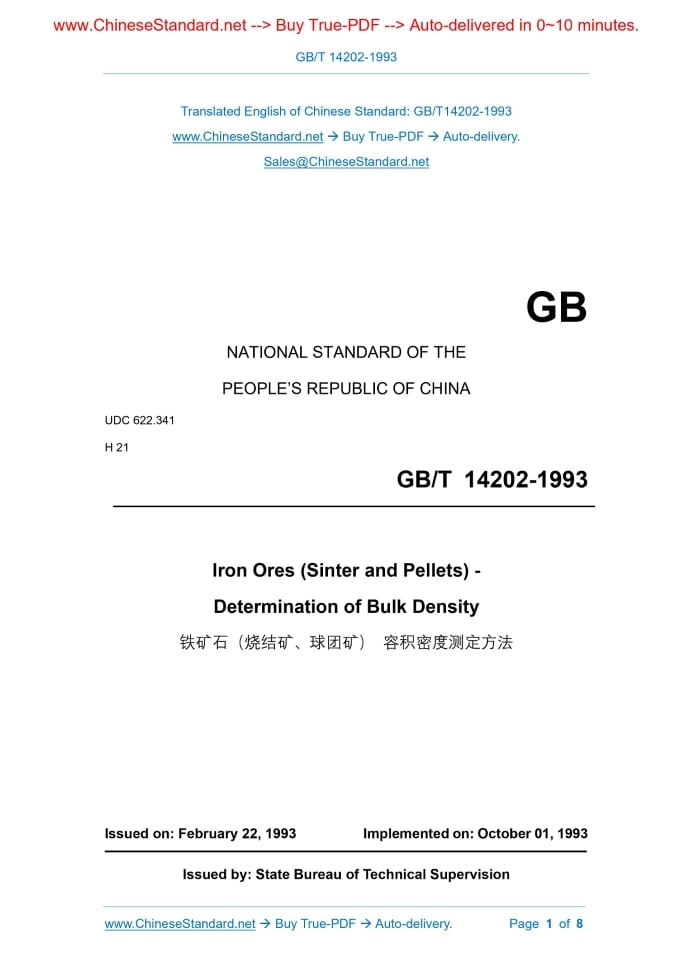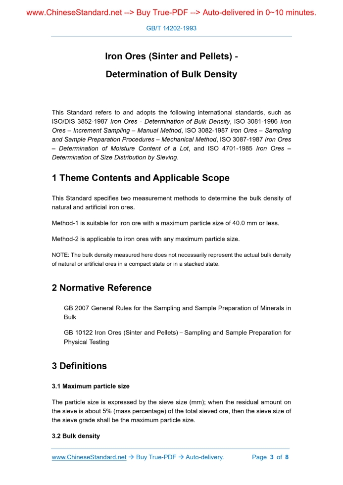 GB/T 14202-1993: Iron ores (sinter and pellets). Determination of bulk density Delivery: 9 seconds. True-PDF full-copy in English & invoice will be downloaded + auto-delivered via email. See step-by-step procedure