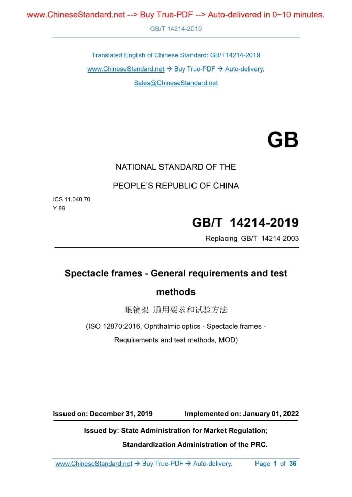 GB/T 14214-2019: Spectacle frames - General requirements and test methods Delivery: 9 seconds. True-PDF full-copy in English & invoice will be downloaded + auto-delivered via email. See step-by-step procedure Status: Valid GB/T 14214: Historical versions