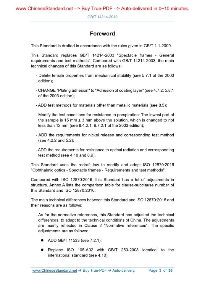 Similar standardsGB/T 14214-2019: Spectacle frames - General requirements and test methods---This is an excerpt. Full copy of true-PDF in English version (including equations, symbols, images, flow-chart, tables, and figures etc.), auto-downloaded/delivered in 9 seconds, can be purchased online: https://www.ChineseStandard.net/PDF.aspx/GBT14214-2019NATIONAL STANDARD OF THE PEOPLE’S REPUBLIC OF CHINA ICS 11.040.70 Y 89 Replacing GB/T 14214-2003 Spectacle frames - General requirements and test methods (ISO 12870.2016, Ophthalmic optics - Spectacle frames - Requirements and test methods, MOD) Issued on. DECEMBER 31, 2019 Implemented on. JANUARY 01, 2022 Issued by. State Administration for Market Regulation; Standardization Administration of the PRC. Table of ContentsForeword... 3 1 Scope... 6 2 Normative references... 6 3 Terms and definitions... 7 4 Technical requirements... 8 5 Selection of test samples... 13 6 Sample pretreatment and requirements... 14 7 Testing, inspection and compliance... 15 8 Test methods... 16 9 Marking... 27 10 Additional information available... 28 Annex A (Informative) Comparison table for clause-subclause number of this Standard and ISO 12870.2016... 30 Annex B (Informative) Examples of layout of test equipment... 31 Annex C (Informative) Composition of nominal materials... 34 Bibliography... 36ForewordThis Standard is drafted in accordance with the rules given in GB/T 1.1-2009. This Standard replaces GB/T 14214-2003 "Spectacle frames - General requirements and test methods". Compared with GB/T 14214-2003, the main technical changes of this Standard are as follows. - Delete tensile properties from mechanical stability (see 5.7.1 of the 2003 edition); - CHANGE "Plating adhesion" to "Adhesion of coating layer" (see 4.7.2; 5.8.1 of the 2003 edition); - ADD test methods for materials other than metallic materials (see 8.5); - Modify the test conditions for resistance to perspiration. The lowest part of the sample is 15 mm ± 3 mm above the solution, which is changed to not less than 12 mm (see 8.4.2.1; 9.7.2.1 of the 2003 edition); - ADD the requirements for nickel release and corresponding test method (see 4.2.2 and 5.2); - ADD the requirements for resistance to optical radiation and corresponding test method (see 4.10 and 8.9). This Standard uses the redraft law to modify and adopt ISO 12870.2016 "Ophthalmic optics - Spectacle frames - Requirements and test methods". Compared with ISO 12870.2016, this Standard has a lot of adjustments in structure. Annex A lists the comparison table for clause-subclause number of this Standard and ISO 12870.2016. The main technical differences between this Standard and ISO 12870.2016 and their reasons are as follows. - As for the normative references, this Standard has adjusted the technical differences, to adapt to the technical conditions of China. The adjustments are mainly reflected in Clause 2 “Normative references”. The specific adjustments are as follows. ADD GB/T 11533 (see 7.2.1); Replace ISO 105-A02 with GB/T 250-2008 identical to the international standard (see 4.10); Replace ISO 11381 with GB/T 197 which modifies and adopts the international standard (see 4.5); Replace ISO 3696 with GB/T 6682 which modifies and adopts the international standard (see 8.4.1.4); Replace ISO 105-B02 with GB/T 8427 which modifies and adopts the international standard (see 8.9.1.2); Replace ISO 7998 with GB/T 26397 which modifies and adopts the international standard (see Clause 3); Replace ISO 8624.2011 with GB/T 38004 identical to the international standard (see 4.4); Replace ISO/TS 24348.2014 with GB/T 38009 which modifies and adopts the international standard (see 4.2.2); Delete ISO 8596 and ISO 11380; - ADD terms and definitions "metal frame", "plastic frame", "boxed measurement system", "boxed center", "distance between centre", "horizontal boxed lens size", "distance between lenses", and "overall length of side" (see 3.4 to 3.11); - ADD "4.7.2 Adhesion of coating layer" requirement and "8.5 Adhesion of coating layer" test method; - Unify the material used for rimless and semi-rimless frames in 6.1.1 "test lens" and modify it to "resin material"; - In Table 1, add the provision that "The subclauses with which compliance is optional for dimensional tolerances of rimless and semi-rimless mounts (4.4) do not include the overall length of side"; - ADD "9.2 Label identification". The following editorial changes have been made to this Standard. - Modify standard name; - Delete ISO 12870.2016 Clause 11 "Reference to this International Standard", Annex A (Informative) "Recommendations for the design of spectacle frames", and Annex C (Informative) "European requirements and legislation on nickel release"; - ADD Annex A (Informative) "Comparison table for clause-subclause number of this Standard and ISO 12870.2016"; - ADD Annex C (Informative) "Composition of nominal materials". This Standard was proposed by and shall be under the jurisdiction of China National Light Industry Council. Drafting organizations of this Standard. Donghua University, China National Inspection & Testing Centre for Ophthalmic Optic Glass and Enamel Products, Zhejiang Yingchang Glasses Industry Co., Ltd., Zhejiang Taiheng Optical Co., Ltd. Main drafters of this Standard. Zhang Nini, Huang Hongliang, Tang Lingling, Guo Lin, Zhou Yong, Hou Dongcai, Tang Tianri. The previous editions of the standard replaced by this Standard were released as follows. - GB/T 14214-1993, GB/T 14214-2003. Spectacle frames - General requirements and test methods1 ScopeThis Standard specifies the technical requirements for spectacle frames, the selection of test samples, sample pretreatment and requirements, testing, inspection and compliance, test methods, and marking.2 Normative referencesThe following documents are indispensable for the application of this document. For the dated references, only the editions with the dates indicated are applicable to this document. For the undated refe