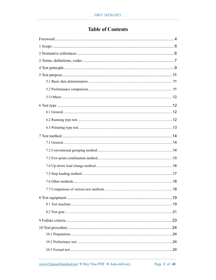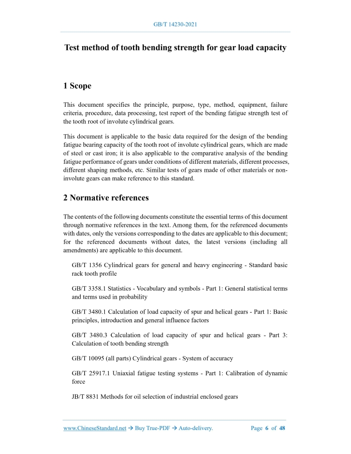 Similar standardsGB/T 14230-2021: Test method of tooth bending strength for gear load capacity---This is an excerpt. Full copy of true-PDF in English version (including equations, symbols, images, flow-chart, tables, and figures etc.), auto-downloaded/delivered in 9 seconds, can be purchased online: https://www.ChineseStandard.net/PDF.aspx/GBT14230-2021GB NATIONAL STANDARD OF THE PEOPLE’S REPUBLIC OF CHINA ICS 21.200 CCS J 17 Replacing GB/T 14230-1993 Test method of tooth bending strength for gear load capacity Issued on. MAY 21, 2021 Implemented on. DECEMBER 01, 2021 Issued by. State Administration for Market Regulation; National Standardization Administration. Table of ContentsForeword... 4 1 Scope... 6 2 Normative references... 6 3 Terms, definitions, codes... 7 4 Test principle... 9 5 Test purpose... 11 6 Test type... 12 7 Test method... 14 8 Test equipment... 19 9 Failure criteria... 23 10 Test procedure... 24 11 Statistical processing of test data... 26 12 Test report... 32 Appendix A (Informative) Test fixture design... 33 Appendix B (Informative) Statistical processing method considering confidence... 36 Appendix C (Informative) Example of conventional grouping method data processing ... 38 Appendix D (Informative) Calculation example of data processing of up-down load change method... 44 Appendix E (Informative) Calculation example of data processing of step loading method... 46 References... 481 ScopeThis document specifies the principle, purpose, type, method, equipment, failure criteria, procedure, data processing, test report of the bending fatigue strength test of the tooth root of involute cylindrical gears. This document is applicable to the basic data required for the design of the bending fatigue bearing capacity of the tooth root of involute cylindrical gears, which are made of steel or cast iron; it is also applicable to the comparative analysis of the bending fatigue performance of gears under conditions of different materials, different processes, different shaping methods, etc. Similar tests of gears made of other materials or non- involute gears can make reference to this standard.2 Normative referencesThe contents of the following documents constitute the essential terms of this document through normative references in the text. Among them, for the referenced documents with dates, only the versions corresponding to the dates are applicable to this document; for the referenced documents without dates, the latest versions (including all amendments) are applicable to this document. GB/T 1356 Cylindrical gears for general and heavy engineering - Standard basic rack tooth profile GB/T 3358.1 Statistics - Vocabulary and symbols - Part 1.General statistical terms and terms used in probability GB/T 3480.1 Calculation of load capacity of spur and helical gears - Part 1.Basic principles, introduction and general influence factors GB/T 3480.3 Calculation of load capacity of spur and helical gears - Part 3. Calculation of tooth bending strength3 Terms, definitions, codesThe terms and definitions as defined in GB/T 3358.1, GB/T 3480.1, GB/T 3480.3, as well as the codes in Table 1, apply to this document.4 Test principle4.1 Through meshing operation (see Figure 1) or pulsating loading (see Figure 2), a controlled load is applied to the test gear teeth, to reproduce or simulate the stress state and value of the tooth root, to determine the number of cycles when the gear teeth fail due to bending fatigue (or fail after exceeding the root stress cycle base N0), OR to determine the stress (load) level when the gear teeth fail due to bending fatigue under a given number of cycles (such as N0). 4.2 Since the discreteness of fatigue test data is inevitable, its distribution will have certain statistical significance, only when enough test data is obtained. Therefore, in practical applications, if only limited test data points can be used for analysis or comparison, the test process shall be strictly controlled and the limitations of the conclusions shall be noted.5 Test purpose5.1 Basic data determination When a specific material and a specific process are used to process the test gear, the bending fatigue limit stress or S-N curve of the gear can be obtained by processing the test data, which can be used as the basic value of the strength design of the material and process. The specific requirements are as follows. 5.2 Performance comparison 5.2.1 When different materials or different processes are used to process the test gear, the influence of different factors on the bending fatigue strength of the gear can be evaluated by processing the test data. These factors include but are not limited to. 5.2.2 Based on the comparison in 5.2.1, the material, process, tooth root design, etc. of the gear can be optimized. 5.2.3 If it is necessary to compare the durability fatigue limit stress, the test shall be conducted in accordance with the requirements of 7.4 or 7.5. 5.3 Others Except for 5.1 and 5.2, other test purposes can be set by the researchers themselves. For example, explore the mechanism and main causes of gear bending fatigue failure, analyze the initiation and stable expansion process of gear bending fatigue cracks, formulate a method to suppress gear tooth bending fatigue damage.6 Test type6.1 General In order to determine the gear bending load capacity and fatigue strength, the method of installing the test gear pair on the test bench for running loading is called the running type test (see Figure 1), whilst the method of fixing the test gear on the test machine with a special fixture to load the gear teeth in a pulsating manner is called the pulsating type test (see Figure 2). 6.2 Running type test 6.3 Pulsating type test 6.3.1 In the test, a set pulsating load is applied to the effective involute position of the test gear tooth close to the tooth top. 6.3.3 The tooth root bending stress generated when the test gear is loaded at point E is calculated according to formula (2