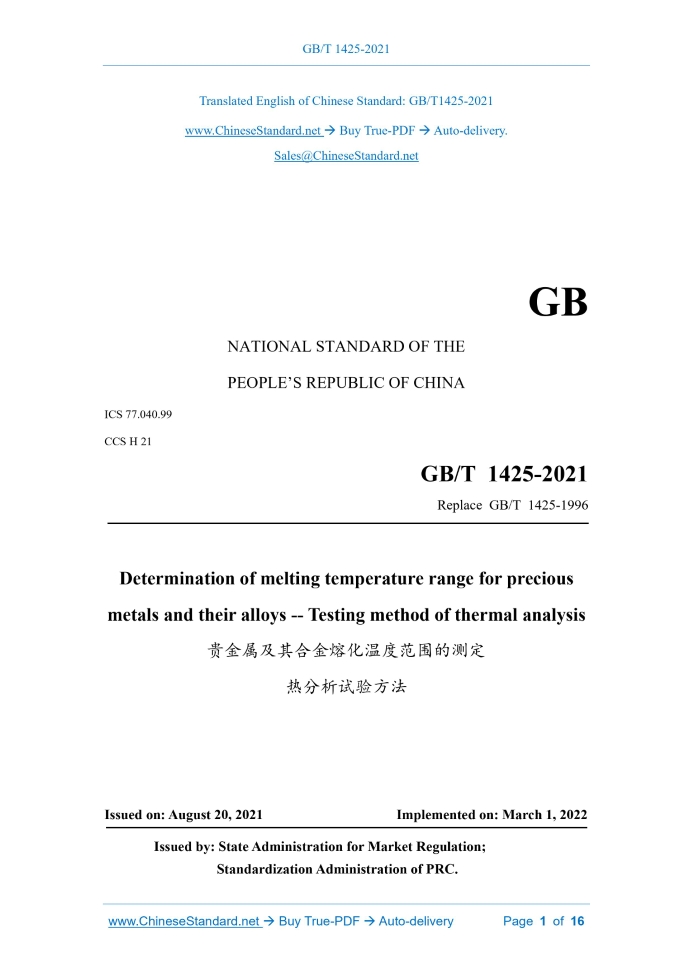GB/T 1425-2021: Determination of melting temperature range for precious metals and their alloys - Testing method of thermal analysis Delivery: 9 seconds. True-PDF full-copy in English & invoice will be downloaded + auto-delivered via email. See step-by-step procedure Status: Valid GB/T 1425: Historical versions