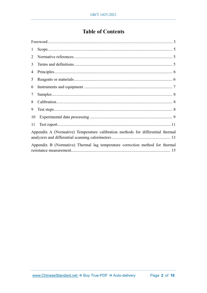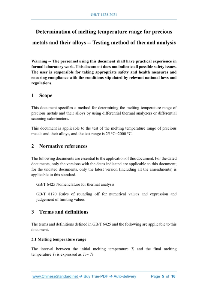 GB/T 1425-2021: Determination of melting temperature range for precious metals and their alloys - Testing method of thermal analysis---This is an excerpt. Full copy of true-PDF in English version (including equations, symbols, images, flow-chart, tables, and figures etc.), auto-downloaded/delivered in 9 seconds, can be purchased online: https://www.ChineseStandard.net/PDF.aspx/GBT1425-2021 NATIONAL STANDARD OF THE PEOPLE’S REPUBLIC OF CHINA ICS 77.040.99 CCS H 21 Replace GB/T 1425-1996 Determination of melting temperature range for precious metals and their alloys -- Testing method of thermal analysis ISSUED ON: AUGUST 20, 2021 IMPLEMENTED ON: MARCH 1, 2022 Issued by: State Administration for Market Regulation; Standardization Administration of PRC. Table of ContentsForeword ... 3 1 Scope ... 5 2 Normative references ... 5 3 Terms and definitions ... 5 4 Principles ... 6 5 Reagents or materials ... 6 6 Instruments and equipment ... 7 7 Samples ... 8 8 Calibration ... 8 9 Test steps ... 8 10 Experimental data processing ... 9 11 Test report ... 11 Appendix A (Normative) Temperature calibration methods for differential thermal analyzers and differential scanning calorimeters ... 13 Appendix B (Normative) Thermal lag temperature correction method for thermal resistance measurement ... 15 Determination of melting temperature range for precious metals and their alloys -- Testing method of thermal analysis Warning -- The personnel using this document shall have practical experience in formal laboratory work. This document does not indicate all possible safety issues. The user is responsible for taking appropriate safety and health measures and ensuring compliance with the conditions stipulated by relevant national laws and regulations.1 ScopeThis document specifies a method for determining the melting temperature range of precious metals and their alloys by using differential thermal analyzers or differential scanning calorimeters. This document is applicable to the test of the melting temperature range of precious metals and their alloys, and the test range is 25 °C~2000 °C.2 Normative referencesThe following documents are essential to the application of this document. For the dated documents, only the versions with the dates indicated are applicable to this document; for the undated documents, only the latest version (including all the amendments) is applicable to this standard. GB/T 6425 Nomenclature for thermal analysis GB/T 8170 Rules of rounding off for numerical values and expression and judgement of limiting values3 Terms and definitionsThe terms and definitions defined in GB/T 6425 and the following are applicable to this document. 3.1 Melting temperature range The interval between the initial melting temperature Ti and the final melting temperature Tf is expressed as Ti ~ Tf 5.2 Reference material The reference material shall have no enthalpy change in the test temperature range and shall be stored in a desiccator for later use. Typical reference materials include calcined α-Al2O3, platinum sheets, glass beads, silicone oil, sample vessels, etc.6 Instruments and equipment6.1 Thermal Analysis Instruments 6.1.1 Differential thermal analyzer: the maximum heating rate shall be not less than 10 °C/min, with sufficient accuracy and adjustment ability, so that the melting peak generated by the temperature difference between the sample and the reference material when the sample is being melted can be automatically recorded in the 10%~90% indexing range of the recorder. Reading accuracy of the temperature curve: the deviation shall not exceed ±0.5 °C when the temperature is lower than 300 °C, ±1 °C when the temperature is 300 °C~700 °C, ±2 °C when the temperature is >700 °C~1600 °C, and ±3 °C when the temperature is >1600 °C~2000 °C. 6.1.2 Differential scanning calorimeter: the maximum heating rate shall be not less than 10 °C/min, with sufficient accuracy and adjustment ability, so that the melting peak generated by the energy difference input between the sample and the reference material when the sample is being melted can be automatically recorded within the 10%~90% indexing range of the recorder. Reading accuracy of the temperature curve: the deviation shall not exceed ±0.5 °C when the temperature is lower than 300 °C, ±1 °C when the temperature is 300 °C~700 °C, ±2 °C when the temperature is >700 °C~1600 °C. 6.2 Sample vessel Made of aluminum or other high thermal conductivity metals, borosilicate glass, fused alumina, fused silica and other materials, it (or the crucible) shall not occur any phase changes within the test temperature range and not react with the reference materials or the samples. 6.3 Pressure Conditions If the test needs to be carried out under pressure conditions, then: - the test pressure of the compressed air source shall be maintained at 0.1 MPa~1.27 MPa; - the pressure regulating converter shall be able to measure and adjust the test pressure to the specified value, and the error shall be less than 5%.7 Samples7.1 For liquid or slurry samples, take samples after mixing; for sheet metal samples, take samples after shredding. 7.2 On the premise of not affecting the sample, vibration filling, molding, extrusion and other methods can be used to improve the heat conduction between the sample and the sample vessel. 7.3 Unless otherwise stated, the samples will be measured as received without any pretreatment. 7.4 If it is required to perform mechanical processing or heat treatment on the sample before analysis, the corresponding processing method, process and conditions shall be indicated in the report; For heat treatment, the mass loss before and after treatment shall also be recorded. 7.5 Samples shall not be diluted. If the sensitivity of the instrument and the stability of the baseline allow, it is recommended to use a smaller amount of sample for the test. The recommended sample volume should be 2 mg~20 mg, or less than 1/3 of the vo