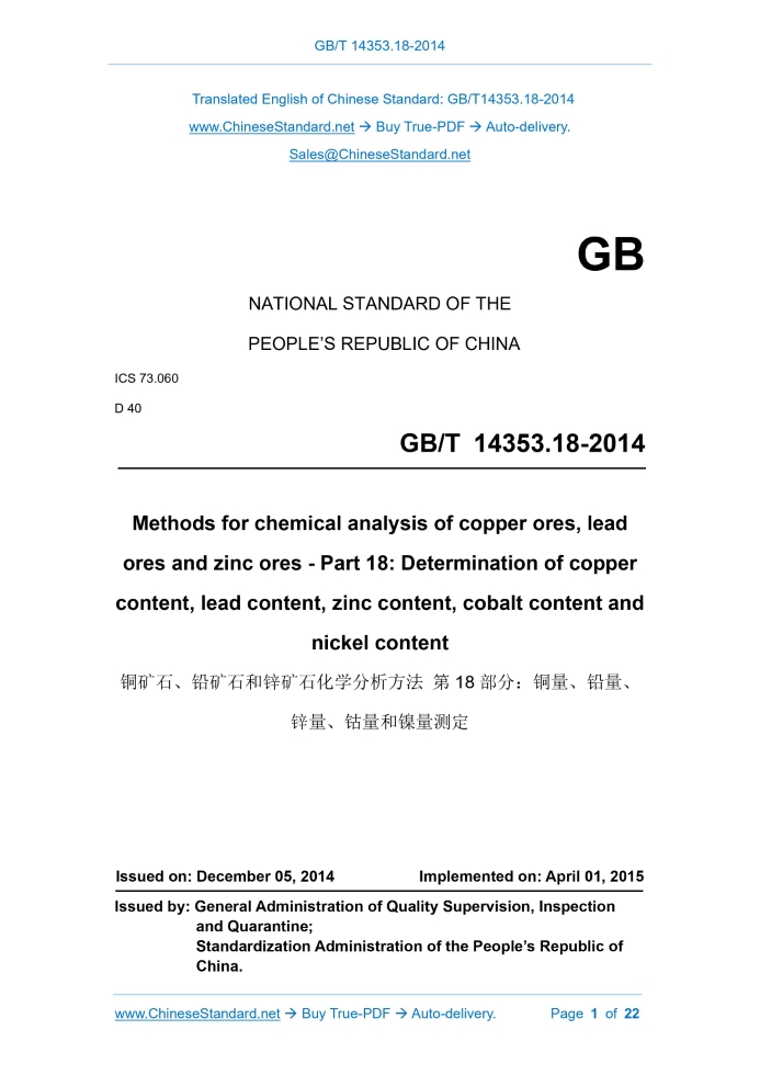 GB/T 14353.18-2014: Methods for chemical analysis of copper ores, lead ores and zine ores - Part 18: Determination of copper content, lead content, zinc content, cobalt content and nickel content Delivery: 9 seconds. True-PDF full-copy in English & invoice will be downloaded + auto-delivered via email. See step-by-step procedure Status: Valid