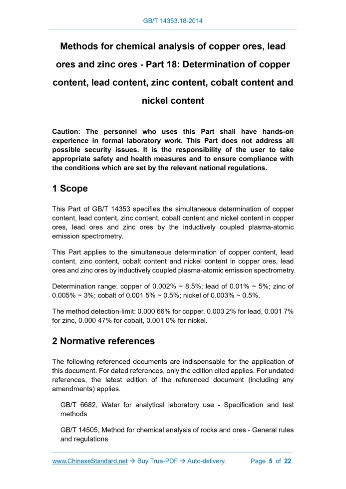 Similar standardsGB/T 14353.18-2014: Methods for chemical analysis of copper ores, lead ores and zine ores - Part 18: Determination of copper content, lead content, zinc content, cobalt content and nickel content---This is an excerpt. Full copy of true-PDF in English version (including equations, symbols, images, flow-chart, tables, and figures etc.), auto-downloaded/delivered in 9 seconds, can be purchased online: https://www.ChineseStandard.net/PDF.aspx/GBT14353.18-2014 GB NATIONAL STANDARD OF THE PEOPLE’S REPUBLIC OF CHINA ICS 73.060 D 40 Methods for chemical analysis of copper ores, lead ores and zinc ores - Part 18: Determination of copper content, lead content, zinc content, cobalt content and nickel content ISSUED ON: DECEMBER 05, 2014 IMPLEMENTED ON: APRIL 01, 2015 Issued by: General Administration of Quality Supervision, Inspection and Quarantine; Standardization Administration of the People’s Republic of China. Table of ContentsForeword ... 3 1 Scope ... 5 2 Normative references ... 5 3 Principle ... 6 4 Reagents ... 6 5 Instruments ... 8 6 Test pieces ... 8 7 Analysis steps ... 8 8 Calculation of results ... 10 9 Precision ... 11 10 Quality assurance and control ... 11 Appendix A (Informative) Instrument reference working conditions and interference from coexisting ions ... 13 Appendix B (Informative) Statistical processing of data of interlaboratory test results ... 14 References ... 22 Methods for chemical analysis of copper ores, lead ores and zinc ores - Part 18: Determination of copper content, lead content, zinc content, cobalt content and nickel content Caution: The personnel who uses this Part shall have hands-on experience in formal laboratory work. This Part does not address all possible security issues. It is the responsibility of the user to take appropriate safety and health measures and to ensure compliance with the conditions which are set by the relevant national regulations.1 ScopeThis Part of GB/T 14353 specifies the simultaneous determination of copper content, lead content, zinc content, cobalt content and nickel content in copper ores, lead ores and zinc ores by the inductively coupled plasma-atomic emission spectrometry. This Part applies to the simultaneous determination of copper content, lead content, zinc content, cobalt content and nickel content in copper ores, lead ores and zinc ores by inductively coupled plasma-atomic emission spectrometry. Determination range: copper of 0.002% ~ 8.5%; lead of 0.01% ~ 5%; zinc of 0.005% ~ 3%; cobalt of 0.001 5% ~ 0.5%; nickel of 0.003% ~ 0.5%. The method detection-limit: 0.000 66% for copper, 0.003 2% for lead, 0.001 7% for zinc, 0.000 47% for cobalt, 0.001 0% for nickel.2 Normative referencesThe following referenced documents are indispensable for the application of this document. For dated references, only the edition cited applies. For undated references, the latest edition of the referenced document (including any amendments) applies. GB/T 6682, Water for analytical laboratory use - Specification and test methods GB/T 14505, Method for chemical analysis of rocks and ores - General rules and regulations3 PrinciplePlace the sample, which has been decomposed by hydrochloric acid-nitric acid- hydrofluoric acid-perchloric acid, in a 20% nitric acid medium (containing 3% hydrochloric acid); introduce the solution of the to-be-tested sample into a high- temperature plasma torch, so that the to-be-tested elements are activated into ions and atoms that emit characteristic spectral lines of the contained elements. Measure the emission spectrum intensity of ions and atoms of each element at the specified wavelength; the emission spectrum intensity shall be proportional to the concentration of the to-be-measured element. Use the calibration curve method; calculate the content of the to-be-measured element by the computer of the instrument.4 ReagentsUnless otherwise stated, only use analytical reagents and laboratory water in accordance with GB/T 6682 in the analysis. 4.1 Nitric acid (ρ = 1.42 g/mL). 4.2 Hydrofluoric acid (ρ = 1.13 g/mL). Warning: Hydrofluoric acid is toxic and highly corrosive. Wear anti-corrosion gloves during the operation, to prevent contact with skin. 4.3 Hydrochloric acid (ρ = 1.19 g/mL). 4.4 Perchloric acid (ρ = 1.68 g/mL). Warning: Explosive materials, handle with care! 4.5 Mixed acid (nitric acid + hydrochloric acid = 4 + 1). 4.6 Nitric acid (1+9). 4.7 Preparation of standard solution 4.7.1 Prepare the copper standard solution according to the following steps: a) Copper standard stock solution [ρ(Cu) = 1.00 mg/mL]: Weigh 0.500 0 g of metallic copper ( >99.99%); put it in a 250 mL beaker; cover with a watch glass; add 10 mL of nitric acid (1+1) along the beaker wall; slightly heat it; after all of it is dissolved, add 10 mL of sulfuric acid (1+1); steam until white smoke of sulfur trioxide emits; remove and cool; add water to dissolve the copper salt; use water to wash off the watch glass; cool and transfer to a 500 mL volumetric flask; use water to dilute to the mark; shake well; b) Copper standard solution [ρ(Cu) = 100.0 μg/mL]: Divide 25.00 mL of copper standard stock solution [4.7.1a)] into a 250 mL volumetric flask; use hydrochloric acid (5+95) to dilute it to the mark; shake well; c) Copper standard solution [ρ(Cu) = 20.0 μg/mL]: Divide 50.00 mL of copper standard solution [4.7.1b)] into a 250 mL volumetric flask; use hydrochloric acid (5+95) to dilute to the mark; shake well. 4.7.2 Prepare the lead standard solution according to the following steps: a) Lead standard stock solution [ρ(Pb) = 1.00 mg/mL]: Weigh 1.000 0 g of metallic lead ( >99.99%); put it in a 250 mL beaker; cover with a watch glass; add 10 mL of nitric acid (1+1) along the beaker wall; after heating and dissolving, use a small amount of water to wash the watch glass; transfer it to a 1 000 mL volumetric flask; use water to dilute to the mark; shake well; b) Lead standard solution [ρ(Pb) = 20.0 μg/mL]: Divide 