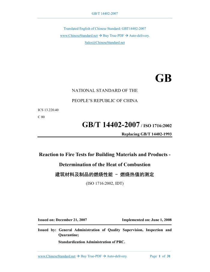 GB/T 14402-2007: Reaction to fire tests for building materials and products -- Determination of the heat of combustion Delivery: 9 seconds. True-PDF full-copy in English & invoice will be downloaded + auto-delivered via email. See step-by-step procedure Status: Valid GB/T 14402: Historical versions