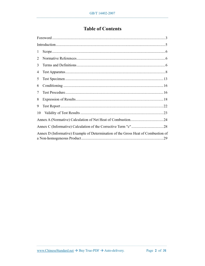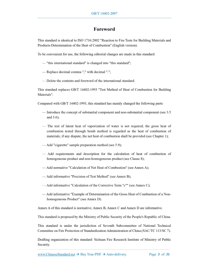 Similar standardsGB/T 14402-2007: Reaction to fire tests for building materials and products -- Determination of the heat of combustion---This is an excerpt. Full copy of true-PDF in English version (including equations, symbols, images, flow-chart, tables, and figures etc.), auto-downloaded/delivered in 9 seconds, can be purchased online: https://www.ChineseStandard.net/PDF.aspx/GBT14402-2007 GB NATIONAL STANDARD OF THE PEOPLE’S REPUBLIC OF CHINA ICS 13.220.40 C 80 GB/T 14402-2007 / ISO 1716:2002 Replacing GB/T 14402-1993 Reaction to Fire Tests for Building Materials and Products - Determination of the Heat of Combustion (ISO 1716:2002, IDT) ISSUED ON: DECEMBER 21, 2007 IMPLEMENTED ON: JUNE 1, 2008 Issued by: General Administration of Quality Supervision, Inspection and Quarantine; Standardization Administration of PRC. Table of ContentsForeword ... 3 Introduction ... 5 1 Scope ... 6 2 Normative References ... 6 3 Terms and Definitions ... 6 4 Test Apparatus ... 8 5 Test Specimen ... 13 6 Conditioning ... 16 7 Test Procedure ... 16 8 Expression of Results ... 18 9 Test Report ... 22 10 Validity of Test Results ... 23 Annex A (Normative) Calculation of Net Heat of Combustion ... 24 Annex C (Informative) Calculation of the Corrective Term "c" ... 28 Annex D (Informative) Example of Determination of the Gross Heat of Combustion of a Non-homogeneous Product ... 29ForewordThis standard is identical to ISO 1716:2002 "Reaction to Fire Tests for Building Materials and Products-Determination of the Heat of Combustion" (English version). To be convenient for use, the following editorial changes are made in this standard: — "this international standard" is changed into "this standard"; — Replace decimal comma "," with decimal "."; — Delete the contents and foreword of the international standard. This standard replaces GB/T 14402-1993 "Test Method of Heat of Combustion for Building Materials". Compared with GB/T 14402-1993, this standard has mainly changed the following parts: — Introduce the concept of substantial component and non-substantial component (see 3.5 and 3.6); — The test of latent heat of vaporization of water is not required; the gross heat of combustion tested through bomb method is regarded as the heat of combustion of materials; if any dispute, the net heat of combustion shall be provided (see Chapter 1); — Add "cigarette" sample preparation method (see 5.9); — Add requirements and description for the calculation of heat of combustion of homogeneous product and non-homogeneous product (see Clause 8); — Add normative "Calculation of Net Heat of Combustion" (see Annex A); — Add informative "Precision of Test Method" (see Annex B); — Add informative "Calculation of the Corrective Term "c"" (see Annex C); — Add informative "Example of Determination of the Gross Heat of Combustion of a Non- homogeneous Product" (see Annex D). Annex A of this standard is normative; Annex B, Annex C and Annex D are informative. This standard is proposed by the Ministry of Public Security of the People's Republic of China. This standard is under the jurisdiction of Seventh Subcommittee of National Technical Committee on Fire Protection of Standardization Administration of China (SAC/TC 113/SC 7). Drafting organization of this standard: Sichuan Fire Research Institute of Ministry of Public Security. Reaction to Fire Tests for Building Materials and Products- Determination of the Heat of Combustion1 ScopeThis standard specifies a method for the determination of the heat of combustion of building products at constant volume in a bomb calorimeter. This standard describes a test method for the measurement of the gross heat of combustion (PCS). Annex A describes the calculation of the net heat of combustion (PCI) when required. Information on the precision of the test method is given in Annex B.2 Normative ReferencesThe following standards contain provisions which, through reference in this text, constitute provisions of this standard. For dated reference, subsequent amendments to (excluding correction to), or revisions of, any of these publications do not apply. However, all parties coming to an agreement according to this standard are encouraged to study whether the latest edition of these documents is applicable. For undated references, the latest edition of the normative document is applicable to this standard. ISO 13943 "Fire Safety-Vocabulary" EN 13238 "Reaction to Fire Tests for Budding Products-Conditioning Procedures and General Rules for Selection of Substrates"3 Terms and DefinitionsFor the purposes of this standard, the terms and definitions given in ISO 13943, together with the following terms and definitions, apply. 3.1 Product Material, element or component about which information is required. 3.2 Material 4.12.5 Cigarette making paper, which is pre-glued and of minimum dimensions 55mm×50mm with a known heat of combustion. A commercially available cigarette making paper of 55mm×100mm has been found suitable when cut into two equal pieces. 4.12.6 Firing wire made of pure iron shall be 0.1mm in diameter. Other types of metal wire may be used, provided that they break under their own tension when the switch is closed on the firing circuit and the exact heat of combustion for the wire is known. When using a metal crucible, there shall be no contact between the firing wire and the crucible. It is therefore advisable to wrap the metal wire with a cotton thread. 4.12.7 A thread made of white cellulosic cotton (see 4.12.6).5 Test Specimen5.1 General A product shall be evaluated through each of its components, taking into account the rules for non-substantial components. If a non-homogeneous product cannot be delaminated, its components shall be provided separately. A product can be delaminated when it is possible to separate one component from another without any part of the other component adhering to the component to be evaluated. 5.2 Sampling 5.2.1 General From a representativ