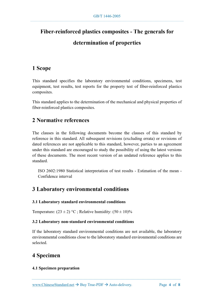 GB/T 1446-2005: Fiber-reinforced plastics composites -- The generals for determination of properties---This is an excerpt. Full copy of true-PDF in English version (including equations, symbols, images, flow-chart, tables, and figures etc.), auto-downloaded/delivered in 9 seconds, can be purchased online: https://www.ChineseStandard.net/PDF.aspx/GBT1446-2005 GB NATIONAL STANDARD OF THE PEOPLE’S REPUBLIC OF CHINA ICS 83.120 Q 23 Replacing GB/T 1446-1983 Fiber-reinforced plastics composites - The generals for determination of properties ISSUED ON: MAY 18, 2005 IMPLEMENTED ON: DECEMBER 01, 2005 Issued by: General Administration of Quality Supervision, Inspection and Quarantine of PRC; National Standardization Administration. Table of ContentsForeword ... 3 1 Scope ... 4 2 Normative references ... 4 3 Laboratory environmental conditions ... 4 4 Specimen ... 4 5 Test equipment ... 6 6 Test results ... 6 7 Test report ... 7 Fiber-reinforced plastics composites - The generals for determination of properties1 ScopeThis standard specifies the laboratory environmental conditions, specimens, test equipment, test results, test reports for the property test of fiber-reinforced plastics composites. This standard applies to the determination of the mechanical and physical properties of fiber-reinforced plastics composites.2 Normative referencesThe clauses in the following documents become the clauses of this standard by reference in this standard. All subsequent revisions (excluding errata) or revisions of dated references are not applicable to this standard, however, parties to an agreement under this standard are encouraged to study the possibility of using the latest versions of these documents. The most recent version of an undated reference applies to this standard. ISO 2602:1980 Statistical interpretation of test results - Estimation of the mean - Confidence interval3 Laboratory environmental conditions3.1 Laboratory standard environmental conditions Temperature: (23 ± 2) °C ; Relative humidity: (50 ± 10)% 3.2 Laboratory non-standard environmental conditions If the laboratory standard environmental conditions are not available, the laboratory environmental conditions close to the laboratory standard environmental conditions are selected.4 Specimen4.1 Specimen preparation 4.1.1 Mechanical processing method 4.1.1.1 The location area of the specimen should generally be more than 30 mm away from the edge of the plate (the burr of the process has been removed); the minimum shall not be less than 20 mm. If there are defects such as blisters, delamination, resin siltation, wrinkles, warping, wrong layup in the location area, it shall be avoided. 4.1.1.2 If there are special requirements for the location area or when it is necessary to sample from the product, it shall be determined according to the relevant technical requirements and indicated in the test report. 4.1.1.3 Fiber reinforced plastics are generally anisotropic; the specimen shall be cut according to the two main directions of the anisotropic material or the pre-specified direction (such as the longitudinal and transverse direction of the plate); it shall strictly ensure that the fiber direction and the layup direction are consistent with the test requirements. 4.1.1.4 Fiber-reinforced plastic specimens shall be processed with cemented carbide cutting tools or grinding wheels. During processing, it is necessary to prevent mechanical damage such as delamination, scoring, local extrusion of the specimen. 4.1.1.5 When processing specimens, water cooling can be used (oil is prohibited). After processing, the specimen shall be dried in a timely manner under appropriate conditions. 4.1.1.6 The forming surface of the specimen should not be processed. When machining is required, it is generally single-sided processing and indicated in the test report. 4.1.2 Molding method Molded specimens are prepared according to the provisions of product standards or technical specifications. In the test report, indicate the process conditions for the preparation of the specimens and the direction of pressure during molding. 4.2 Specimen visual inspection Before the test, the specimens needs to be visually inspected; if there are defects and do not meet the size and preparation requirements, it shall be discarded. 4.3 Number of specimens There are no less than 5 mechanical property specimens in each group; 5 valid specimens in the same batch are guaranteed. Physical properties of the specimens are according to the provisions of the corresponding standard. 4.4 Specimen conditioning 4.4.1 Before the test, the specimen shall be placed under the standard environmental conditions of the laboratory for at least 24 hours. ......Source: Above contents are excerpted from the full-copy PDF -- translated/reviewed by: www.ChineseStandard.net / Wayne Zheng et al. Tips & Frequently Asked Questions:Question 1: How long will the true-PDF of English version of GB/T 1446-2005 be delivered?Answer: The full copy PDF of English version of GB/T 1446-2005 can be downloaded in 9 seconds, and it will also be emailed to you in 9 seconds (double mechanisms to ensure the delivery reliably), with PDF-invoice.Question 2: Can I share the purchased PDF of GB/T 1446-2005_English with my colleagues?Answer: Yes. The purchased PDF of GB/T 1446-2005_English will be deemed to be sold to your employer/organization who actually paid for it, including your colleagues and your employer's intranet.Question 3: Does the price include tax/VAT?Answer: Yes. Our tax invoice, downloaded/delivered in 9 seconds, includes all tax/VAT and complies with 100+ countries' tax regulations (tax exempted in 100+ countries) -- See Avoidance of Double Taxation Agreements (DTAs): List of DTAs signed between Singapore and 100+ countriesQuestion 4: Do you accept my currency other than USD?Answer: Yes. www.ChineseStandard.us -- GB/T 1446-2005 -- Click this link and select your country/currency to pay, the exact amount in your