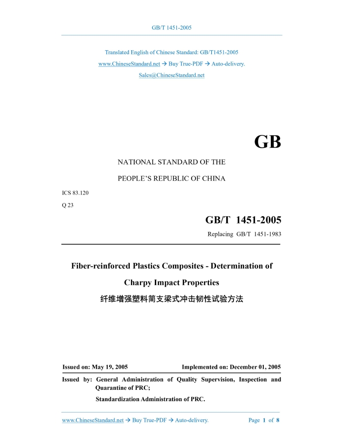 GB/T 1451-2005: Fiber-reinforced plastics composites -- Determination of Charpy impact properties Delivery: 9 seconds. True-PDF full-copy in English & invoice will be downloaded + auto-delivered via email. See step-by-step procedure Status: Valid GB/T 1451: Historical versions