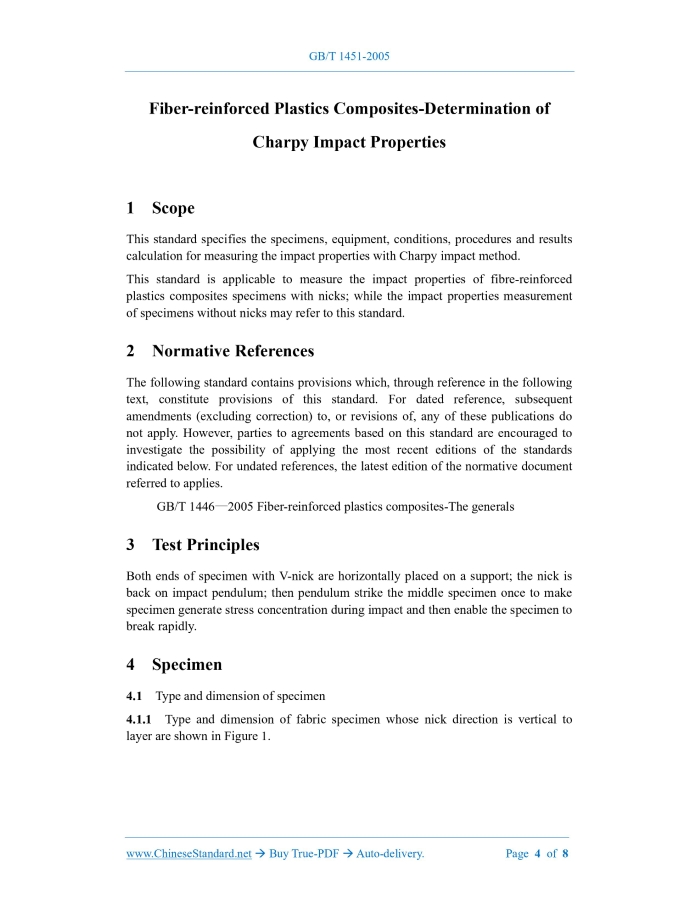 GB/T 1451-2005: Fiber-reinforced plastics composites -- Determination of Charpy impact properties---This is an excerpt. Full copy of true-PDF in English version (including equations, symbols, images, flow-chart, tables, and figures etc.), auto-downloaded/delivered in 9 seconds, can be purchased online: https://www.ChineseStandard.net/PDF.aspx/GBT1451-2005 GB NATIONAL STANDARD OF THE PEOPLE’S REPUBLIC OF CHINA ICS 83.120 Q 23 Replacing GB/T 1451-1983 Fiber-reinforced Plastics Composites - Determination of Charpy Impact Properties Issued on: MAY 19, 2005 Implemented on: DECEMBER 01, 2005 Issued by. General Administration of Quality Supervision, Inspection and Quarantine of PRC; Standardization Administration of PRC. Table of ContentsForeword... 3 1 Scope... 4 2 Normative References... 4 3 Test Principles... 4 4 Specimen... 4 5 Test Equipment... 6 6 Test Conditions... 7 7 Test Procedures... 7 8 Calculation... 7 9 Test Results... 8 10 Test Report... 8 Fiber-reinforced Plastics Composites-Determination of Charpy Impact Properties1 ScopeThis standard specifies the specimens, equipment, conditions, procedures and results calculation for measuring the impact properties with Charpy impact method. This standard is applicable to measure the impact properties of fibre-reinforced plastics composites specimens with nicks; while the impact properties measurement of specimens without nicks may refer to this standard.2 Normative ReferencesThe following standard contains provisions which, through reference in the following text, constitute provisions of this standard. For dated reference, subsequent amendments (excluding correction) to, or revisions of, any of these publications do not apply. However, parties to agreements based on this standard are encouraged to investigate the possibility of applying the most recent editions of the standards indicated below. For undated references, the latest edition of the normative document referred to applies. GB/T 1446—2005 Fiber-reinforced plastics composites-The generals3 Test PrinciplesBoth ends of specimen with V-nick are horizontally placed on a support; the nick is back on impact pendulum; then pendulum strike the middle specimen once to make specimen generate stress concentration during impact and then enable the specimen to break rapidly.4 Specimen4.1 Type and dimension of specimen 4.1.1 Type and dimension of fabric specimen whose nick direction is vertical to layer are shown in Figure 1.6 Test ConditionsTest conditions shall meet the provisions specified in Chapter 3 of GB/T 1446-2005.7 Test Procedures7.1 Specimen appearance inspection shall meet the provisions specified in Article 4.2 of GB/T 1446-2005. 7.2 Specimen status shall be adjusted according to the provisions specified in Article 4.4 of GB/T 1446-2005. 7.3 Those qualified specimens are numbered; then the width at nick of specimen is measured and the minimum thickness at nick is measured with projector or other measuring instrument. In addition, the measuring accuracy shall meet the provisions stated in Article 4.5.1 of GB/T 1446-2005. 7.4 Pendulum with proper energy is selected so as to ensure the consumed power to break specimen is within 10%~85% full scale. 7.5 Support span is adjusted to be (70±0.5)mm with sample plate with standard span. 7.6 Whether spacer shall be added on a support is determined according to specimen dimension and the position of center impacted by test machine. Spacer dimension shall be determined basing on test machine conditions. 7.7 Before test, one non-load impact shall be carried out to adjust the pointer of test-machine reading dial to point to zero. 7.8 The surface with nick of a specimen is back on pendulum. Specimen is placed with specimen locating plate so as to enable the nick center to align with striking center. 7.9 Impaction is carried out and the power consumed to break specimen as well as breaking type shall be recorded. 7.10 Specimen with apparent internal defect or which doesn't break at nick shall be abolished. Effective specimen amount in the same lot shall meet the provisions stated in Article 4.3.Otherwise, test shall be carried out again.8 CalculationImpact properties is calculated according to the following formula. Where, ......Source: Above contents are excerpted from the full-copy PDF -- translated/reviewed by: www.ChineseStandard.net / Wayne Zheng et al. Tips & Frequently Asked Questions:Question 1: How long will the true-PDF of English version of GB/T 1451-2005 be delivered?Answer: The full copy PDF of English version of GB/T 1451-2005 can be downloaded in 9 seconds, and it will also be emailed to you in 9 seconds (double mechanisms to ensure the delivery reliably), with PDF-invoice.Question 2: Can I share the purchased PDF of GB/T 1451-2005_English with my colleagues?Answer: Yes. The purchased PDF of GB/T 1451-2005_English will be deemed to be sold to your employer/organization who actually paid for it, including your colleagues and your employer's intranet.Question 3: Does the price include tax/VAT?Answer: Yes. Our tax invoice, downloaded/delivered in 9 seconds, includes all tax/VAT and complies with 100+ countries' tax regulations (tax exempted in 100+ countries) -- See Avoidance of Double Taxation Agreements (DTAs): List of DTAs signed between Singapore and 100+ countriesQuestion 4: Do you accept my currency other than USD?Answer: Yes. www.ChineseStandard.us -- GB/T 1451-2005 -- Click this link and select your country/currency to pay, the exact amount in your currency will be printed on the invoice. Full PDF will also be downloaded/emailed in 9 seconds.Question 5: Should I purchase the latest version GB/T 1451-2005?Answer: Yes. Unless special scenarios such as technical constraints or academic study, you should always prioritize to purchase the latest version GB/T 1451-2005 even if the enforcement date is in future. Complying with the latest version means that, by default, it also complies with all the earlier versions, technically.How 