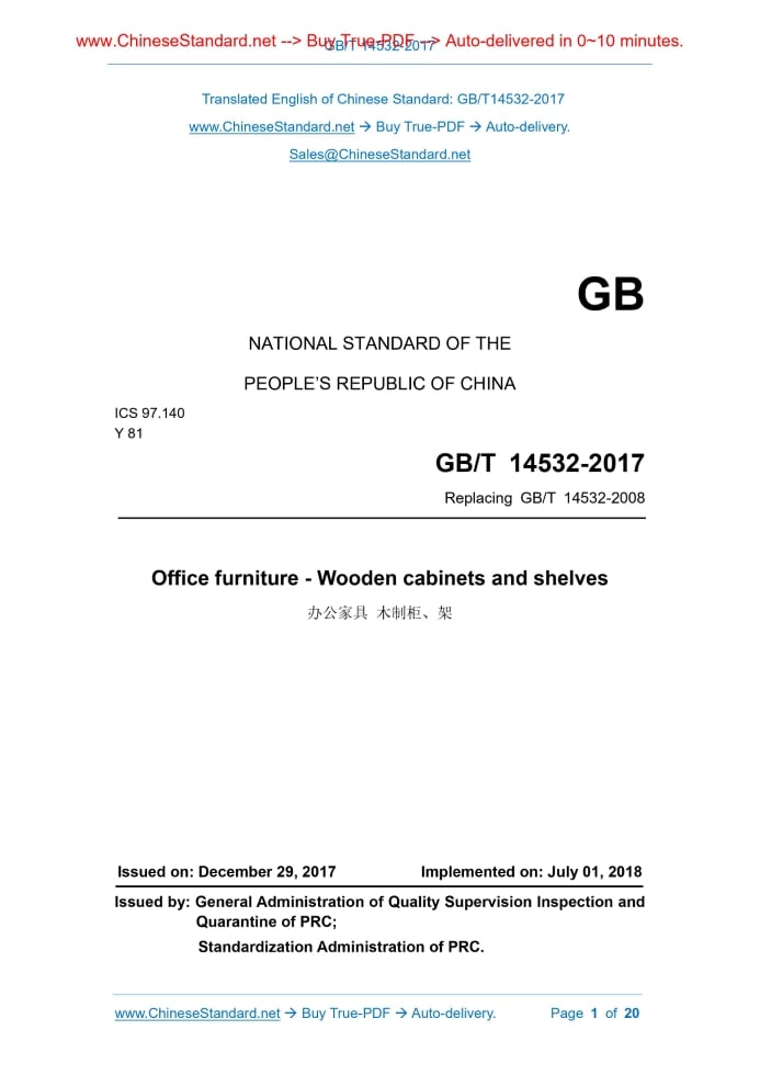 GB/T 14532-2017: Office furniture - Wooden cabinets and shelves Delivery: 9 seconds. True-PDF full-copy in English & invoice will be downloaded + auto-delivered via email. See step-by-step procedure Status: Valid GB/T 14532: Historical versions