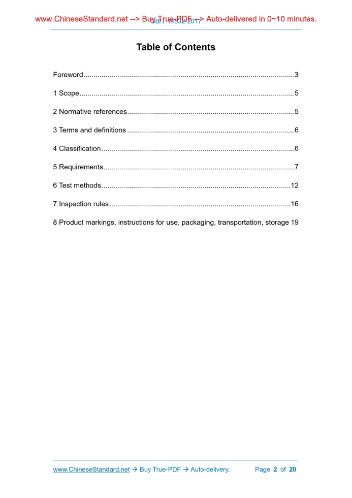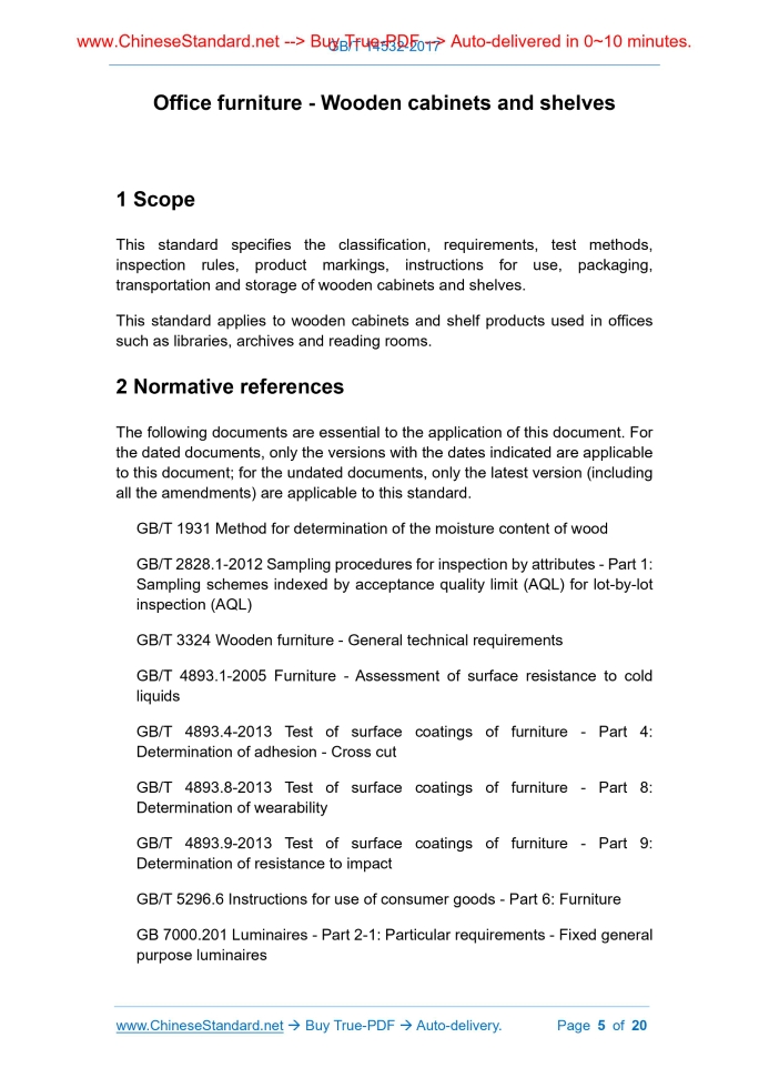 Similar standardsGB/T 14532-2017: Office furniture - Wooden cabinets and shelves---This is an excerpt. Full copy of true-PDF in English version (including equations, symbols, images, flow-chart, tables, and figures etc.), auto-downloaded/delivered in 9 seconds, can be purchased online: https://www.ChineseStandard.net/PDF.aspx/GBT14532-2017GB NATIONAL STANDARD OF THE PEOPLE’S REPUBLIC OF CHINA ICS 97.140 Y 81 Replacing GB/T 14532-2008 Office furniture - Wooden cabinets and shelves 办公家具 木制柜, 架 Issued on: DECEMBER 29, 2017 Implemented on: JULY 01, 2018 Issued by. General Administration of Quality Supervision Inspection and Quarantine of PRC; Standardization Administration of PRC. Table of ContentsForeword ... 3 1 Scope ... 5 2 Normative references ... 5 3 Terms and definitions ... 6 4 Classification ... 6 5 Requirements ... 7 6 Test methods ... 12 7 Inspection rules ... 16 8 Product markings, instructions for use, packaging, transportation, storage 19 Office furniture - Wooden cabinets and shelves1 ScopeThis standard specifies the classification, requirements, test methods, inspection rules, product markings, instructions for use, packaging, transportation and storage of wooden cabinets and shelves. This standard applies to wooden cabinets and shelf products used in offices such as libraries, archives and reading rooms.2 Normative referencesThe following documents are essential to the application of this document. For the dated documents, only the versions with the dates indicated are applicable to this document; for the undated documents, only the latest version (including all the amendments) are applicable to this standard. GB/T 1931 Method for determination of the moisture content of wood GB/T 2828.1-2012 Sampling procedures for inspection by attributes - Part 1. Sampling schemes indexed by acceptance quality limit (AQL) for lot-by-lot inspection (AQL) GB/T 3324 Wooden furniture - General technical requirements GB/T 4893.1-2005 Furniture - Assessment of surface resistance to cold liquids GB/T 4893.4-2013 Test of surface coatings of furniture - Part 4. Determination of adhesion - Cross cut GB/T 4893.8-2013 Test of surface coatings of furniture - Part 8. Determination of wearability GB/T 4893.9-2013 Test of surface coatings of furniture - Part 9. Determination of resistance to impact GB/T 5296.6 Instructions for use of consumer goods - Part 6. Furniture GB 7000.201 Luminaires - Part 2-1. Particular requirements - Fixed general purpose luminaires has been moistened with water to rub each places back and forth for 3 times with appropriate force, the reciprocating distance of the rubbing is 200 mm ~ 300 mm. Observe whether the gauze is stained by the coated parts. 6.2.2 Other appearance Under natural light or near natural light (such as 40 W fluorescent lamp) with an illuminance of 300 lx ~ 600 lx, the line of sight is 700 mm ~ 1000 mm, which is jointly tested by three people. Most of the same conclusions are used as test results. 6.3 Determination of main dimensions and dimensional deviation Place the test piece on a panel or flat ground surface, use a steel tape measure or steel ruler with an accuracy of not more than 1 mm to make determination. The dimensional deviation is the difference between the identified value of the product dimensional deviation and the measured value. 6.4 Shape and position tolerance measurement 6.4.1 Determination of warpage It shall use the warpage measuring instrument with an accuracy of not less than 0.1 mm. Select the panel with the most warpage, place the appliance on the diagonal of the panel to make measurement, wherein the maximum distance is used as the warpage measured value. 6.4.2 Determination of flatness Use the flatness measuring instrument with an accuracy of not less than 0.01 mm. Select the three panels with the most unevenness, measure the distance between the length of 0 mm ~ 150 mm on the surface and the reference line, use the maximum distance as the measured value of the flatness. 6.4.3 Determination of the perpendicularity of the adjacent side Use the steel ruler or tape measure with an accuracy of not less than 1 mm to measure the two diagonals and the length of the opposite side of the rectangular panel or frame, the difference is the measured value of the perpendicularity of the adjacent side. 6.4.4 Determination of position margin Use a position difference measuring instrument with an accuracy of not less than 0.1 mm. It shall select the part with the maximum distance between adjacent surfaces for determination, select any surface as the measurement reference surface, place the base surface of the appliance on the measurement reference plane for measurement (measure another one or more parts along It is determined in accordance with the provisions of 4.44 of GB/T 17657-2013, the number of test pieces is three, which should be obtained from the product. 6.5.1.4 Impact resistance determination It is determined in accordance with the provisions of GB/T 4893.9-2013, the number of test pieces is one, which should be obtained from the product. 6.5.1.5 Determination of light fastness The length and width of the test piece shall be determined in accordance with the shape and size of the test piece clamp of the equipment. The test shall be carried out in accordance with the provisions of 4.3 of GB/T 17657-2013. The number of test pieces shall be 1 and should be obtained from the product. 6.5.2 Determination of physical and chemical properties of surface coatings 6.5.2.1 Determination of liquid resistance of paint film It is determined in accordance with the provisions of GB/T 4893.1-2005, respectively select one test region from the acid resistance and alkali resistance to perform test. 6.5.2.2 Determination of paint film adhesion It is determined in accordance with the provisions of GB/T 4893.4-2013, select one test region for testing. 6.5.2.3 Determination of abrasion resistance of paint film It is determined in accordance wit