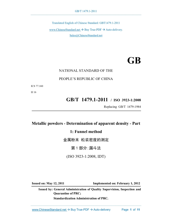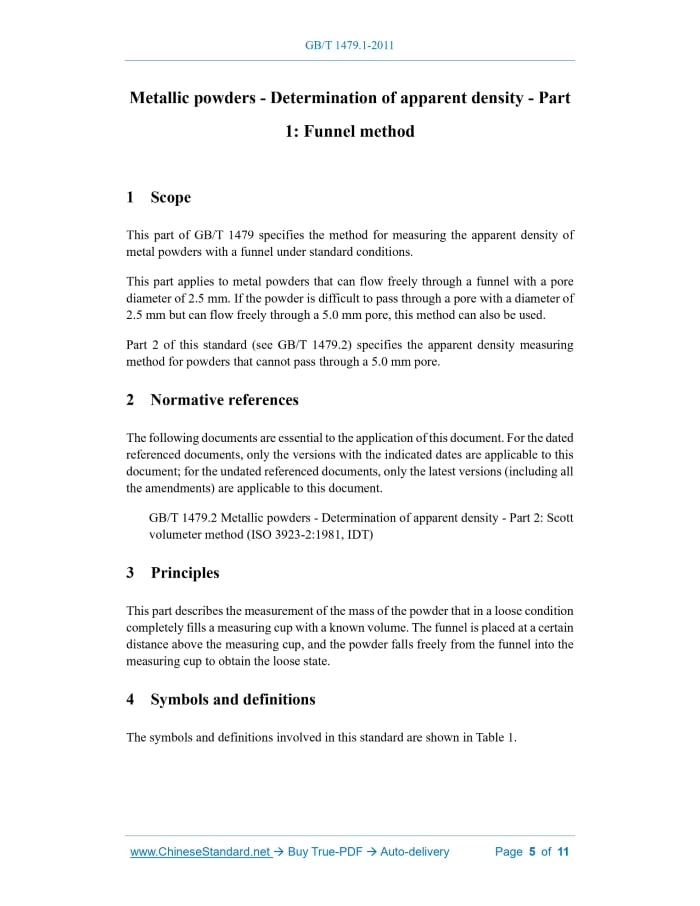 GB/T 1479.1-2011: Metallic powders -- Determination of apparent density -- Part 1: Funnel method Delivery: 9 seconds. True-PDF full-copy in English & invoice will be downloaded + auto-delivered via email. See step-by-step procedure Status: Valid GB/T 1479.1: Historical versions