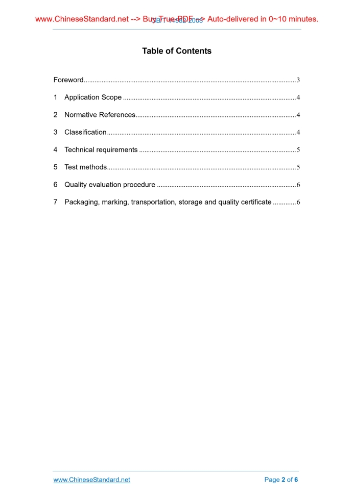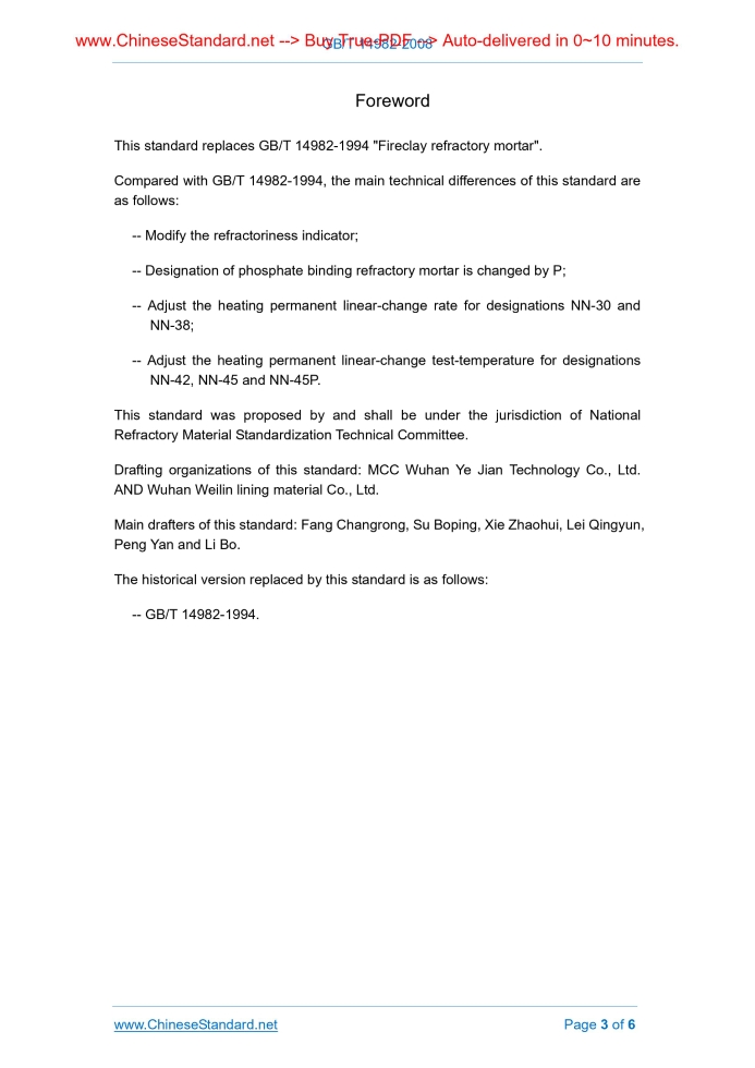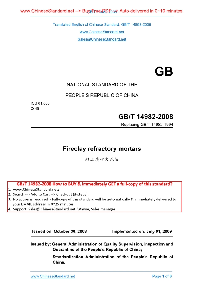 Similar standardsGB/T 14982-2008: Fireclay refractory mortars---This is an excerpt. Full copy of true-PDF in English version (including equations, symbols, images, flow-chart, tables, and figures etc.), auto-downloaded/delivered in 9 seconds, can be purchased online: https://www.ChineseStandard.net/PDF.aspx/GBT14982-2008GB NATIONAL STANDARD OF THE PEOPLE’S REPUBLIC OF CHINA ICS 81.080 Q 46 Replacing GB/T 14982-1994 Fireclay refractory mortars 粘土质耐火泥浆 Issued on: OCTOBER 30, 2008 Implemented on: JULY 01, 2009 Issued by. General Administration of Quality Supervision, Inspection and Quarantine of the People's Republic of China; Standardization Administration of the People's Republic of China. Table of ContentsForeword ... 3 1 Application Scope ... 4 2 Normative References... 4 3 Classification ... 4 4 Technical requirements ... 5 5 Test methods... 5 6 Quality evaluation procedure ... 6 7 Packaging, marking, transportation, storage and quality certificate ... 6ForewordThis standard replaces GB/T 14982-1994 "Fireclay refractory mortar". Compared with GB/T 14982-1994, the main technical differences of this standard are as follows. -- Modify the refractoriness indicator; -- Designation of phosphate binding refractory mortar is changed by P; -- Adjust the heating permanent linear-change rate for designations NN-30 and NN-38; -- Adjust the heating permanent linear-change test-temperature for designations NN-42, NN-45 and NN-45P. This standard was proposed by and shall be under the jurisdiction of National Refractory Material Standardization Technical Committee. Drafting organizations of this standard. MCC Wuhan Ye Jian Technology Co., Ltd. AND Wuhan Weilin lining material Co., Ltd. Main drafters of this standard. Fang Changrong, Su Boping, Xie Zhaohui, Lei Qingyun, Peng Yan and Li Bo. The historical version replaced by this standard is as follows. -- GB/T 14982-1994. Fireclay refractory mortars1 Application ScopeThis standard specifies the fireclay refractory mortar’s classification, technical requirements, test methods, quality evaluation procedures, packaging, marking, transportation, storage and quality certificate. This standard applies to fireclay refractory mortars that are used for fireclay bricks.2 Normative ReferencesThe provisions in following documents become the provisions of this Standard through reference in this Standard. For dated references, the subsequent amendments (excluding corrigendum) or revisions do not apply to this Standard, however, parties who reach an agreement based on this Standard are encouraged to study if the latest versions of these documents are applicable. For undated references, the latest edition of the referenced document applies. GB/T 6900 Chemical analysis of alumina-silica refractories GB/T 7322 Refractory products - Determination of pyrometric cone equivalent (refractoriness) GB/T 15545 Unshaped refractory - Packing, marking, transportation and storage GB/T 17617 Refractory products - Sampling of raw materials and unshaped products GB/T 22459.3 Refractory mortars - Part 3. Determination of joint stability GB/T 22459.4 Refractory mortars - Part 4. Determination of flexural bonding strength GB/T 22459.5 Refractory mortars - Part 5. Determination of grain size distribution (sieve analysis) GB/T 22459.7 Refractory mortars - Part 7. Determination of properties at elevated temperatures3 ClassificationFireclay refractory mortar, according to physiochemical properties, are divided into 5 designations. NN-30, NN-42, NN-45, NN-45P. N and N represent the first letters of6 Quality evaluation procedure6.1 Group-batch 6.1.1 Products are batched according to the same designation in a continuous normal production. When there are changes in raw materials or production processes, then it shall be batched separately. 6.1.2 For the same-designation products, the maximum amount of each batch is 60 tons. 6.2 Sampling Fireclay refractory mortar’s sampling shall be in accordance with the provisions of GB/T 17617. 6.3 Determination rules Refractoriness, room temperature flexural bond strength, load softening temperature are the acceptance test items. When all the inspection results comply with the values specified in Table 1, then this batch of products are deemed as qualified. When the inspection results have failed items, it shall re-sample double-quantity according to 6.2 to conduct re-inspection. If single-value of re-inspection results complies with the provisions in Table 1, then it is determined that this batch of products are qualified; otherwise, it is determined as unqualified batch. 6.4 Form of conformity evaluation Conformity evaluation may adopt declaration by the supplier, verification by the receiving party, or authentication by third party.7 Packaging, marking, transportation, storage and qualitycertificate 7.1 Packaging, marking, transportation and storage shall comply with GB/T 15545. 7.2 The liquid binder may be packaged in plastic drums and delivered separately. 7.3 When delivering the products, the supplier shall provide the quality certificate and the product instruction manual; quality certificate shall indicate the contents such as supplier's name, the name of the demand-side, manufacturing date, contract number, standard number, product name, designation, batch number, physiochemical indicators, and preservation period. ......Source: Above contents are excerpted from the full-copy PDF -- translated/reviewed by: www.ChineseStandard.net / Wayne Zheng et al. Tips & Frequently Asked Questions:Question 1: How long will the true-PDF of English version of GB/T 14982-2008 be delivered?Answer: The full copy PDF of English version of GB/T 14982-2008 can be downloaded in 9 seconds, and it will also be emailed to you in 9 seconds (double mechanisms to ensure the delivery reliably), with PDF-invoice.Question 2: Can I share the purchased PDF of GB/T 14982-2008_English with my colleagues?Answer: Yes. The purchased PDF of GB/T 14982-2008_English will