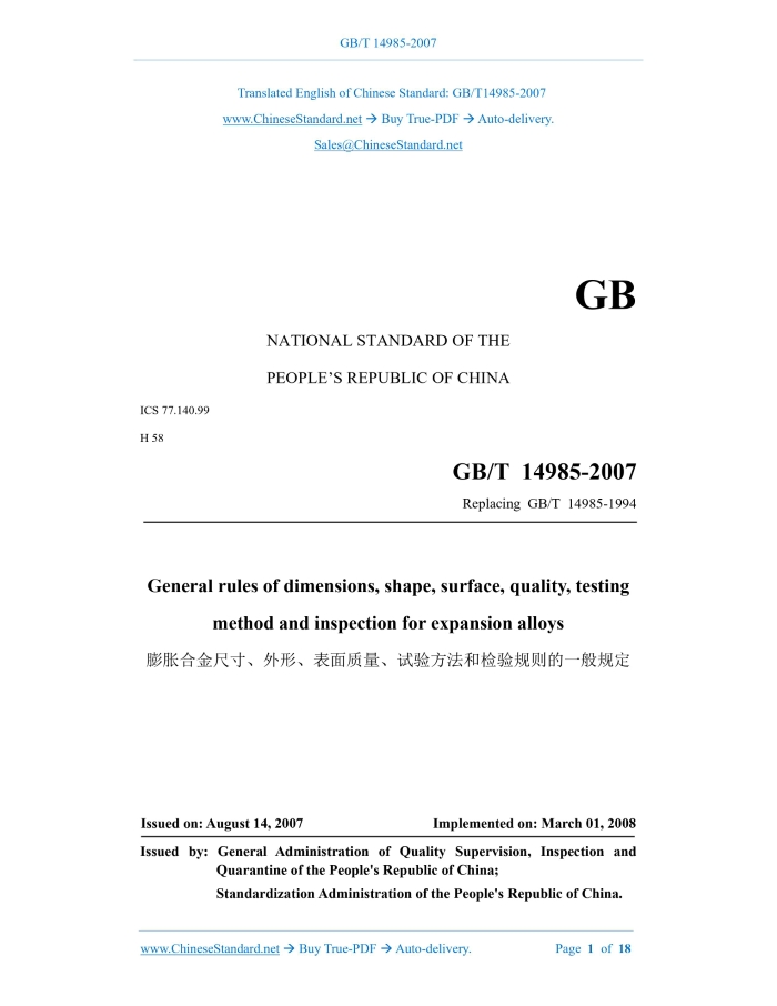 GB/T 14985-2007: General rules of dimensions, shape, surface, quality, testing method and inspection for expansion alloys Delivery: 9 seconds. True-PDF full-copy in English & invoice will be downloaded + auto-delivered via email. See step-by-step procedure Status: Valid GB/T 14985: Historical versions