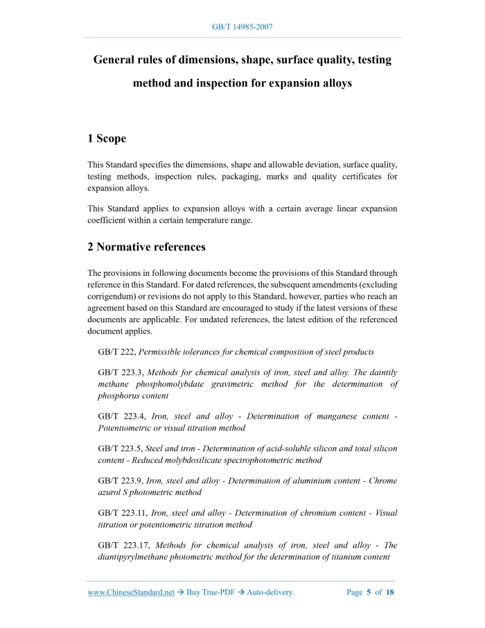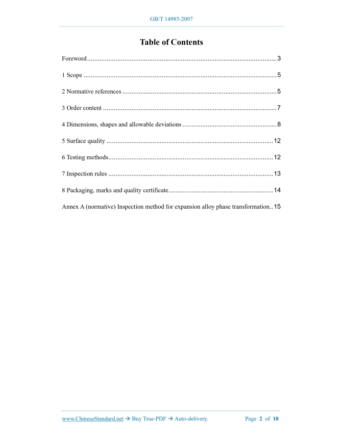 Similar standardsGB/T 14985-2007: General rules of dimensions, shape, surface, quality, testing method and inspection for expansion alloys---This is an excerpt. Full copy of true-PDF in English version (including equations, symbols, images, flow-chart, tables, and figures etc.), auto-downloaded/delivered in 9 seconds, can be purchased online: https://www.ChineseStandard.net/PDF.aspx/GBT14985-2007 GB NATIONAL STANDARD OF THE PEOPLE’S REPUBLIC OF CHINA ICS 77.140.99 H 58 Replacing GB/T 14985-1994 General rules of dimensions, shape, surface, quality, testing method and inspection for expansion alloys Issued on. AUGUST 14, 2007 Implemented on. MARCH 01, 2008 Issued by. General Administration of Quality Supervision, Inspection and Quarantine of the People's Republic of China; Standardization Administration of the People's Republic of China. Table of ContentsForeword... 3 1 Scope... 5 2 Normative references... 5 3 Order content... 7 4 Dimensions, shapes and allowable deviations... 8 5 Surface quality... 12 6 Testing methods... 12 7 Inspection rules... 13 8 Packaging, marks and quality certificate... 14 Annex A (normative) Inspection method for expansion alloy phase transformation.. 15ForewordThis Standard replaces GB/T 14985-1994 "General rules of dimensions, shape, surface quality, test method and inspection for expansion alloys". Compared with GB/T 14985-1994, the main changes in this Standard are as follows. - Add "Normative references" and "Order content"; - Revise the allowable deviation for dimension and shape regulations of cold-drawn (pulled) wire to directly refer to the relevant content in GB/T 342; - Revise the provisions of "higher precision and ordinary precision" in the allowable deviation of cold rolled strip thickness dimensions in GB/T 14985-1994 to that it shall be carried out according to the provisions of width ≥ 150 mm and width ≤ 150 mm. Modify the original negative deviation to positive and negative deviation; - Revise the allowable deviation for dimension and shape regulations of cold drawn and polished rods to directly refer to the relevant content in GB/T 3207; - Revise the allowable deviation for dimension of hot forged materials to directly refer to the relevant content in GB/T 908.For the 20 mm ~ < 50 mm hot forged materials not included in GB/T 908, it is revised to "the allowable diameter deviation of 20 mm ~ < 50 mm hot forged materials is +1.5 mm, -0.5 mm"; For the allowable deviation of the diameter of the hot forged material ≥50 mm, the accuracy requirements in Table 2 of GB/T 908 shall be directly quoted; - Revise the allowable deviation for dimension and shape regulations of hot rolled bars to directly refer to the relevant content in GB/T 702; - Delete the words "peeling, burrs, etc. that affect the use" from the surface quality in GB/T 14985-1994; - In Table 4, add the note "The air tightness test shall be carried out by the buyer. The thickness of the specimen to be tested shall be specified in the contract, otherwise the test shall be carried out according to the specimen grade A specified in GB/T 5778 "; - In Chapter 7, add the content "if the size, shape and surface quality are unqualified, it is a substandard product"; - Add " 8 Packaging, marks and quality certificate". Annex A of this Standard is normative. This Standard was proposed by China Iron and Steel Association. This Standard shall be under the jurisdiction of National Technical Committee of Standardization Administration of China. The drafting organizations of this Standard. Shaanxi Precision Alloy Co., Ltd., Shanghai Iron and Steel Research Institute. Main drafters of this Standard. Zhang Ailing, Liu Yongqing. Versions of standard substituted by this document are. GBn100-1981, GBn100-1987, GB/T 14985-1994. General rules of dimensions, shape, surface quality, testing method and inspection for expansion alloys1 ScopeThis Standard specifies the dimensions, shape and allowable deviation, surface quality, testing methods, inspection rules, packaging, marks and quality certificates for expansion alloys. This Standard applies to expansion alloys with a certain average linear expansion coefficient within a certain temperature range.2 Normative referencesThe provisions in following documents become the provisions of this Standard through reference in this Standard. For dated references, the subsequent amendments (excluding corrigendum) or revisions do not apply to this Standard, however, parties who reach an agreement based on this Standard are encouraged to study if the latest versions of these documents are applicable. For undated references, the latest edition of the referenced document applies. GB/T 222, Permissible tolerances for chemical composition of steel products GB/T 223.3, Methods for chemical analysis of iron, steel and alloy. The daintily methane phosphomolybdate gravimetric method for the determination of phosphorus content GB/T 223.4, Iron, steel and alloy - Determination of manganese content - Potentiometric or visual titration method GB/T 223.5, Steel and iron - Determination of acid-soluble silicon and total silicon content - Reduced molybdosilicate spectrophotometric method GB/T 223.9, Iron, steel and alloy - Determination of aluminium content - Chrome azurol S photometric method GB/T 223.11, Iron, steel and alloy - Determination of chromium content - Visual titration or potentiometric titration method GB/T 223.17, Methods for chemical analysis of iron, steel and alloy - The diantipyrylmethane photometric method for the determination of titanium content GB/T 223.18, Methods for chemical analysis of iron steel and alloy - The sodium thiosulfate separation iodometric method for the determination of copper content GB/T 223.20, Methods for chemical analysis of iron steel and alloy - The Potentiometric titration method for the determination of cobalt content3 Order contentThe contract or order for ordering according to this Standard shall include the followings.4 Dimensions,