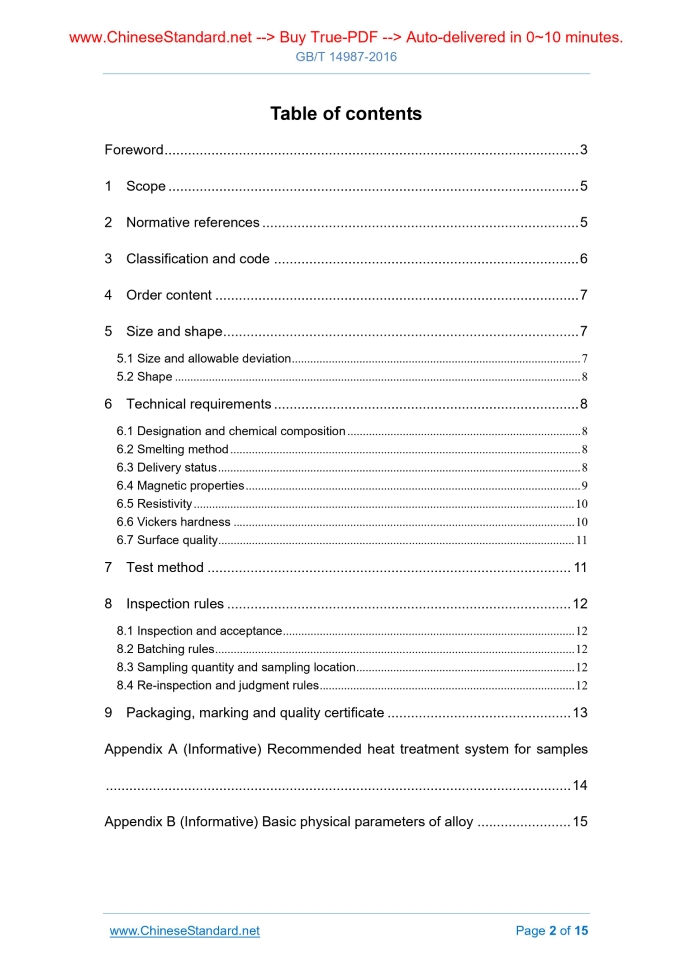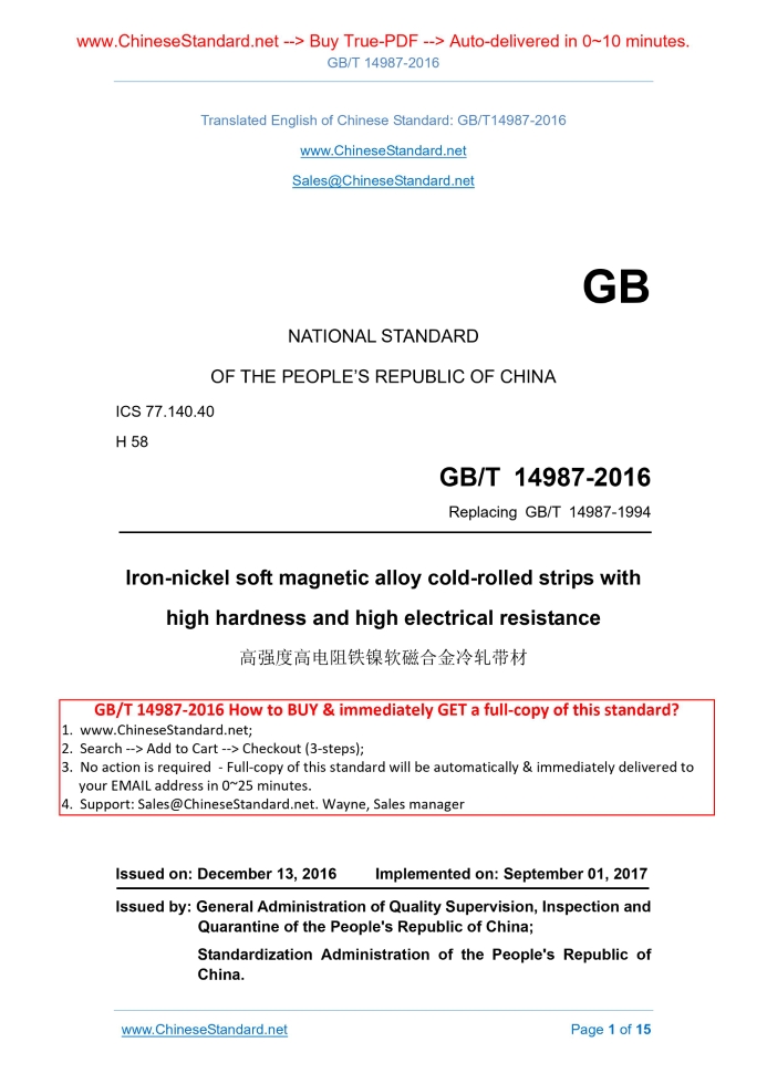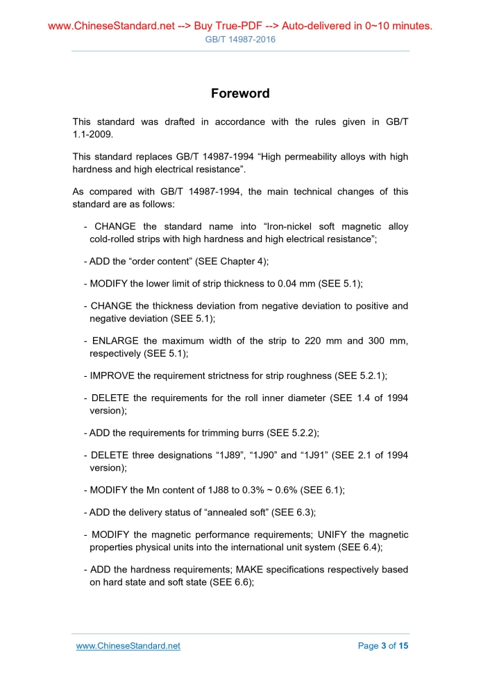 Similar standardsGB/T 14987-2016: Iron-nickel soft magnetic alloy cold-rolled strips with high hardness and high electrical resistance---This is an excerpt. Full copy of true-PDF in English version (including equations, symbols, images, flow-chart, tables, and figures etc.), auto-downloaded/delivered in 9 seconds, can be purchased online: https://www.ChineseStandard.net/PDF.aspx/GBT14987-2016 GB NATIONAL STANDARD OF THE PEOPLE’S REPUBLIC OF CHINA ICS 77.140.40 H 58 Replacing GB/T 14987-1994 Iron-nickel soft magnetic alloy cold-rolled strips with high hardness and high electrical resistance Issued on: DECEMBER 13, 2016 Implemented on: SEPTEMBER 01, 2017 Issued by. General Administration of Quality Supervision, Inspection and Quarantine of the People's Republic of China; Standardization Administration of the People's Republic of China. Table of ContentsForeword ... 3 1 Scope ... 5 2 Normative references ... 5 3 Classification and code ... 6 4 Order content ... 7 5 Size and shape ... 7 5.1 Size and allowable deviation ... 7 5.2 Shape ... 8 6 Technical requirements ... 8 6.1 Designation and chemical composition ... 8 6.2 Smelting method ... 8 6.3 Delivery status ... 8 6.4 Magnetic properties ... 9 6.5 Resistivity ... 10 6.6 Vickers hardness ... 10 6.7 Surface quality ... 11 7 Test method ... 11 8 Inspection rules ... 12 8.1 Inspection and acceptance ... 12 8.2 Batching rules ... 12 8.3 Sampling quantity and sampling location ... 12 8.4 Re-inspection and judgment rules ... 12 9 Packaging, marking and quality certificate ... 13 Appendix A (Informative) Recommended heat treatment system for samples ... 14 Appendix B (Informative) Basic physical parameters of alloy ... 15ForewordThis standard was drafted in accordance with the rules given in GB/T 1.1-2009. This standard replaces GB/T 14987-1994 “High permeability alloys with high hardness and high electrical resistance”. As compared with GB/T 14987-1994, the main technical changes of this standard are as follows. - CHANGE the standard name into “Iron-nickel soft magnetic alloy cold-rolled strips with high hardness and high electrical resistance”; - ADD the “order content” (SEE Chapter 4); - MODIFY the lower limit of strip thickness to 0.04 mm (SEE 5.1); - CHANGE the thickness deviation from negative deviation to positive and negative deviation (SEE 5.1); - ENLARGE the maximum width of the strip to 220 mm and 300 mm, respectively (SEE 5.1); - IMPROVE the requirement strictness for strip roughness (SEE 5.2.1); - DELETE the requirements for the roll inner diameter (SEE 1.4 of 1994 version); - ADD the requirements for trimming burrs (SEE 5.2.2); - DELETE three designations “1J89”, “1J90” and “1J91” (SEE 2.1 of 1994 version); - MODIFY the Mn content of 1J88 to 0.3% ~ 0.6% (SEE 6.1); - ADD the delivery status of “annealed soft” (SEE 6.3); - MODIFY the magnetic performance requirements; UNIFY the magnetic properties physical units into the international unit system (SEE 6.4); - ADD the hardness requirements; MAKE specifications respectively based on hard state and soft state (SEE 6.6); Iron-nickel soft magnetic alloy cold-rolled strips with high hardness and high electrical resistance1 ScopeThis standard specifies the classification and code, order content, size, shape, technical requirements, test methods, inspection rules, packaging, marking and quality certificate of 1J87 and 1J88 iron-nickel soft magnetic alloys. This standard applies to the 1J87, 1J88 alloy cold rolled strip used to produce magnetic components with abrasion resistance (hereinafter referred to as alloy strip), such as. audio head sensor chip, ATM machine head, currency detector head, special transformers, and sensors components and so on.2 Normative referencesThe following documents are essential to the application of this document. For the dated documents, only the versions with the dates indicated are applicable to this document; for the undated documents, only the latest version (including all the amendments) are applicable to this Standard. GB/T 223.5 Methods for chemical analysis of iron, steel and alloy - The reduced molybdosilicate spectrophotometric method for the determination of acid-soluble silicon content GB/T 223.25 Methods for chemical analysis of iron, steel and alloy - The dimethyglyoxime gravimetric method for the determination of nickel content GB/T 223.28 Methods for chemical analysis of iron, steel and alloy - The α-benzoin oxime gravimetric method for the determination of molybdenum content GB/T 223.38 Methods for chemical analysis of iron, steel and alloy - Ion exchange separation-gravimetric method for the determination of niobium content GB/T 223.59 Iron and steel alloys - Determination of phosphorus content - Bismuth phosphomolybdate blue spectrophotometric method and antimony phosphomolybdate blue spectrophotometric method GB/T 223.63 Methods for chemical analysis of iron, steel and alloy - The sodium periodate (potassium) spectrophotometric method for the determination of manganese content GB/T 223.79 Iron and steel - Determination of multi-element contents - X-ray fluorescence spectrometry (routine method) GB/T 223.85 Steel and iron - Determination of sulfur content - Infrared absorption method after combustion in an induction furnace GB/T 223.86 Steel and iron - Determination of total carbon content - Infrared absorption method after combustion in an induction furnace GB/T 3658 Methods of measurement of AC magnetic properties of magnetically soft materials GB/T 4340.1 Metallic materials - Vickers hardness test - Part 1. Test method GB/T 6146 Test method for resistivity of precision resistive alloys GB/T 13012 Methods of measurement of DC magnetic properties of magnetically soft materials GB/T 20066 Steel and iron - Sampling and preparation of samples for the determination of chemical composition GB/T 20123 Steel and iron - Determination of total carbon and sulfur content - Infrared absorption method after combustion in an 