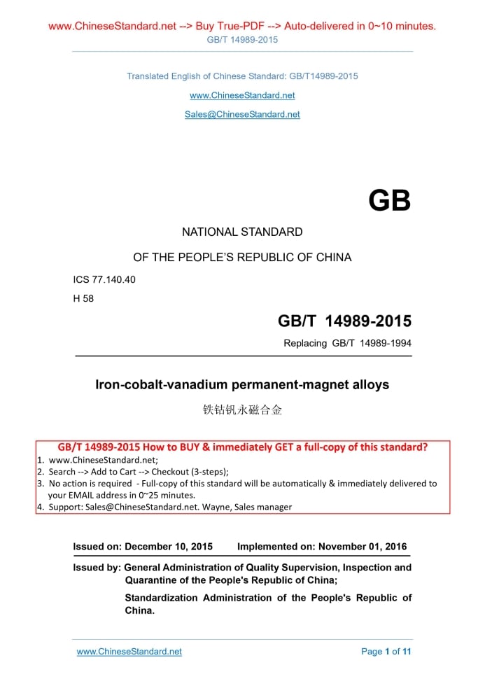 GB/T 14989-2015: Iron-cobalt-vanadium permanent-magnet alloys Delivery: 9 seconds. True-PDF full-copy in English & invoice will be downloaded + auto-delivered via email. See step-by-step procedure Status: Valid GB/T 14989: Historical versions
