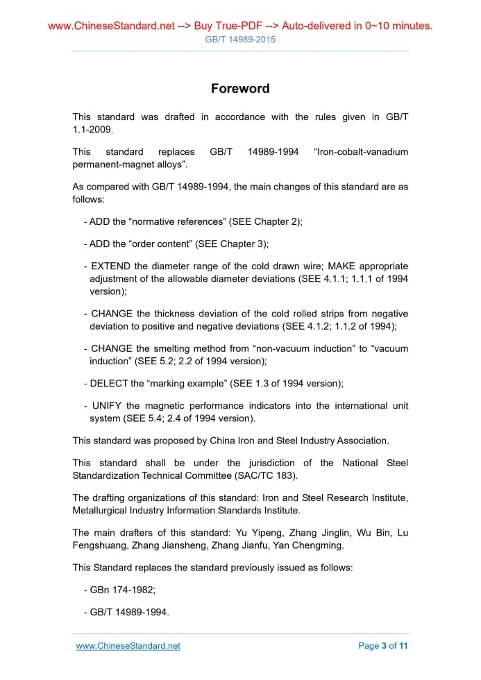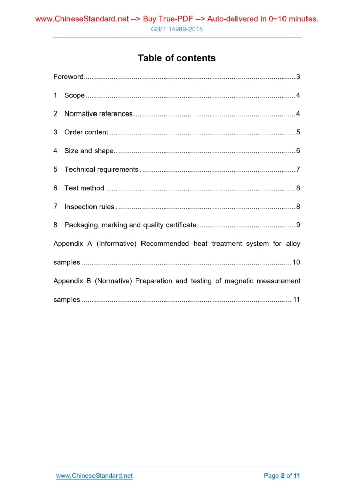 Similar standardsGB/T 14989-2015: Iron-cobalt-vanadium permanent-magnet alloys---This is an excerpt. Full copy of true-PDF in English version (including equations, symbols, images, flow-chart, tables, and figures etc.), auto-downloaded/delivered in 9 seconds, can be purchased online: https://www.ChineseStandard.net/PDF.aspx/GBT14989-2015GB NATIONAL STANDARD ICS 77.140.40 H 58 Replacing GB/T 14989-1994 Iron-cobalt-vanadium permanent-magnet alloys Issued on: DECEMBER 10, 2015 Implemented on: NOVEMBER 01, 2016 Issued by. General Administration of Quality Supervision, Inspection and Quarantine of the People's Republic of China; Standardization Administration of the People's Republic of China. Table of ContentsForeword... 3 1 Scope... 4 2 Normative references... 4 3 Order content... 5 4 Size and shape... 6 5 Technical requirements... 7 6 Test method... 8 7 Inspection rules... 8 8 Packaging, marking and quality certificate... 9 Appendix A (Informative) Recommended heat treatment system for alloy samples... 10 Appendix B (Normative) Preparation and testing of magnetic measurement samples... 11ForewordThis standard was drafted in accordance with the rules given in GB/T 1.1-2009. This standard replaces GB/T 14989-1994 “Iron-cobalt-vanadium permanent-magnet alloys”. As compared with GB/T 14989-1994, the main changes of this standard are as follows. - ADD the “normative references” (SEE Chapter 2); - ADD the “order content” (SEE Chapter 3); - EXTEND the diameter range of the cold drawn wire; MAKE appropriate adjustment of the allowable diameter deviations (SEE 4.1.1; 1.1.1 of 1994 version); - CHANGE the thickness deviation of the cold rolled strips from negative deviation to positive and negative deviations (SEE 4.1.2; 1.1.2 of 1994); - CHANGE the smelting method from “non-vacuum induction” to “vacuum induction” (SEE 5.2; 2.2 of 1994 version); - DELECT the “marking example” (SEE 1.3 of 1994 version); - UNIFY the magnetic performance indicators into the international unit system (SEE 5.4; 2.4 of 1994 version). This standard was proposed by China Iron and Steel Industry Association. This standard shall be under the jurisdiction of the National Steel Standardization Technical Committee (SAC/TC 183). The drafting organizations of this standard. Iron and Steel Research Institute, Metallurgical Industry Information Standards Institute. The main drafters of this standard. Yu Yipeng, Zhang Jinglin, Wu Bin, Lu Fengshuang, Zhang Jiansheng, Zhang Jianfu, Yan Chengming. This Standard replaces the standard previously issued as follows. - GBn 174-1982; - GB/T 14989-1994. GB/T 223.68 Methods for chemical analysis of iron, steel and alloy - The combustion potassium iodate volumetric method for the determination of sulfur content GB/T 223.69 Iron, steel, and alloy - Determination of carbon contents - Gas-volumetric method after combustion in the pipe furnace GB/T 11170 Stainless steel - Determination of multi-element contents - Spark discharge atomic emission spectrometric method (routine method) GB/T 13012 Methods of measurement of DC magnetic properties of magnetically soft materials GB/T 20066 Steel and iron - Sampling and preparation of samples for the determination of chemical composition GB/T 20123 Steel and iron - Determination of total carbon and sulfur content - Infrared absorption method after combustion in an induction furnace (routine method) YB/T 5242 General rules of packaging, marking, and quality certification for precision alloys3 Order contentThe contract or order ordered in accordance with this standard shall include the following information. a) This standard number; b) Alloy designation; c) Size; d) Weight or quantity; e) Delivery status; f) Other special requirements made by the purchaser, which shall, after determined by the supplier and the purchaser through negotiation, be indicated in the contract. Inspection and acceptance of alloy materials are conducted by the quality inspection department of the supplier, AND the purchaser may also conduct inspection in accordance with the provisions of this standard. 7.2 Batching rules Alloy material shall be submitted for inspection and acceptance by batches, AND each batch shall be the alloy materials of the same alloy designation, the same melting furnace number, and the same specification. 7.3 Sampling location and sampling quantity The sampling location and the sampling quantity of the alloy shall comply with the requirements of Table 5. 7.4 Re-inspection and judgment rules 7.4.1 When the magnetic properties of the alloy are disqualified, it is allowed to re-take two samples for re-inspection. If the re-inspection result is still disqualified, the batch will not be accepted. However, the supplier may change the heat treatment system AND re-submit it as a new batch for inspection. 7.4.2 If the size, shape and surface quality is disqualified, the single coil will be judged as disqualified.8 Packaging, marking and quality certificate8.1 The packaging, marking and quality certificate of the alloy materials shall comply with the requirements of YB/T 5242. 8.2 With the agreement between the supplier and the purchaser, the supplier may use other materials that guarantee that the surface quality and magnetic properties of the wire material are not affected in the transport and storage. ......Source: Above contents are excerpted from the full-copy PDF -- translated/reviewed by: www.ChineseStandard.net / Wayne Zheng et al. Tips & Frequently Asked Questions:Question 1: How long will the true-PDF of English version of GB/T 14989-2015 be delivered?Answer: The full copy PDF of English version of GB/T 14989-2015 can be downloaded in 9 seconds, and it will also be emailed to you in 9 seconds (double mechanisms to ensure the delivery reliably), with PDF-invoice.Question 2: Can I share the purchased PDF of GB/T 14989-2015_English with my colleagues?Answer: Yes. The purchased PDF of GB/T 14989-2015_English will be deemed to be sold to your e