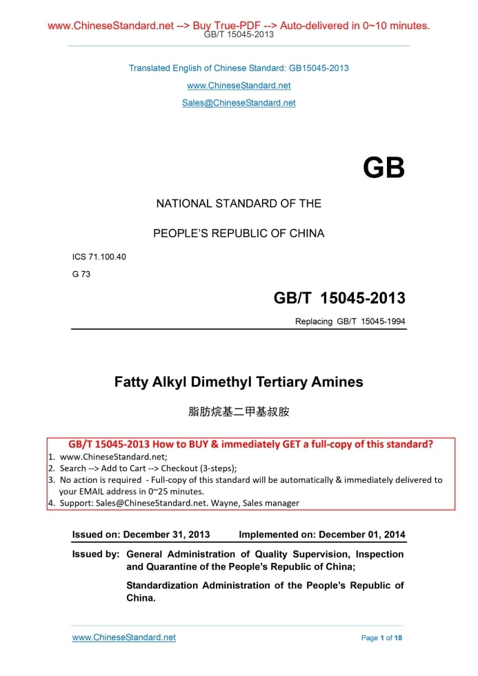 GB/T 15045-2013: Fatty alkyl dimethyl tertiary amines Delivery: 9 seconds. True-PDF full-copy in English & invoice will be downloaded + auto-delivered via email. See step-by-step procedure Status: Valid GB/T 15045: Historical versions